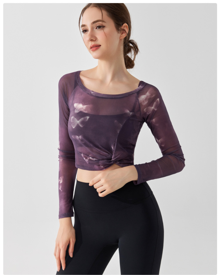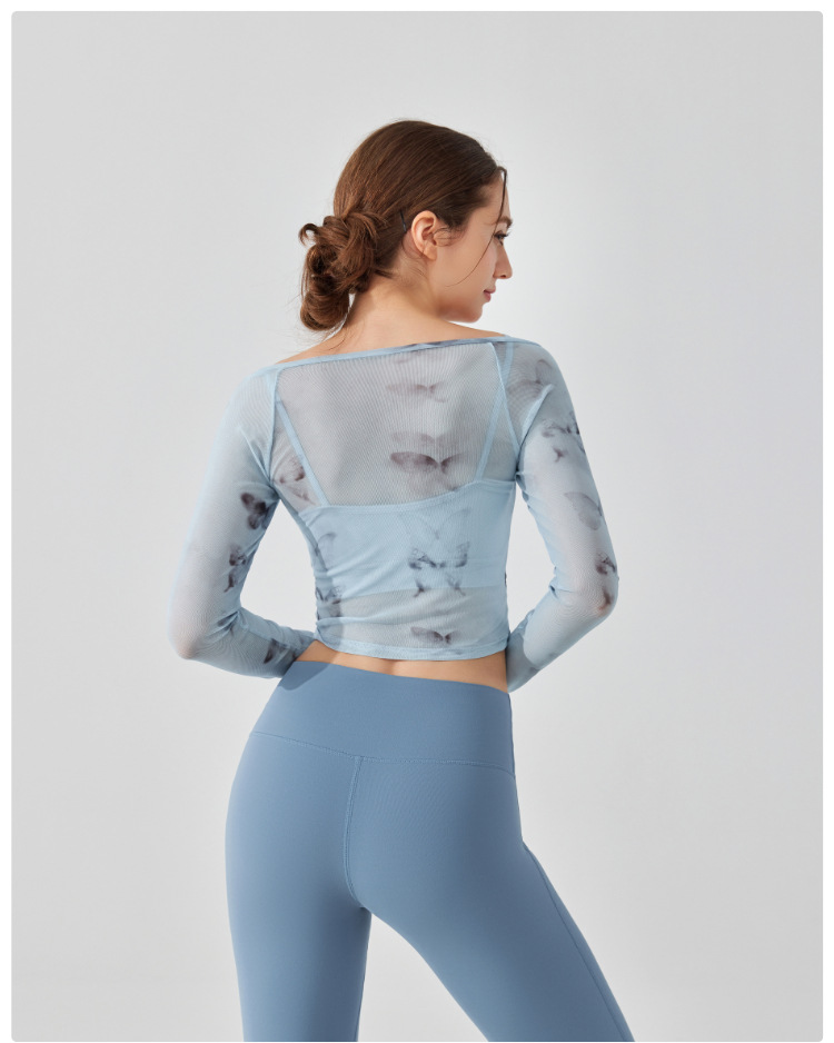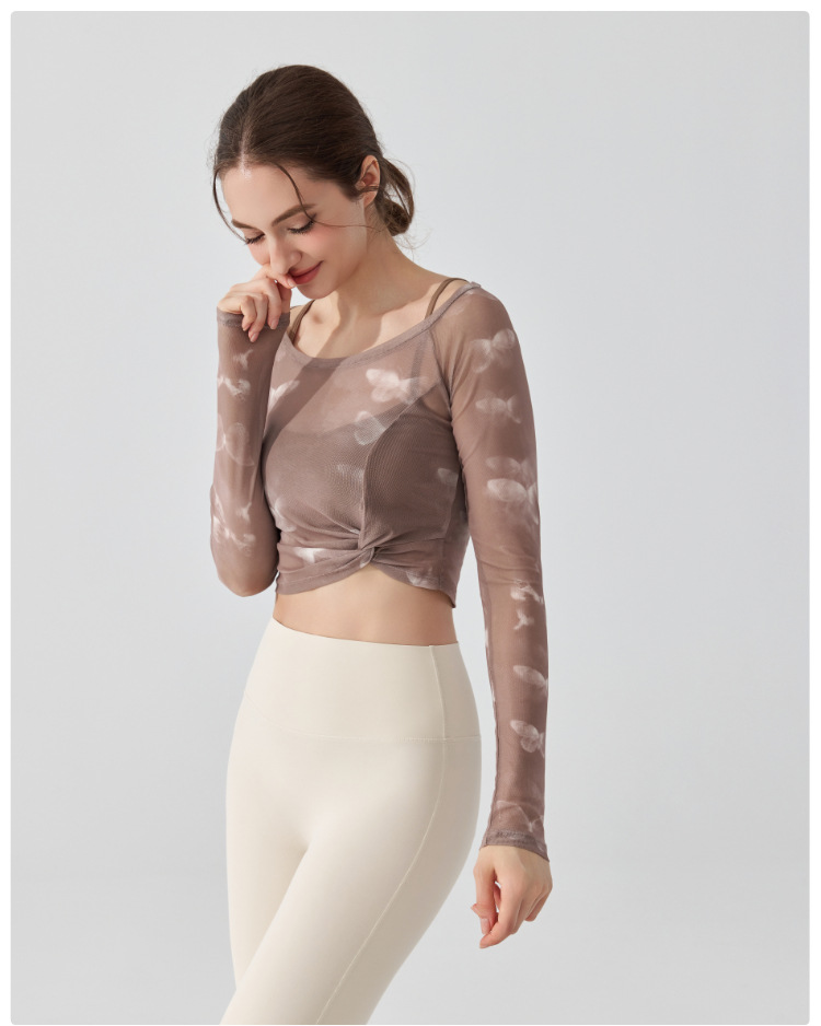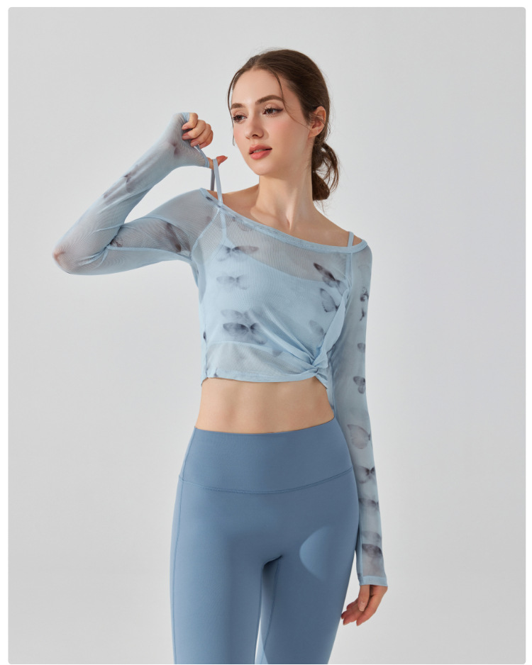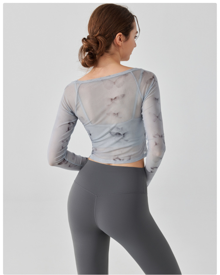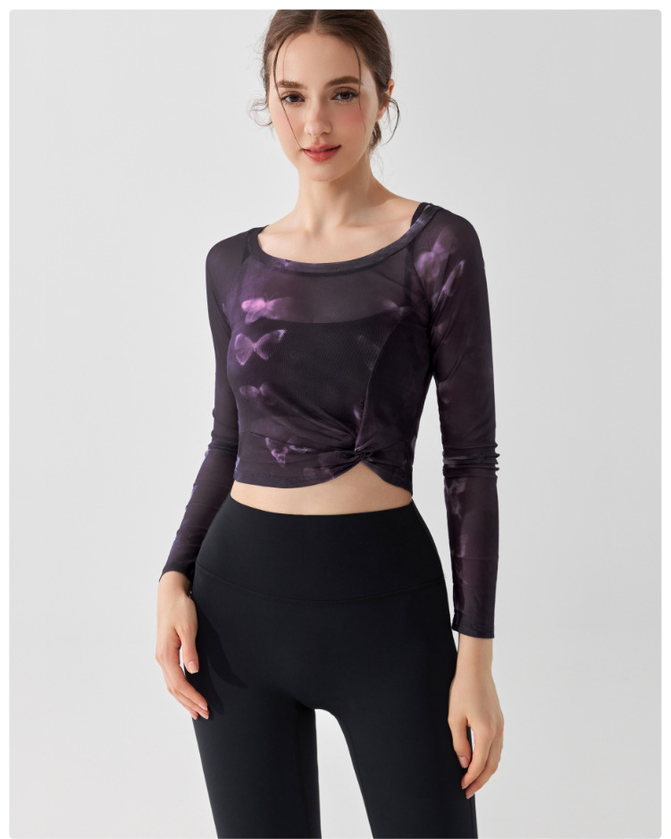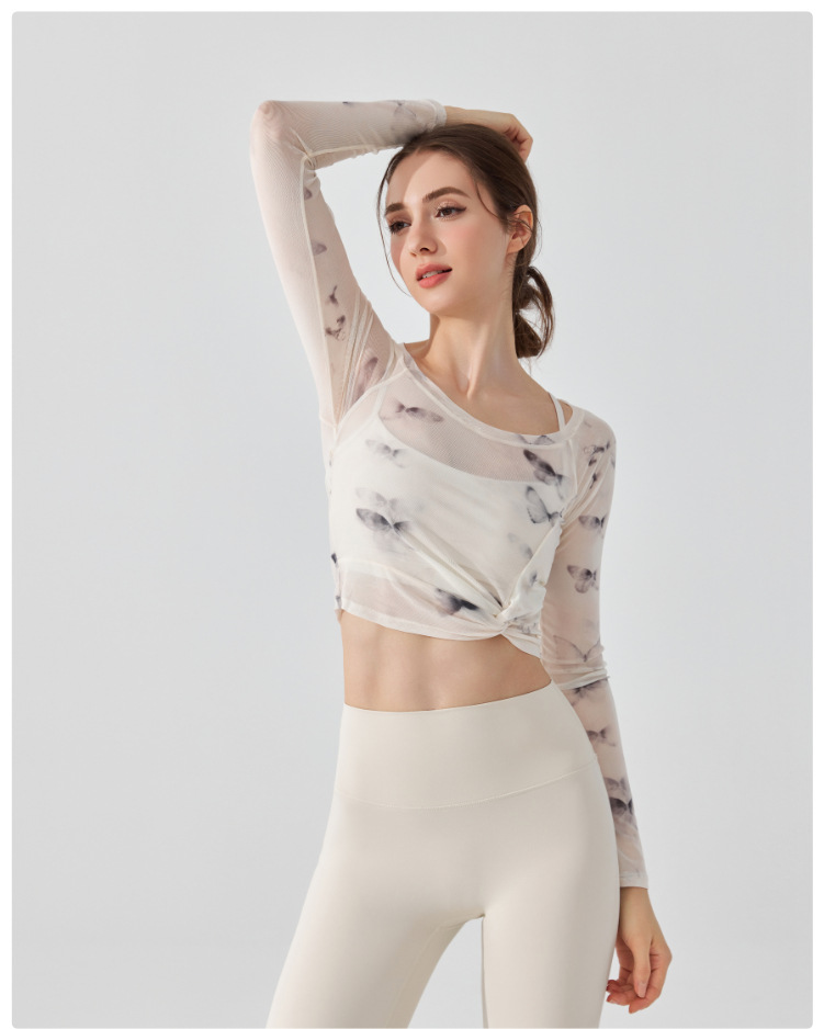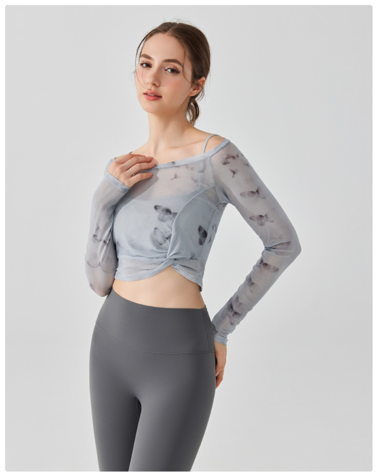 가짜 2 조각 나비 거즈 스포츠 탑 필라테스 요가 세트 긴팔 고정 가슴 패드 빠른 건조 피트니스 블라우스스토어 가기