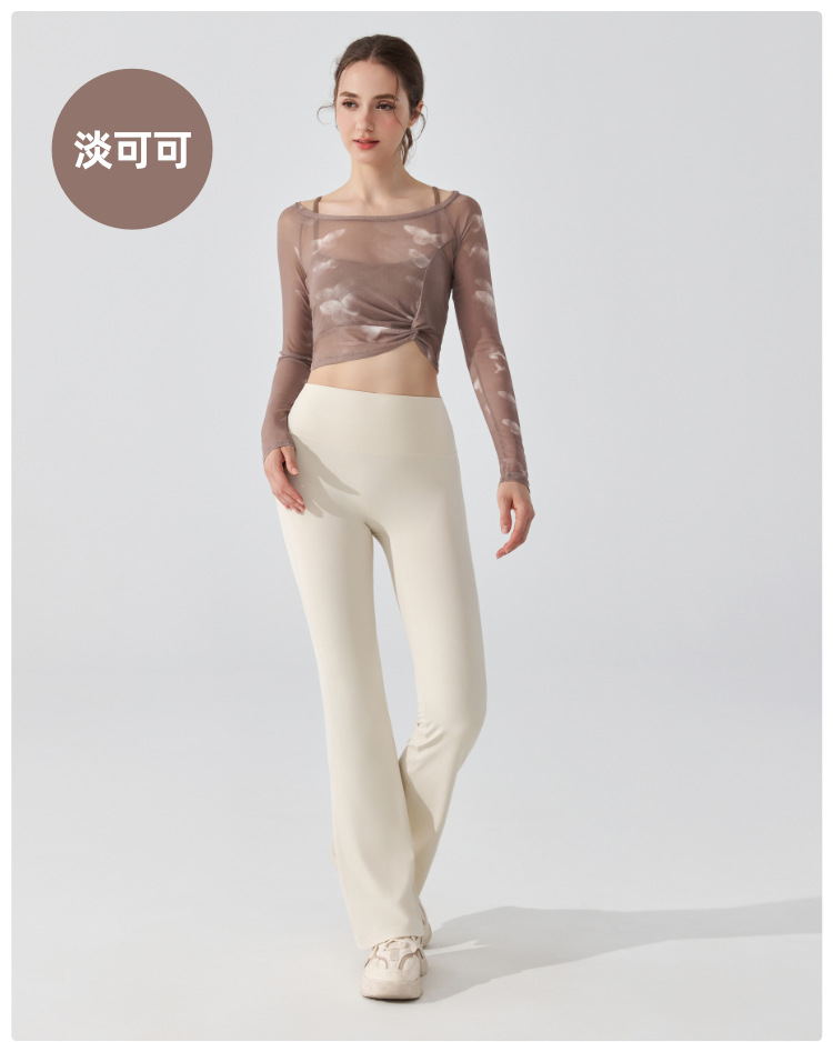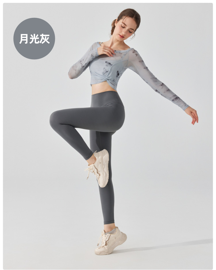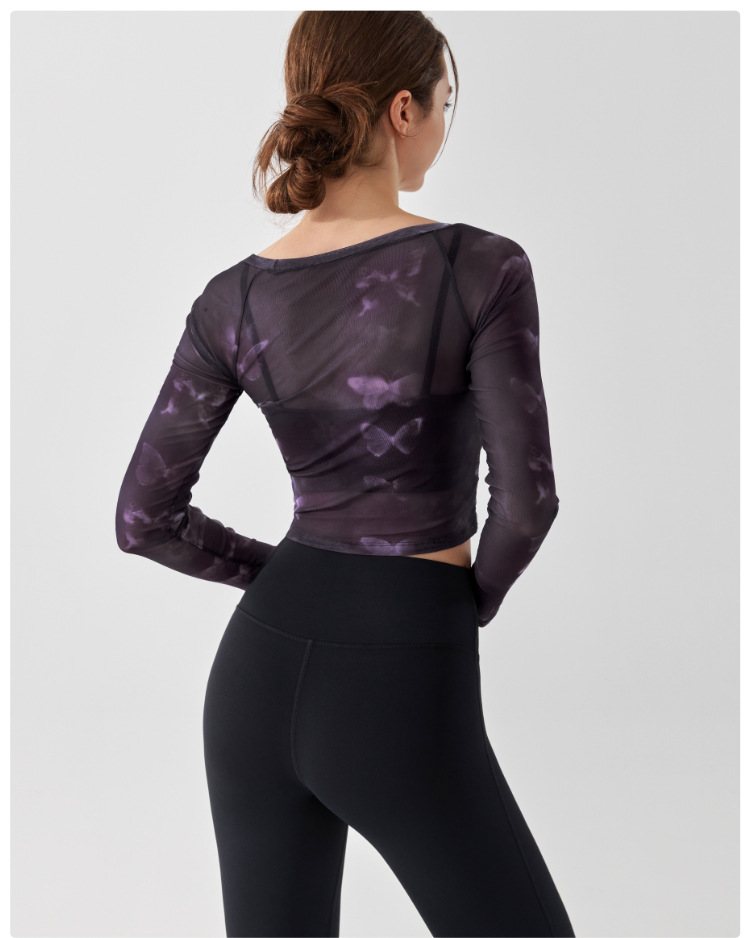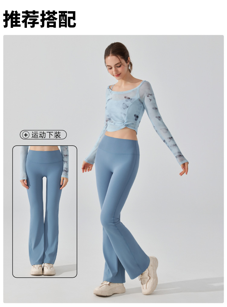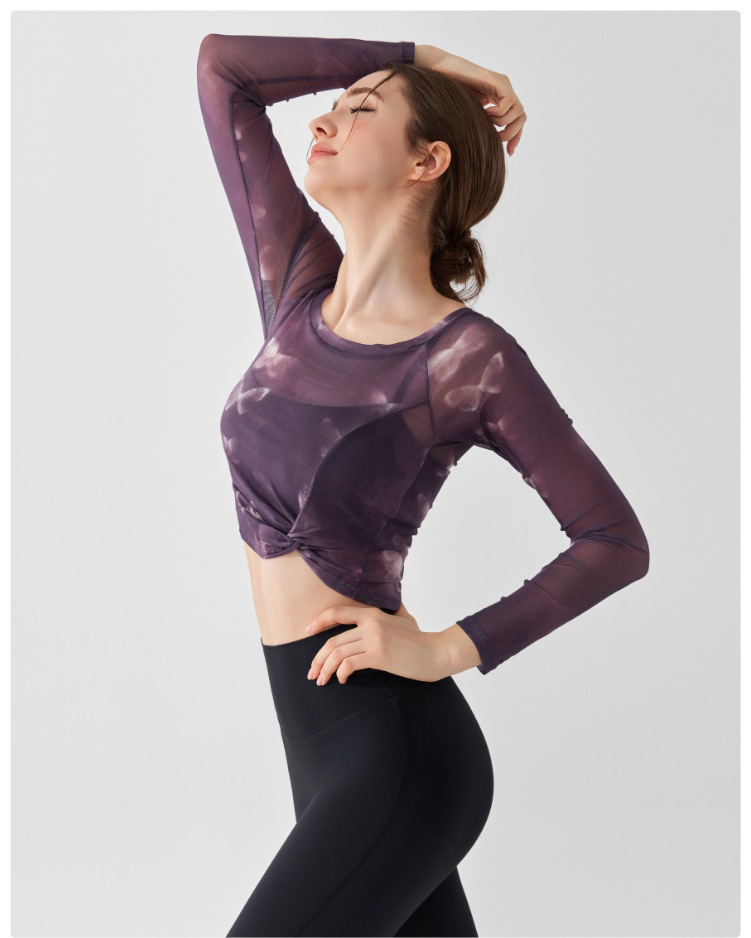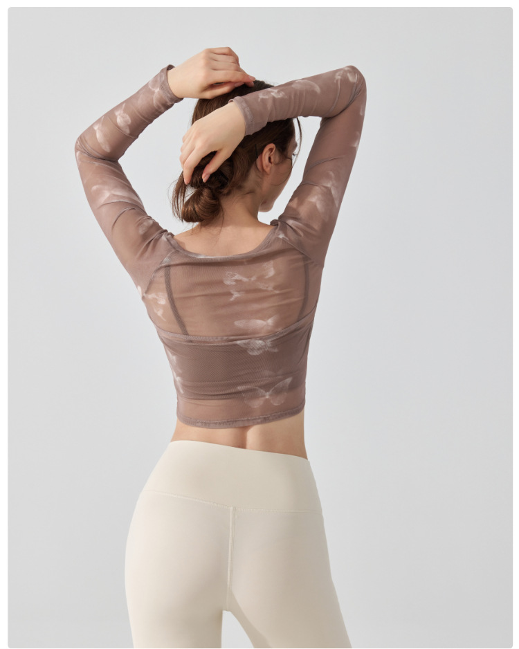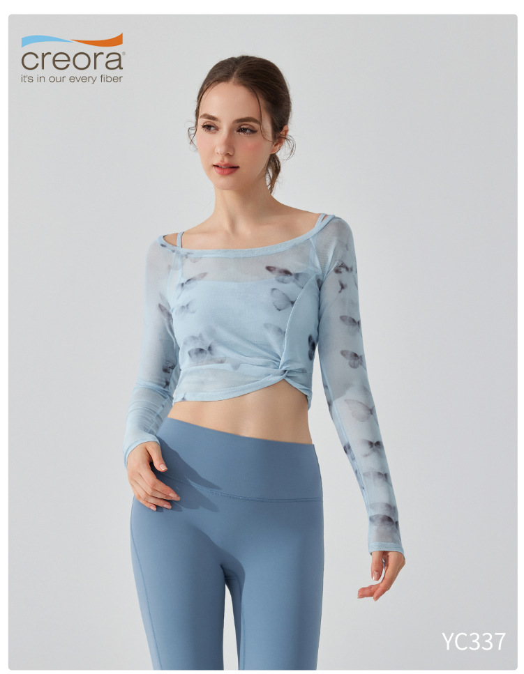가짜 2 조각 나비 거즈 스포츠 탑 필라테스 요가 세트 긴팔 고정 가슴 패드 빠른 건조 피트니스 블라우스스토어 가기