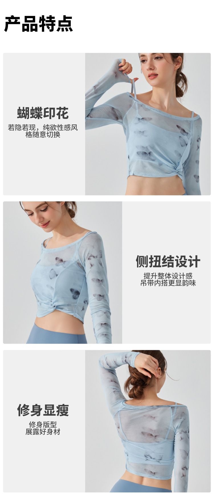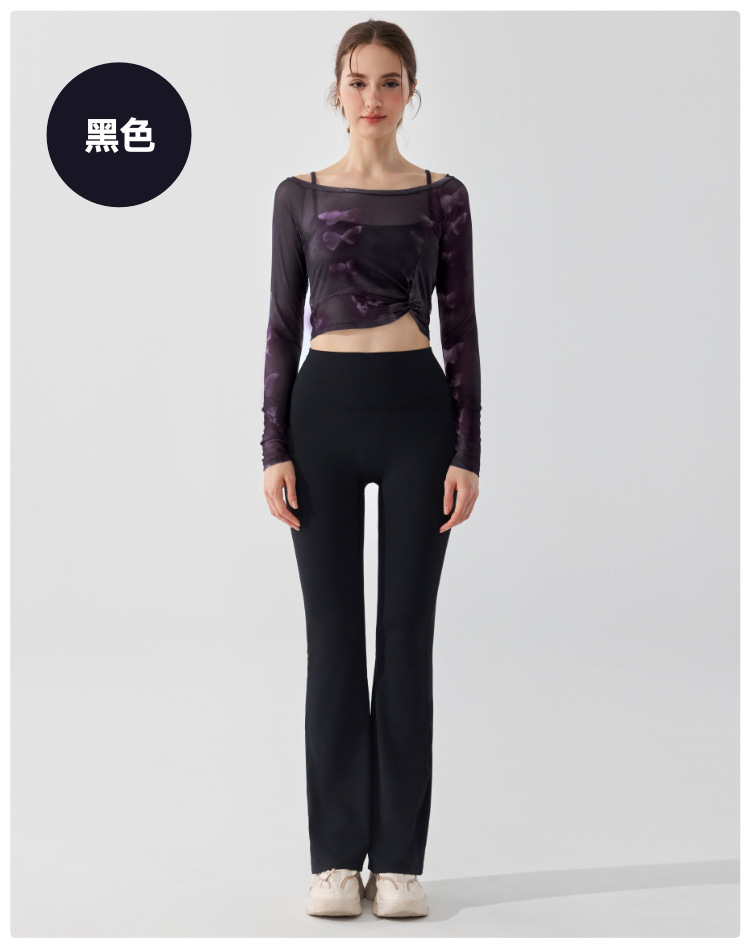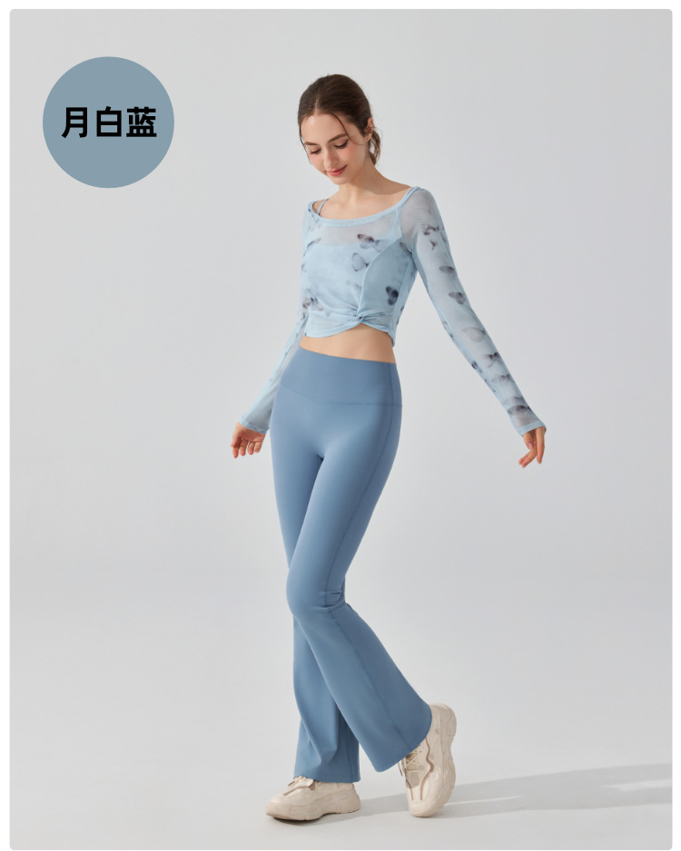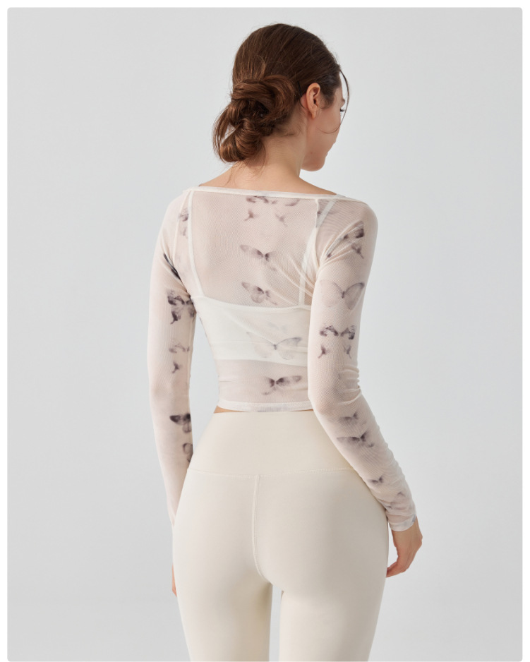 가짜 2 조각 나비 거즈 스포츠 탑 필라테스 요가 세트 긴팔 고정 가슴 패드 빠른 건조 피트니스 블라우스