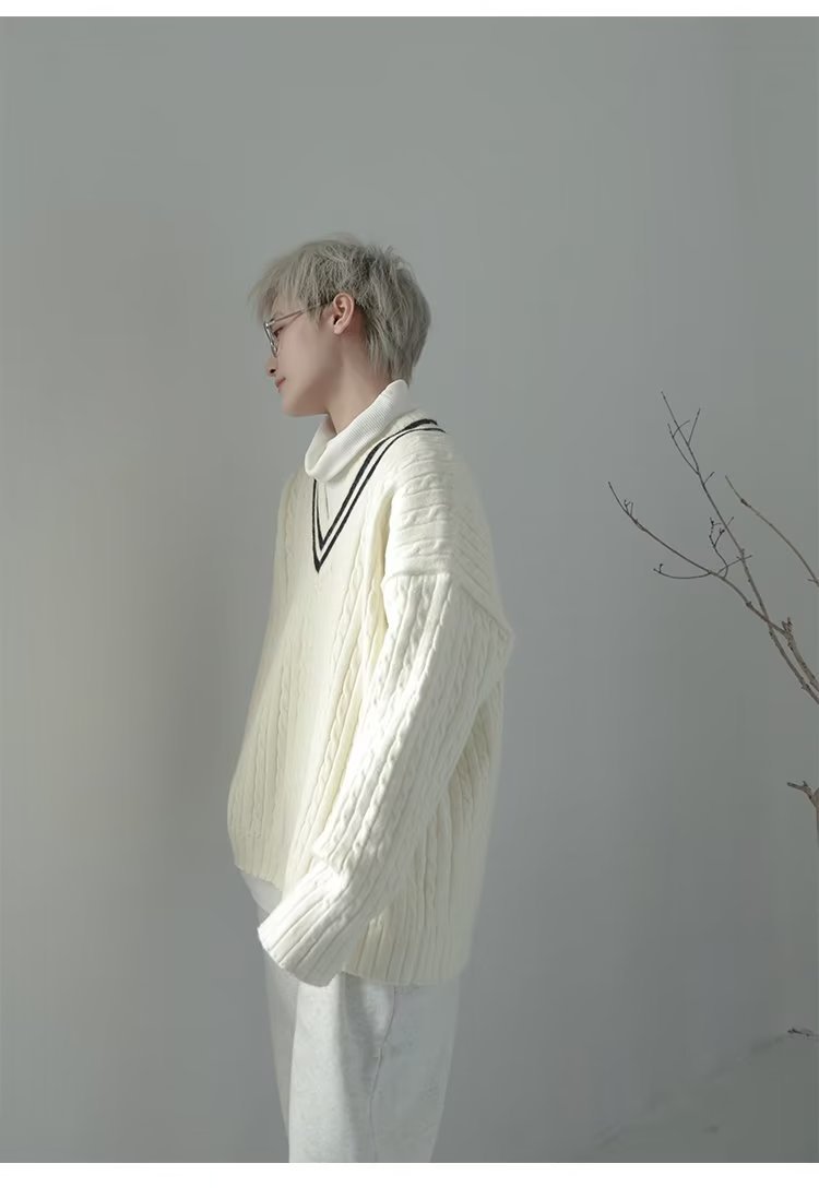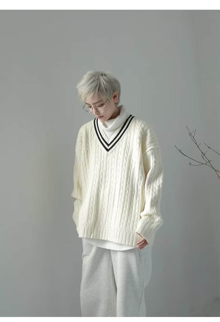 오버 사이즈 일본 대학 스타일 V 넥 트위스트 스웨터 남자 레트로 게으른 스타일 루즈 소프트 왁스 풀오버 스웨터