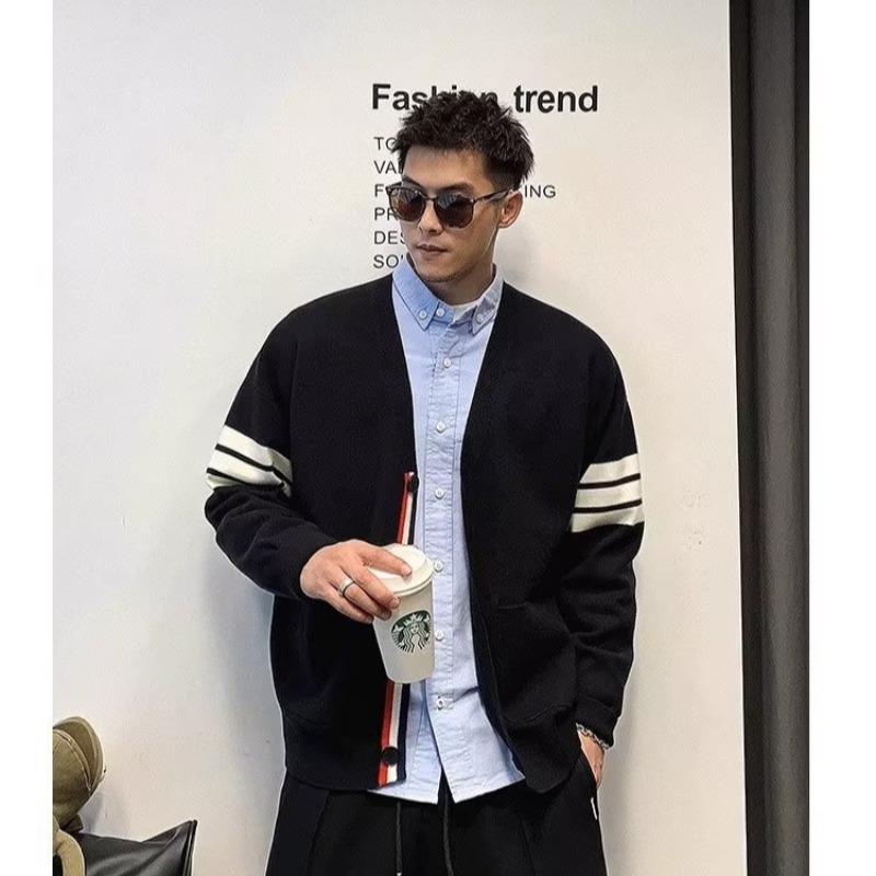 크로스보더 신상 버튼 가디건 니트 스웨터 남성 트렌디 브랜드 삼선 상의 한국 남성복 다용도 캐주얼 아우터스토어 가기