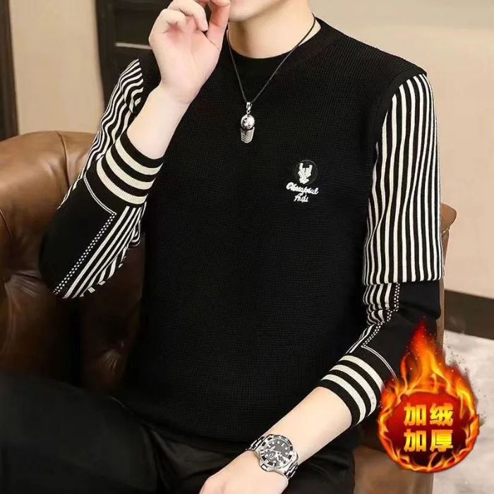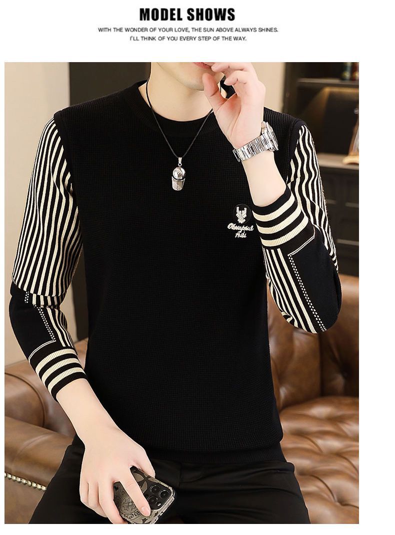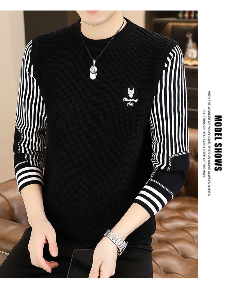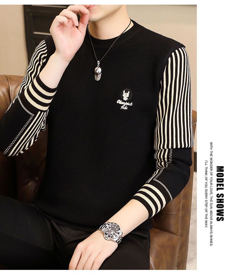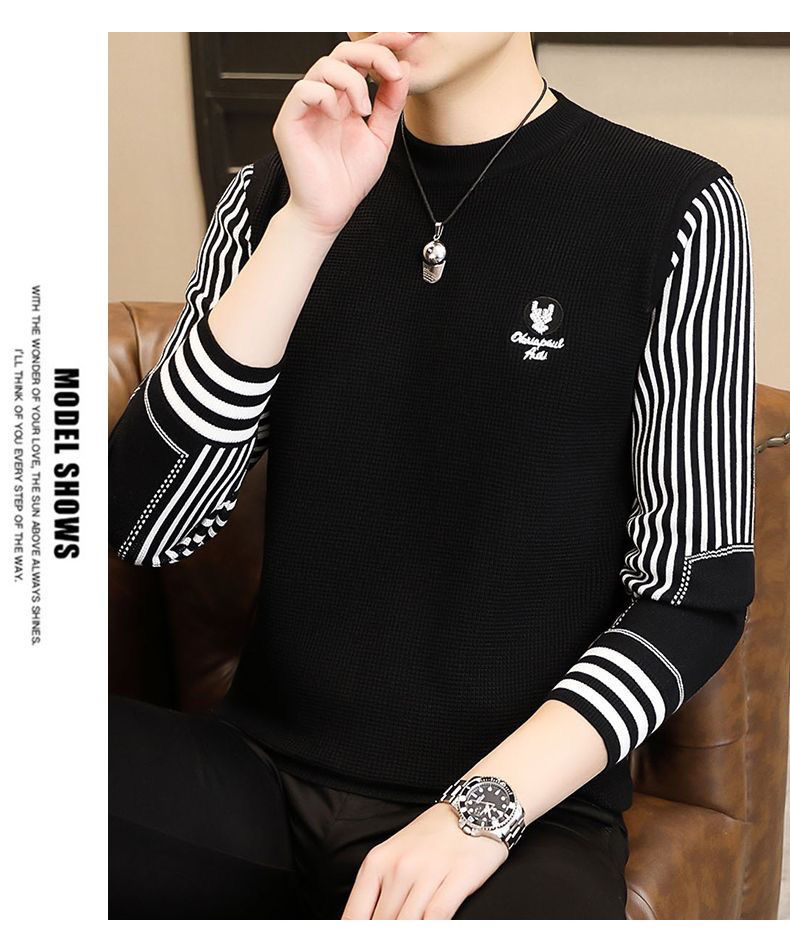 패션 가을과 겨울 줄무늬 패치 워크 전당포 스웨터 겨울 남자 크루 넥 풀오버 니트 긴 소매 두껍게베이스 셔츠