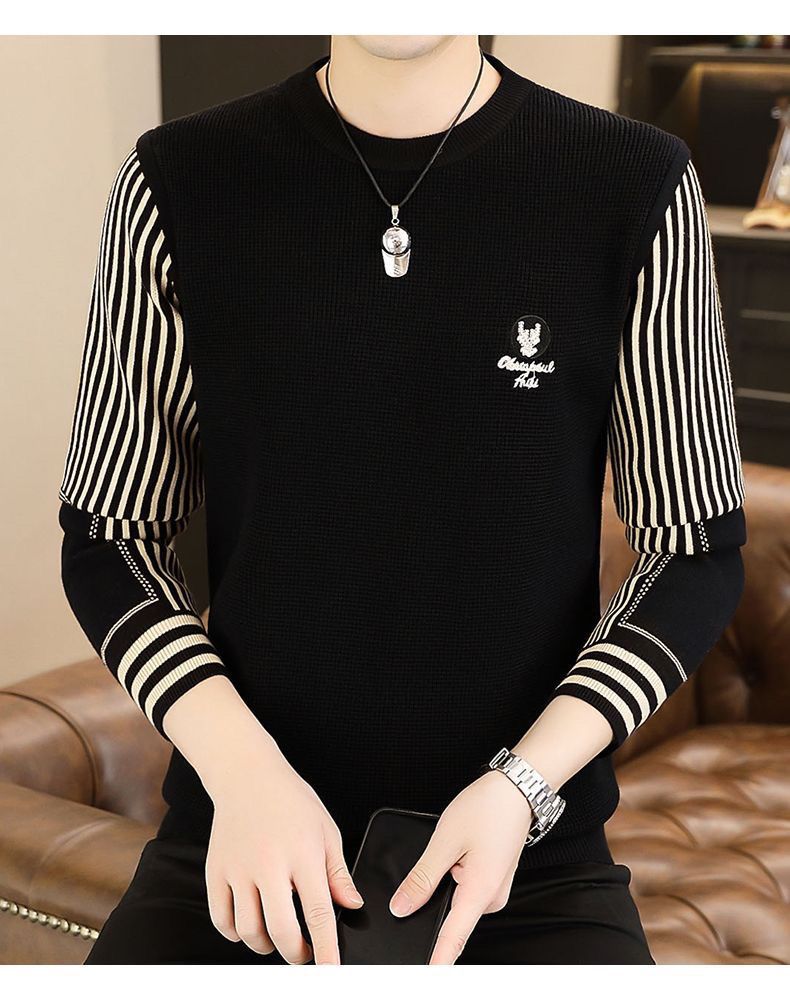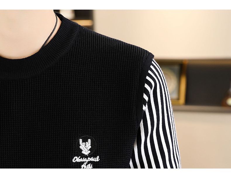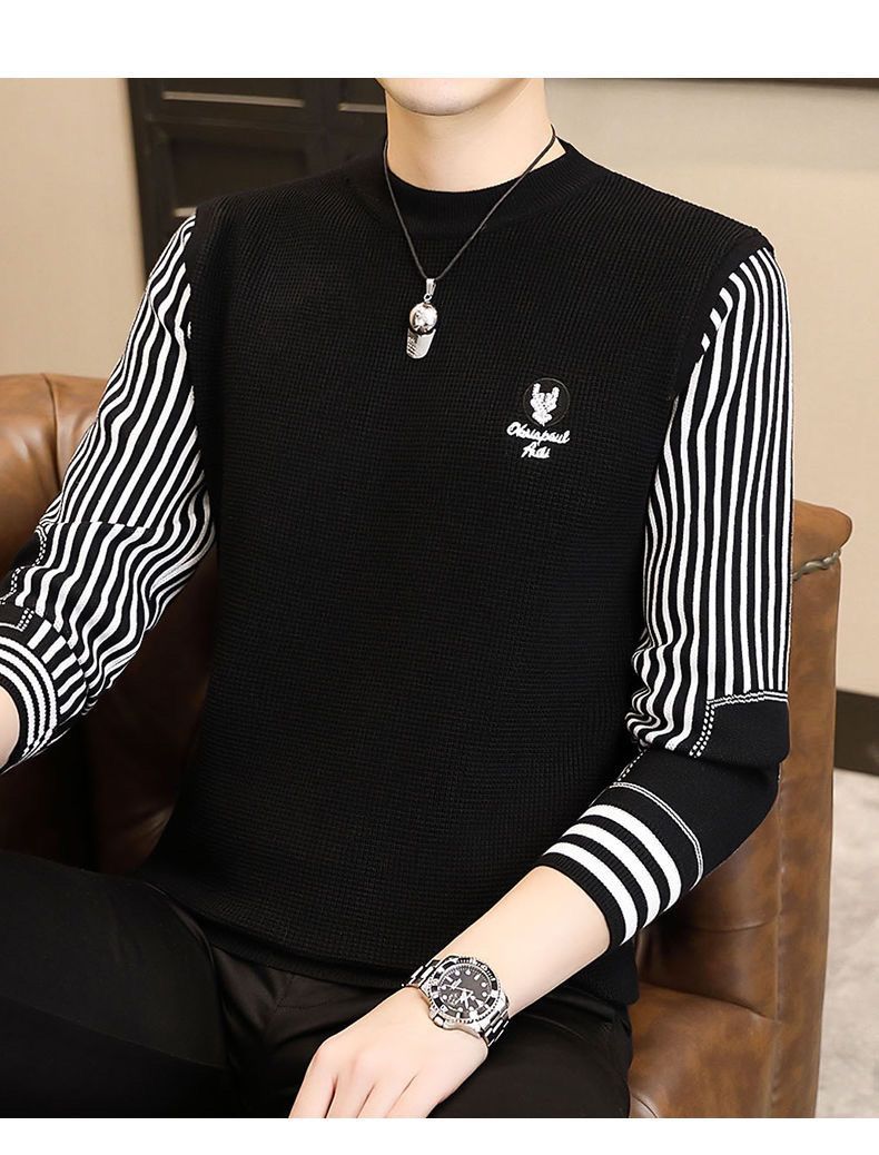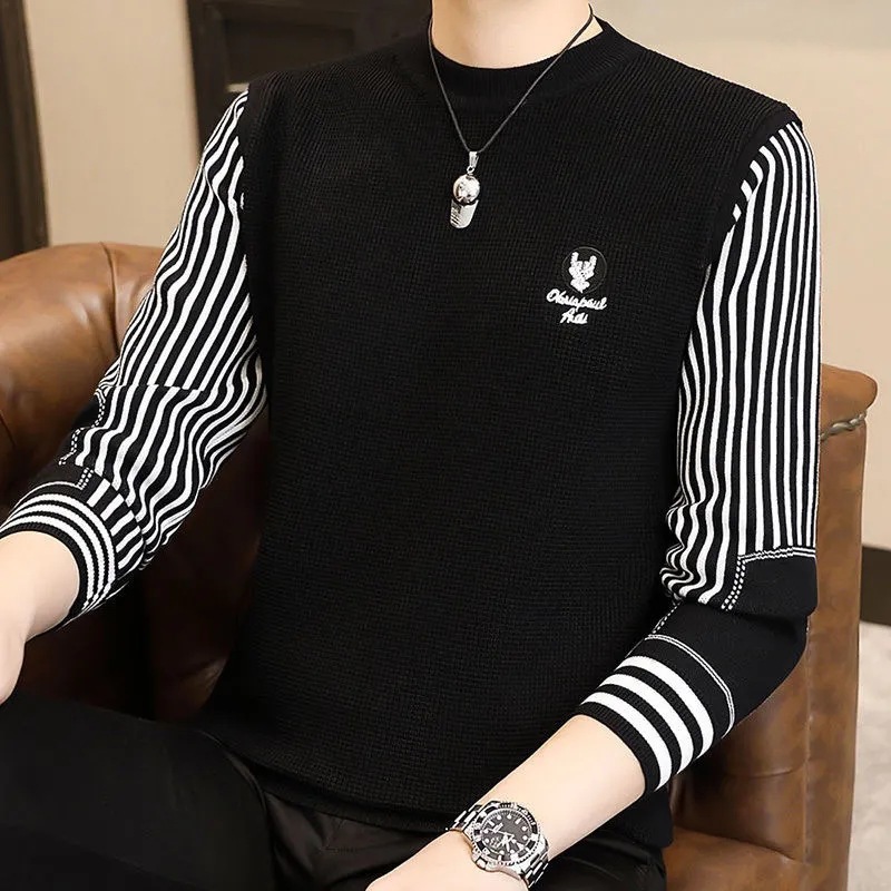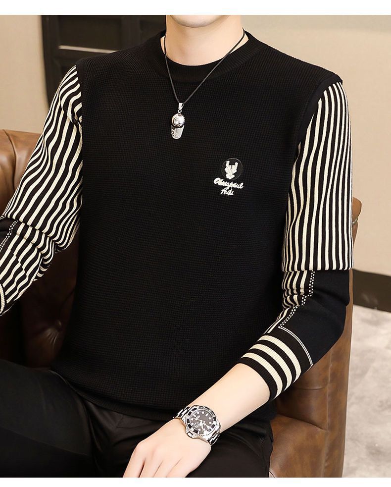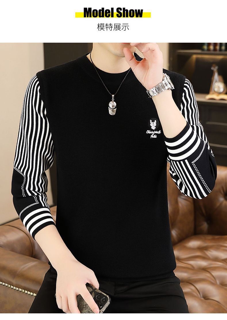 패션 가을과 겨울 줄무늬 패치 워크 전당포 스웨터 겨울 남자 크루 넥 풀오버 니트 긴 소매 두껍게베이스 셔츠