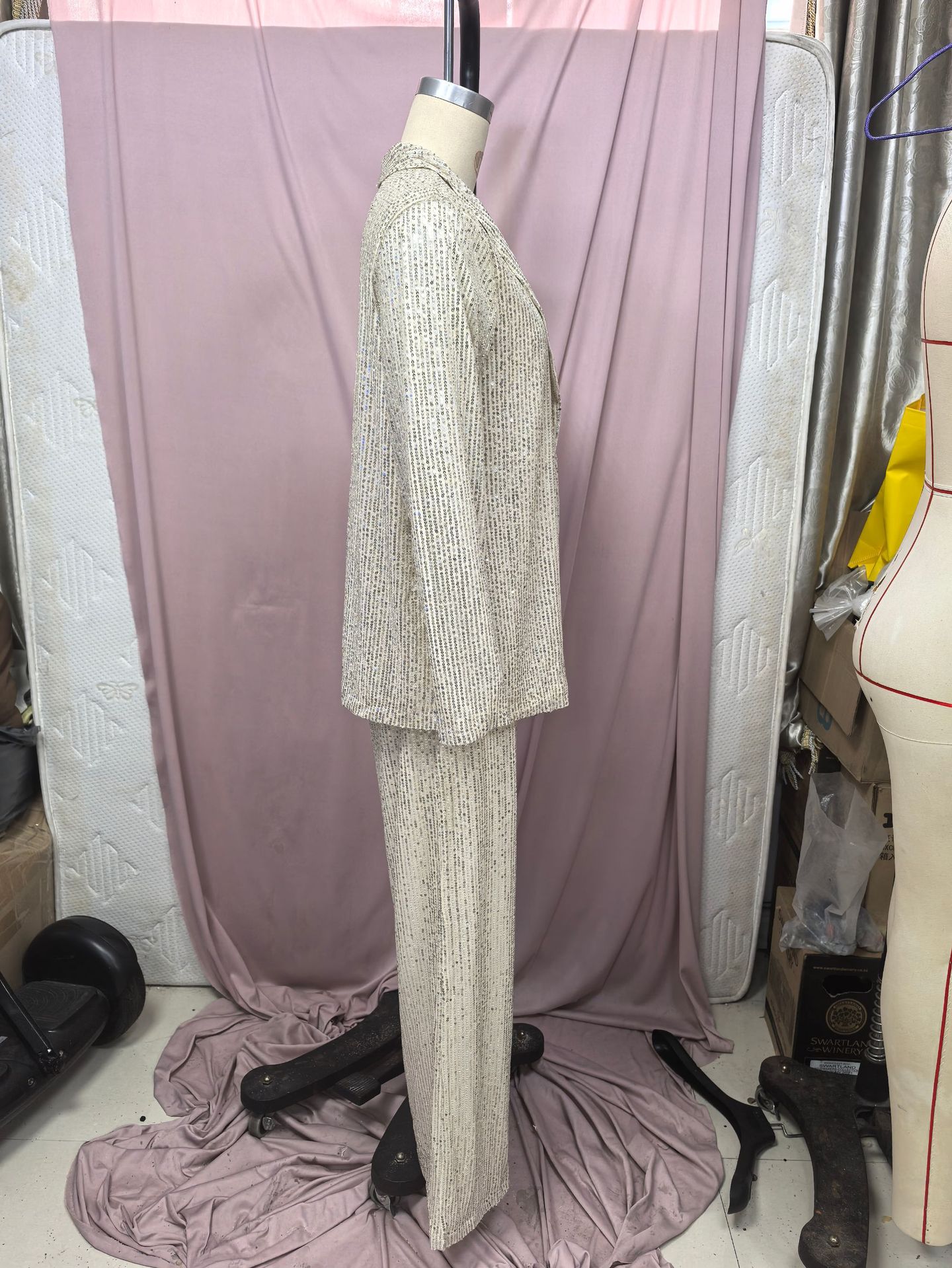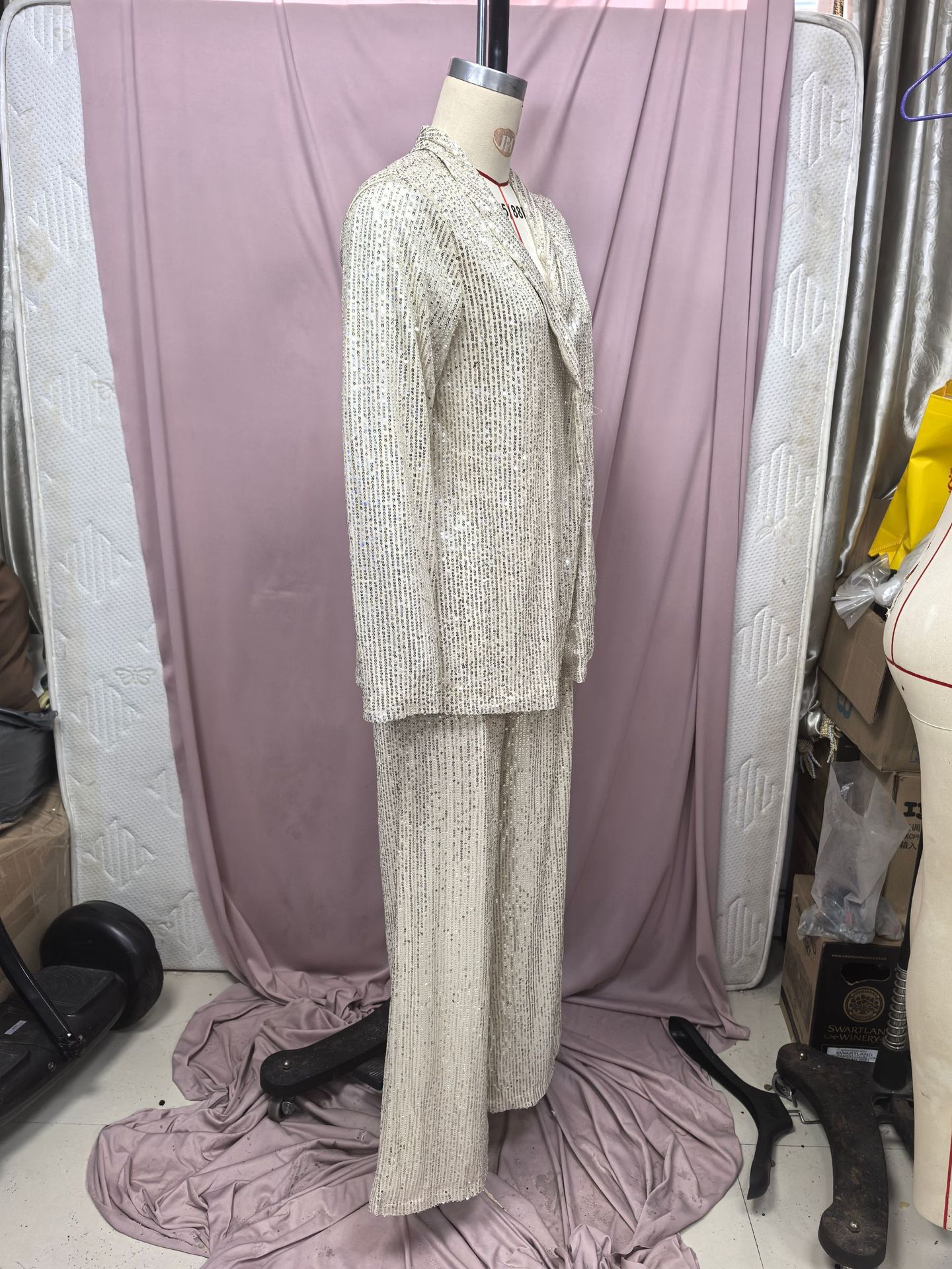 2025 봄 새로운 국경 유럽과 미국의 3 색 스팽글 작은 정장 하이 웨이스트 패션 캐주얼 바지 투피스 슈트스토어 가기