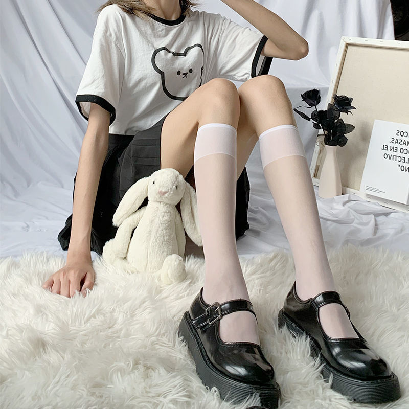 白丝蝴蝶结日系中长筒袜jk黑丝袜女夏季白色蕾丝薄款丝袜过膝袜