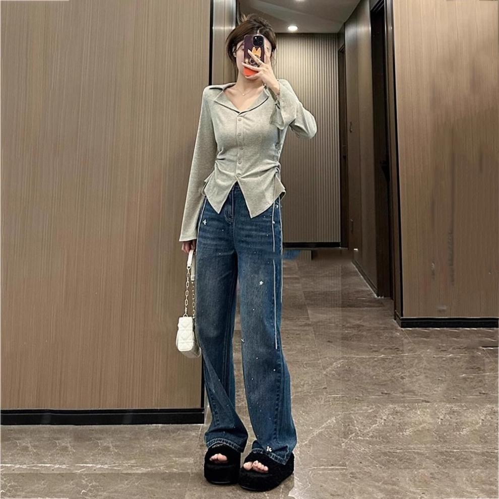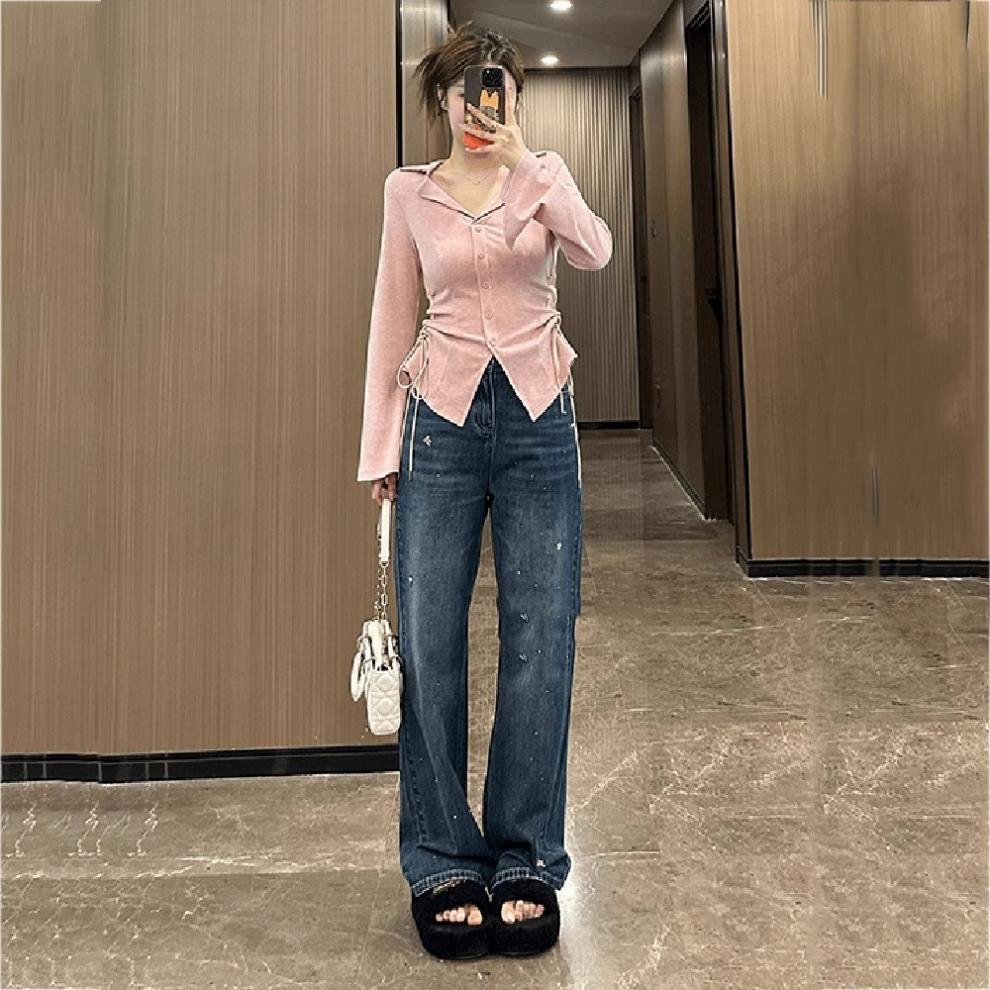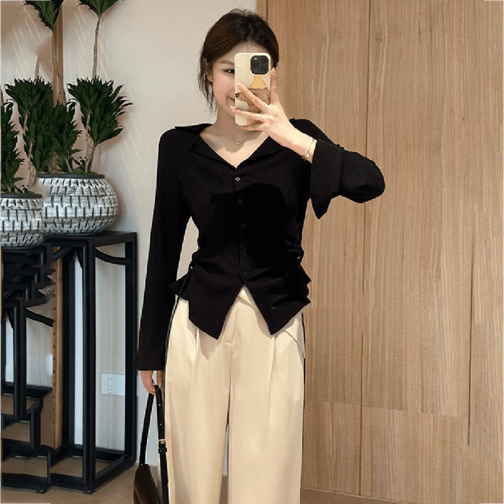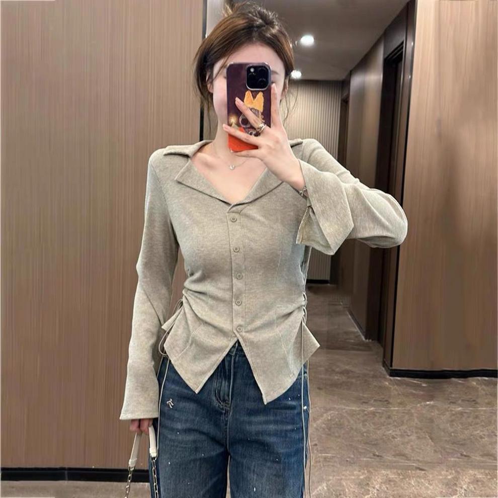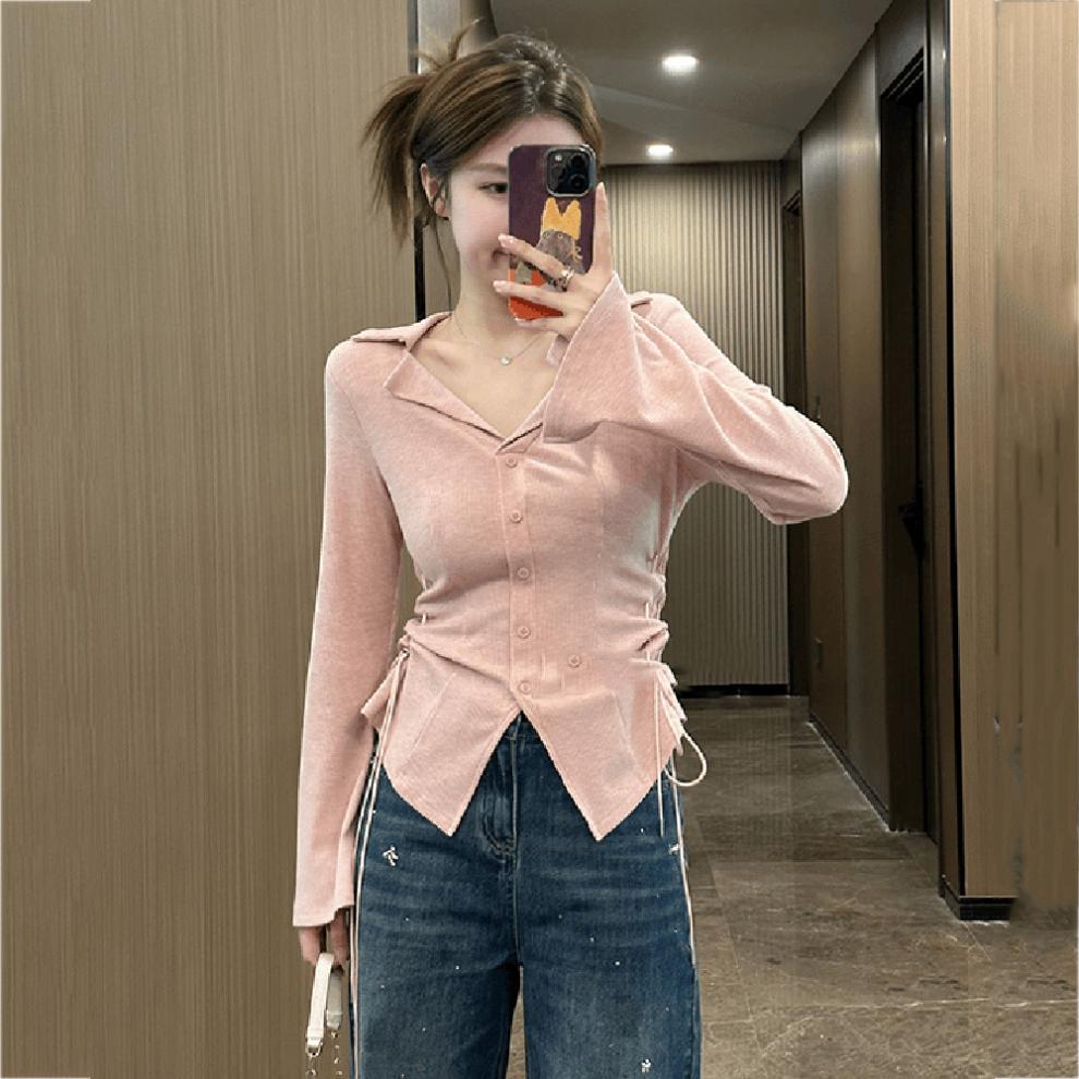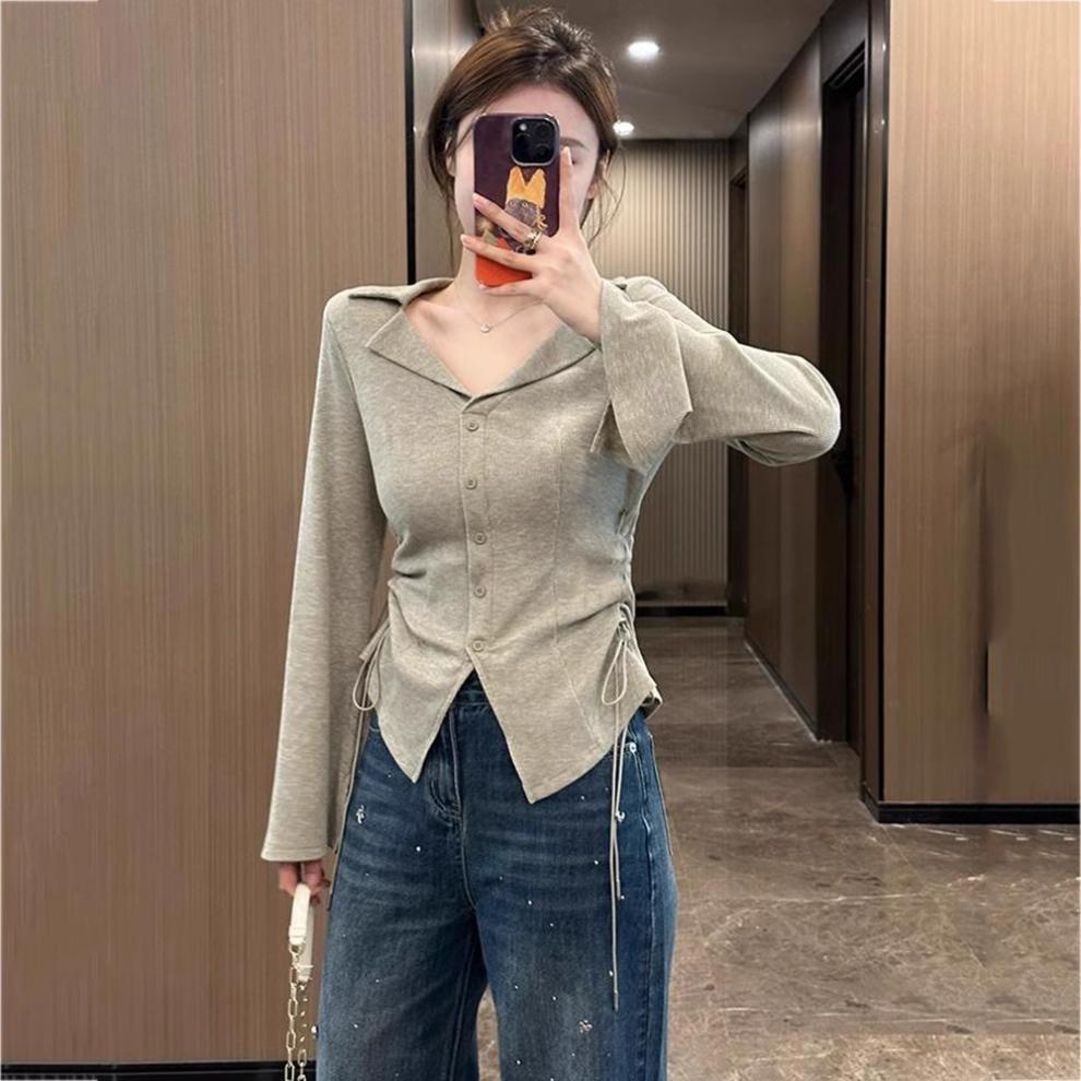 NUNBAI 플러스 사이즈 디자인 옷깃 핏 스트립 긴팔 스웨터 여성 초가을 뉴 통통녀 배꼽 커버 탑스토어 가기