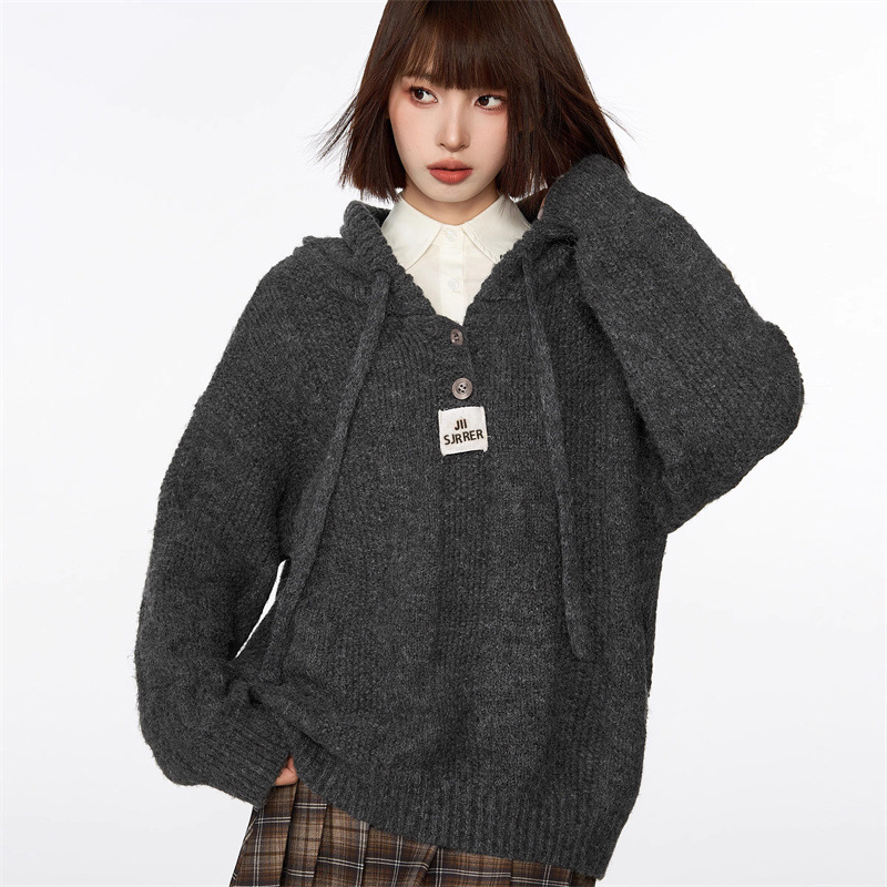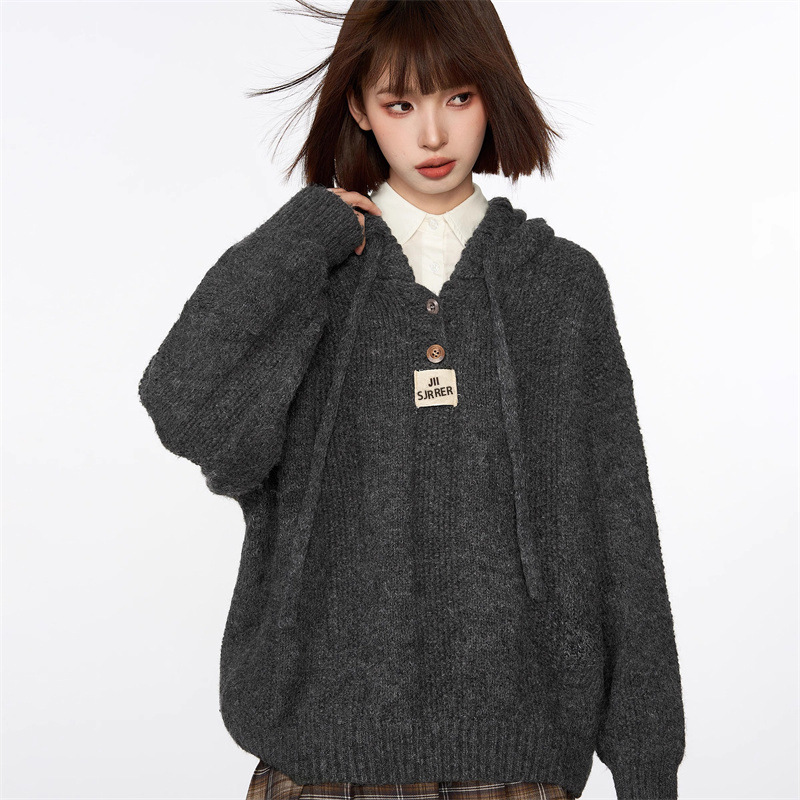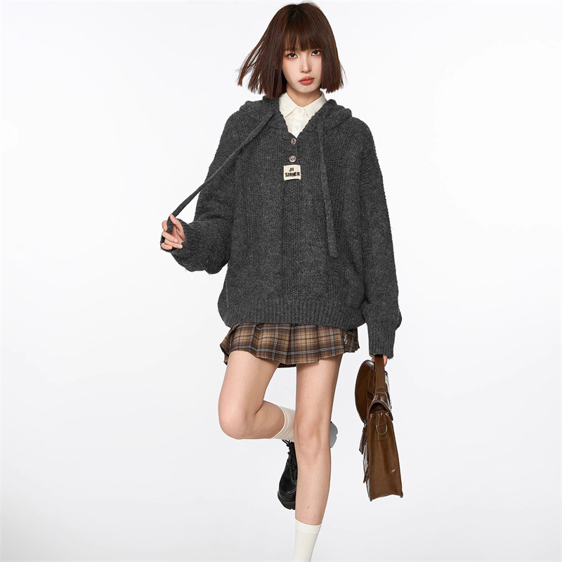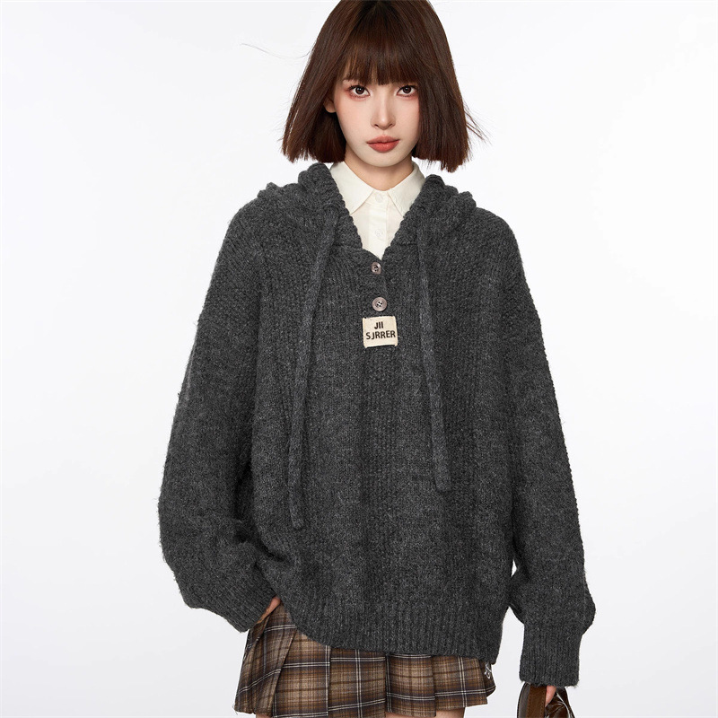 회색 빈티지 후드 풀오버 니트 스웨터 여성용 가을과 겨울 외부 착용 느슨한 게으른 스타일 두꺼운 긴팔 탑 재킷