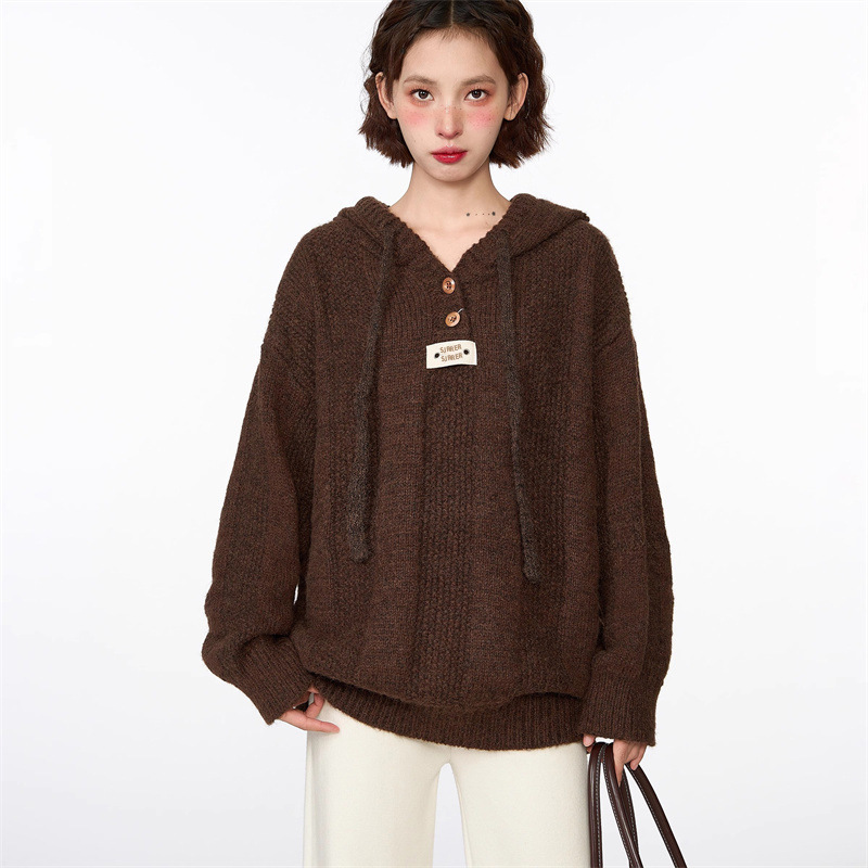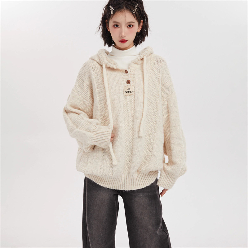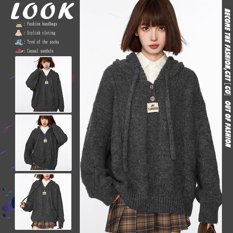 회색 빈티지 후드 풀오버 니트 스웨터 여성용 가을과 겨울 외부 착용 느슨한 게으른 스타일 두꺼운 긴팔 탑 재킷스토어 가기