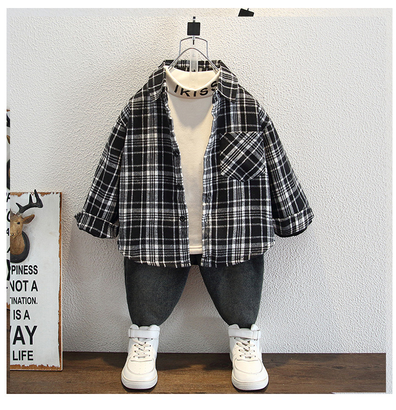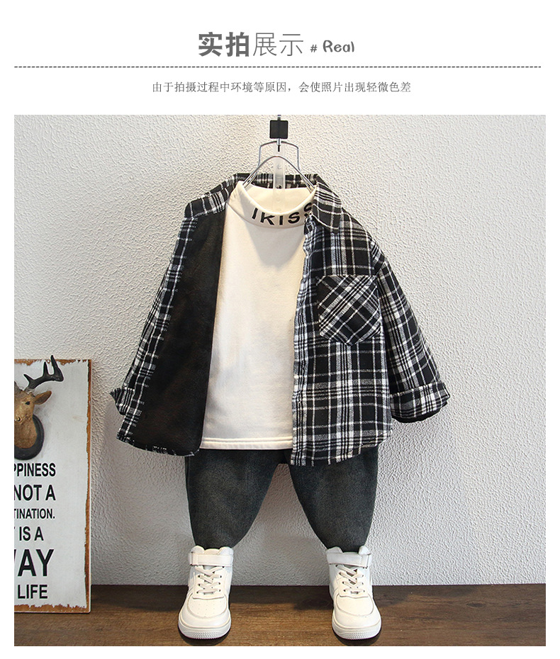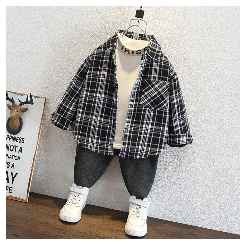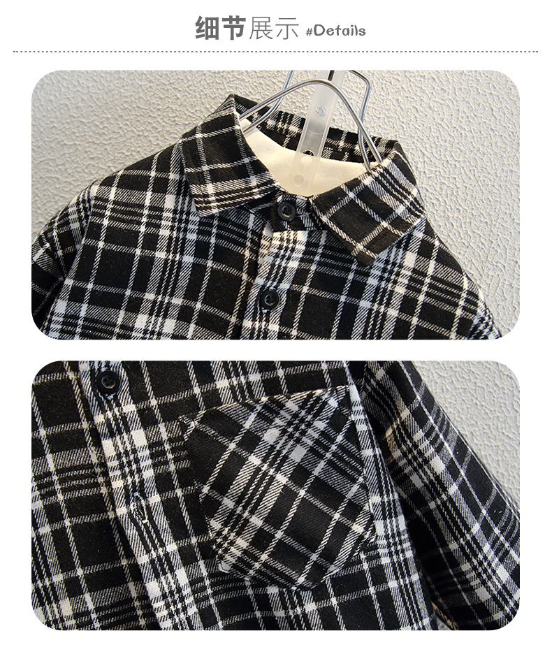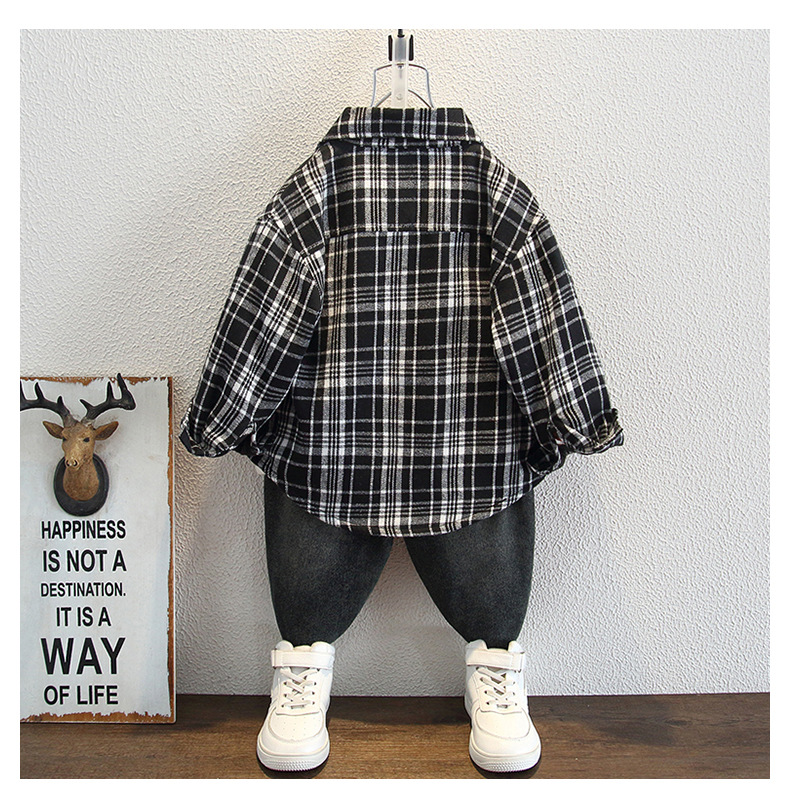 아동복 소년의 세련된 격자 무늬 기모 코튼 셔츠 가을과 겨울 어린이 캐주얼 유행 두꺼운 재킷스토어 가기