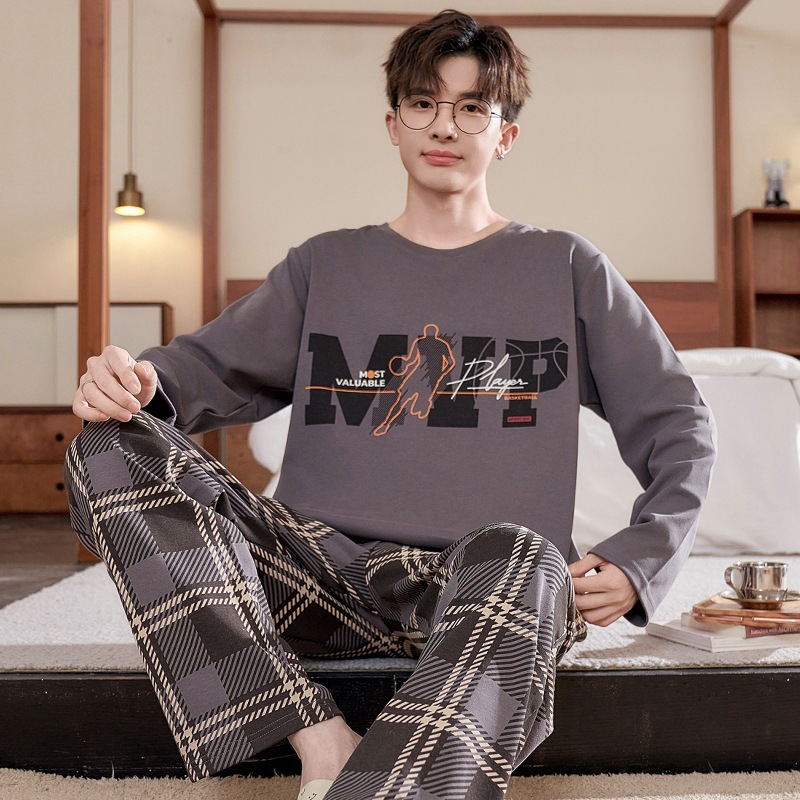 남자 잠옷 봄 가을면 긴 소매 남자 10 대 학생 큰 아이들 2024 새 집 옷 세트