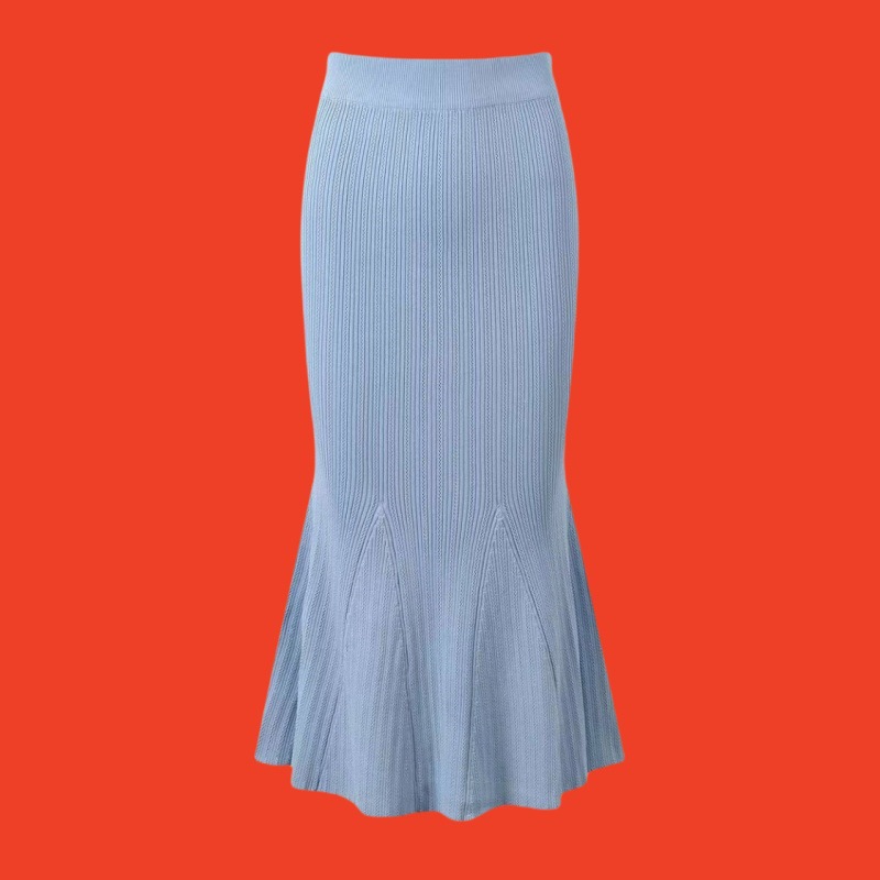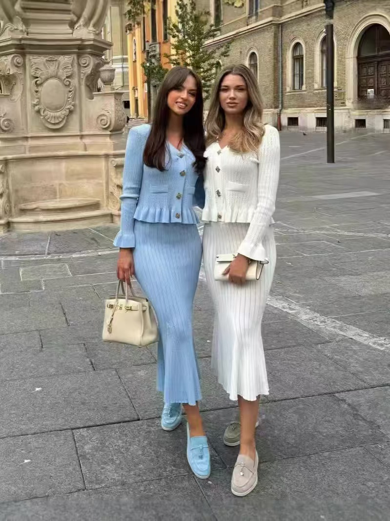2026 가을 신상 프렌치 스타일 여성스러운 슬림핏 니트 탑 + 힙을 감싸는 피쉬테일 스커트 세트 드레스스토어 가기