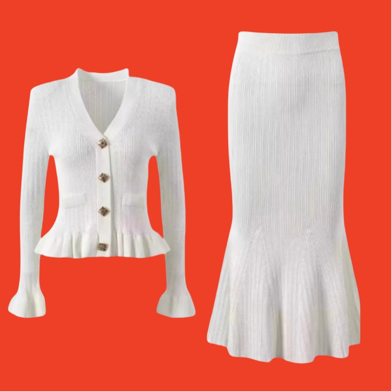 2026 가을 신상 프렌치 스타일 여성스러운 슬림핏 니트 탑 + 힙을 감싸는 피쉬테일 스커트 세트 드레스