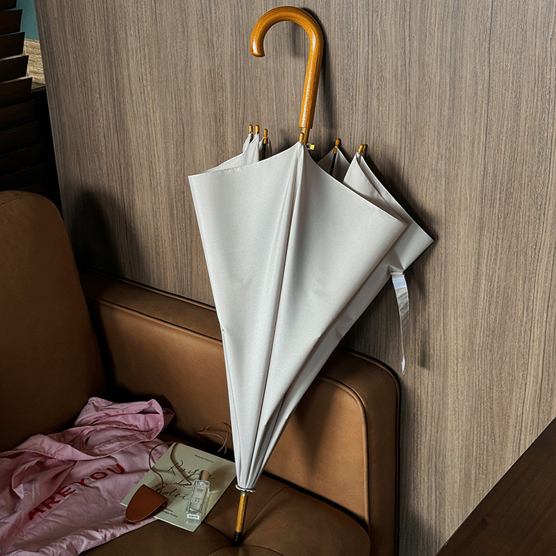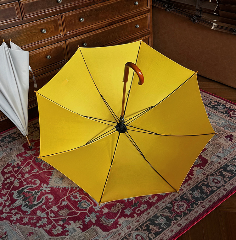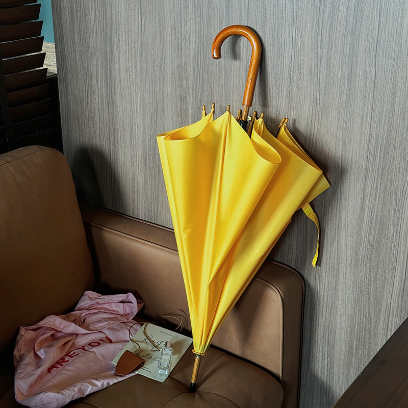 Ins 솔리드 컬러 더블 사람 긴 손잡이 우산 솔리드 우드 핸들 맑고 비오는 듀얼 사용 스트레이트 로드 우산 부부를 위한 강화 방풍 가정용 우산