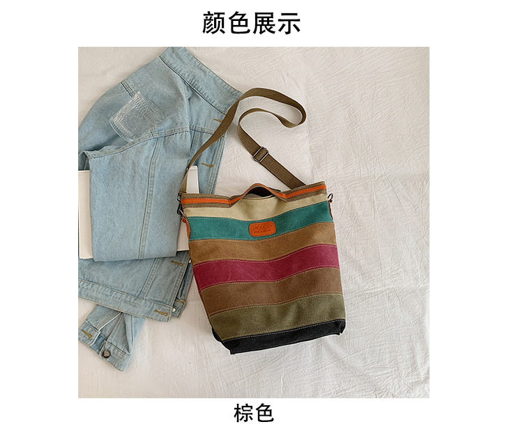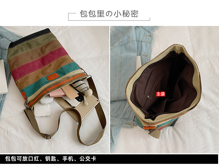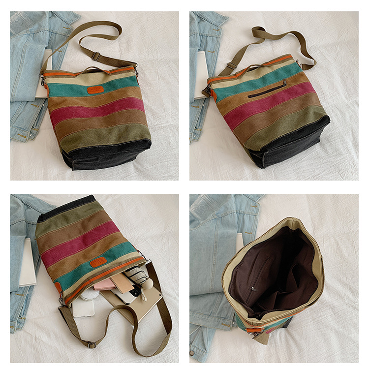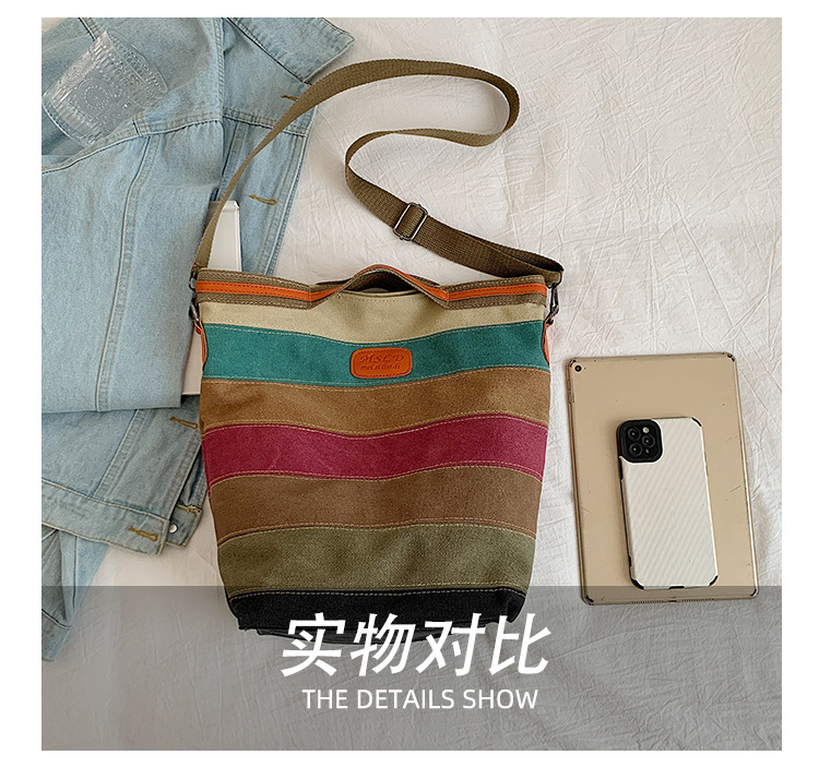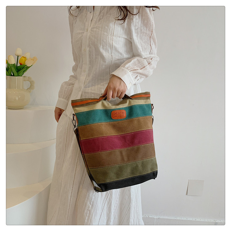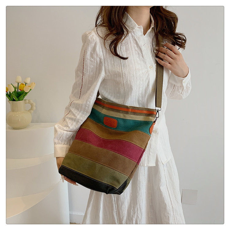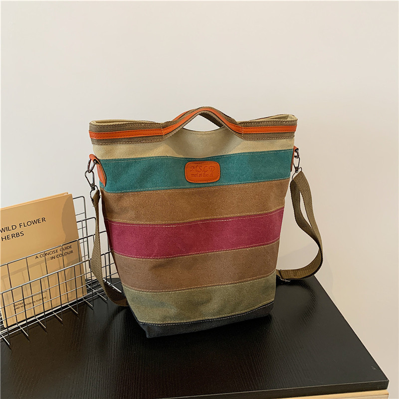 국경 간 버킷 패션 캐주얼 어깨 휴대용 여성용 가방 새로운 한국식 캔버스 가방 대비 컬러 스티칭 크로스 바디 스트라이프 백