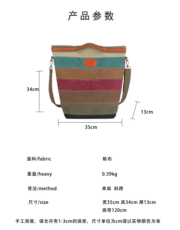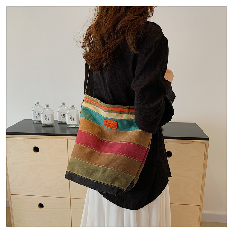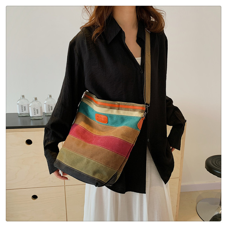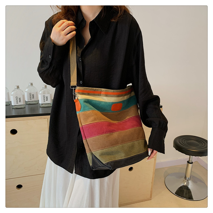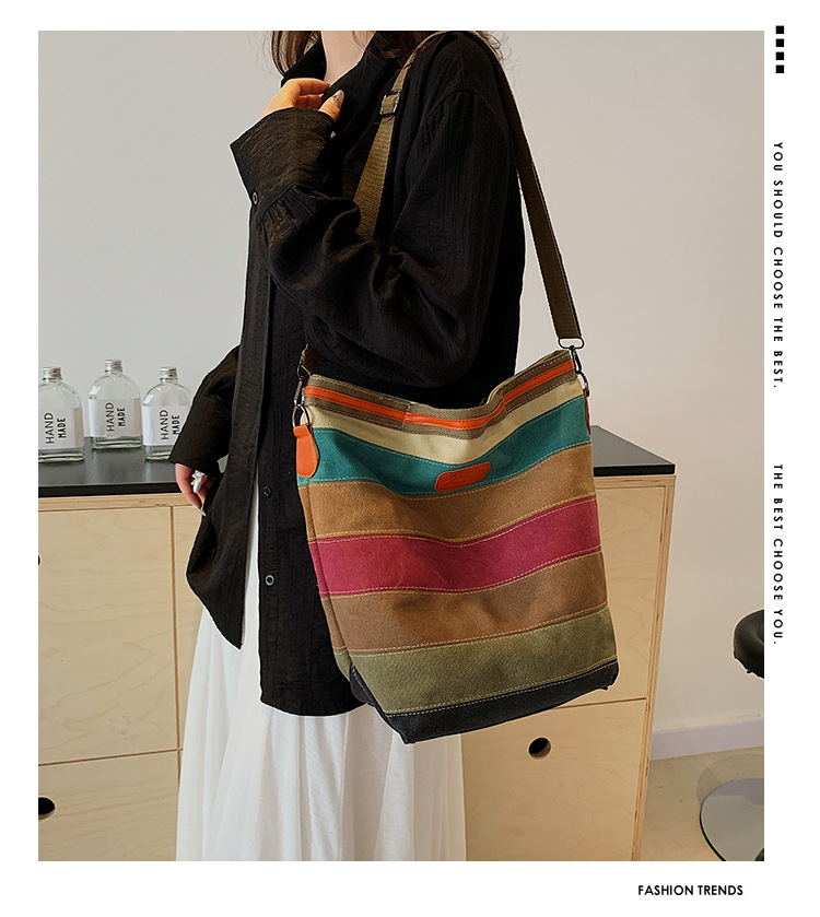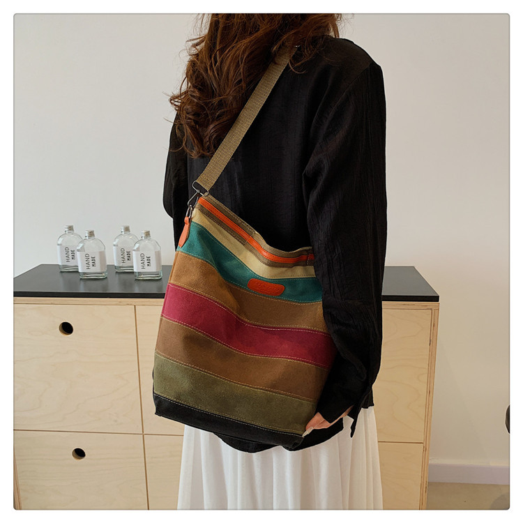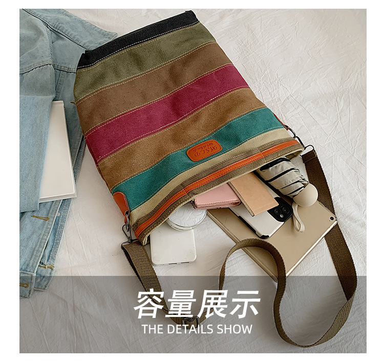 국경 간 버킷 패션 캐주얼 어깨 휴대용 여성용 가방 새로운 한국식 캔버스 가방 대비 컬러 스티칭 크로스 바디 스트라이프 백