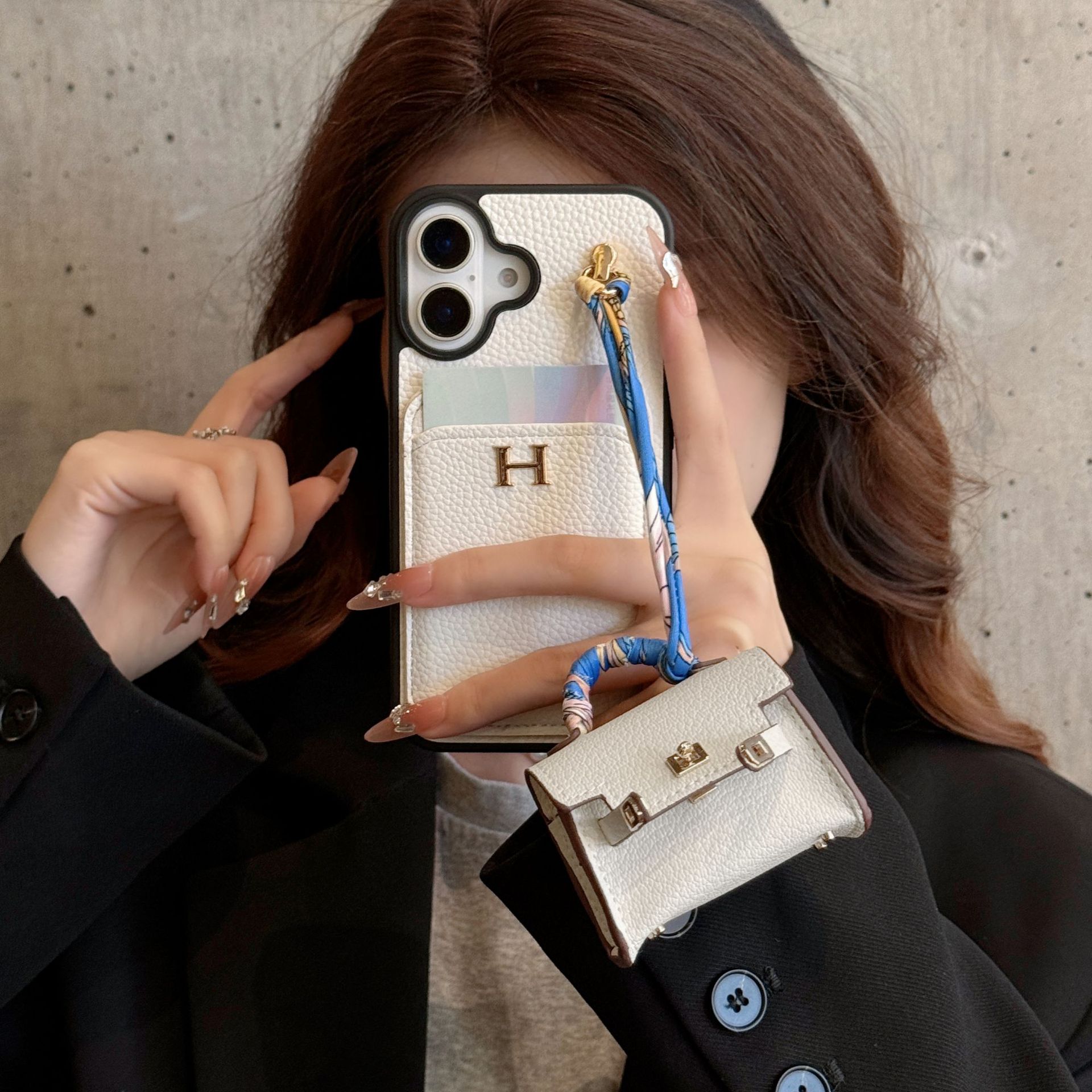 Apple 17 휴대폰 케이스에 적합 iPhone15Pro max 리치 패턴 카드 홀더 + 헤드폰 커버 휴대폰 케이스 12 트렌디 여성