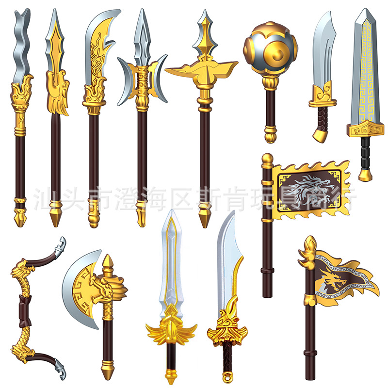 국경 간 건물 블록 남자 사무라이 무기 액세서리 모델 장난감 삼국지 고대 검, 검, 창, Halberd, 도끼, 망치, 활 및 화살
