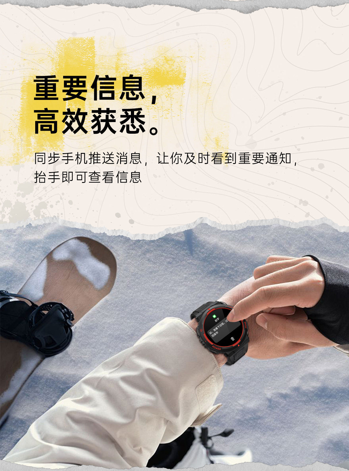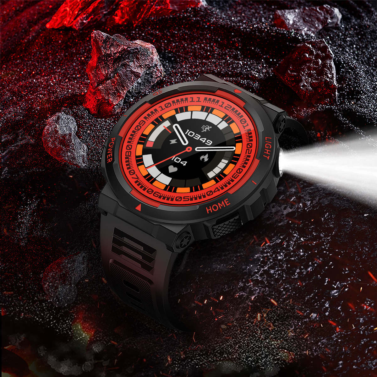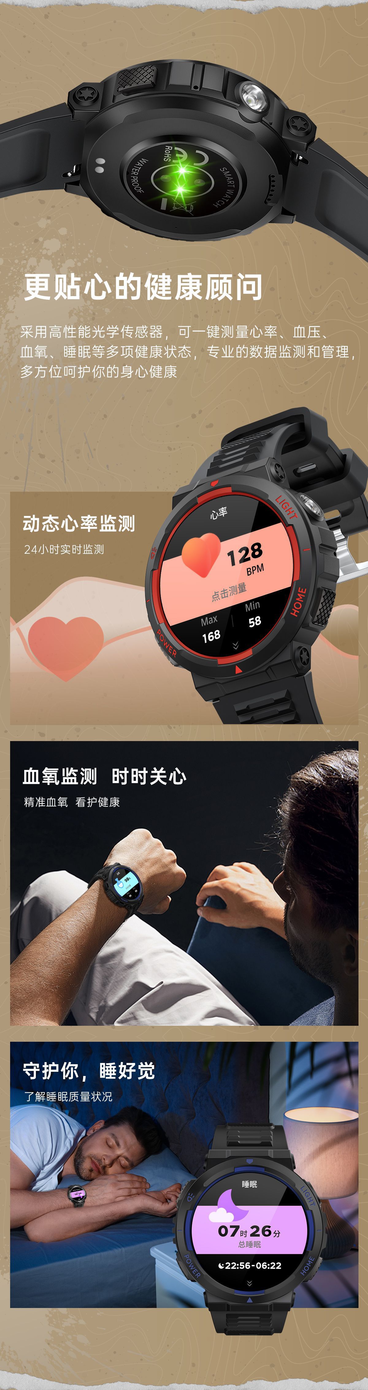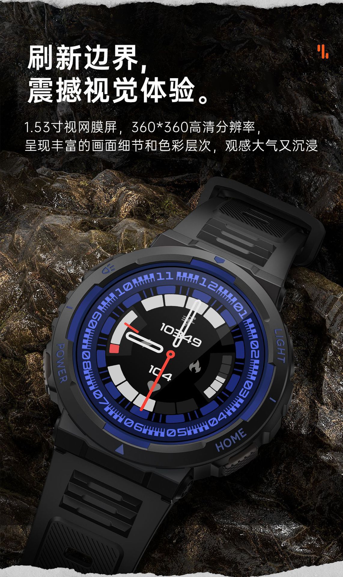 主要功能(Major function) 户外强光灯,1.53英寸超清屏360*360像素,全屏触摸,心率,血氧,血压,压力,锻炼、运动记录(步数,距离,卡路里计数),运动模式,语音助手,消息推送,信息存储,睡眠监测,天气推送,秒表,计时器,秒表,计算器,世界时钟、相机遥控,音乐控制,查找手机,女性健康等。