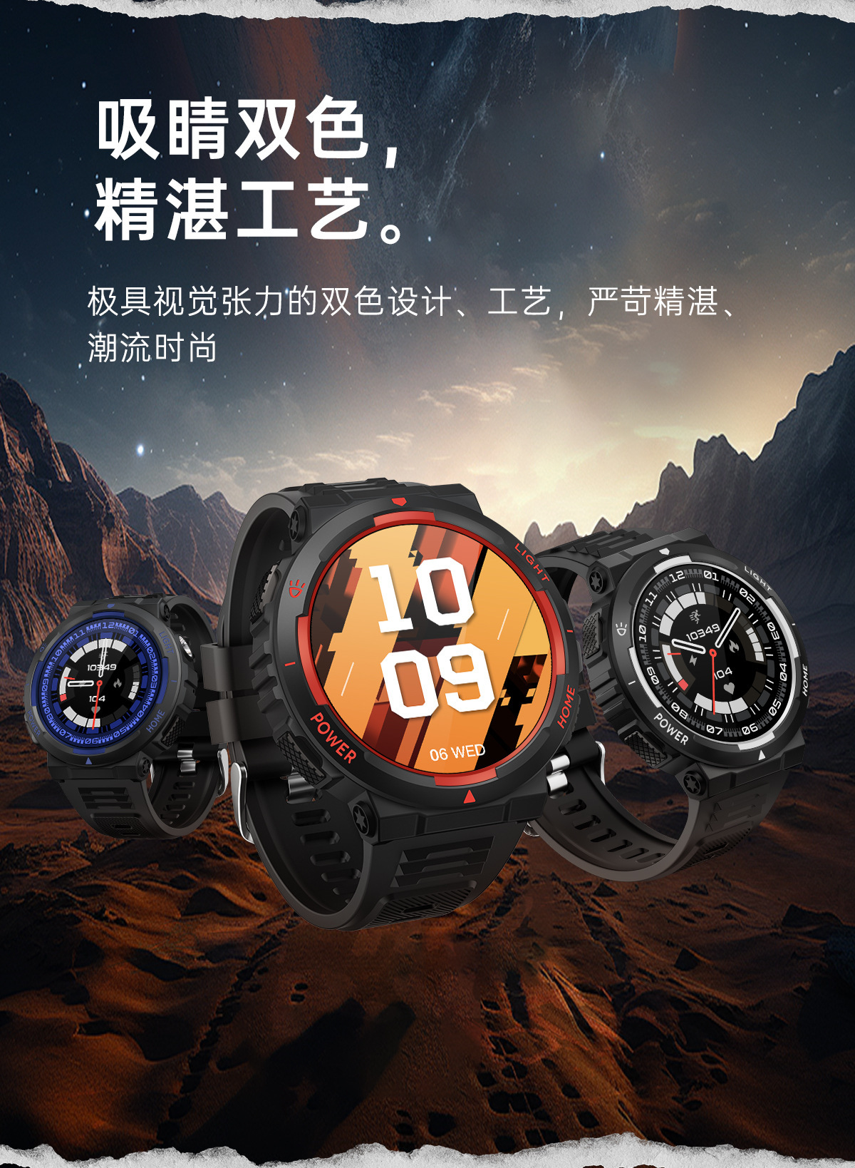 外观材质(Appearance material) 机身:环保塑胶+金属按键 腕带:硅胶