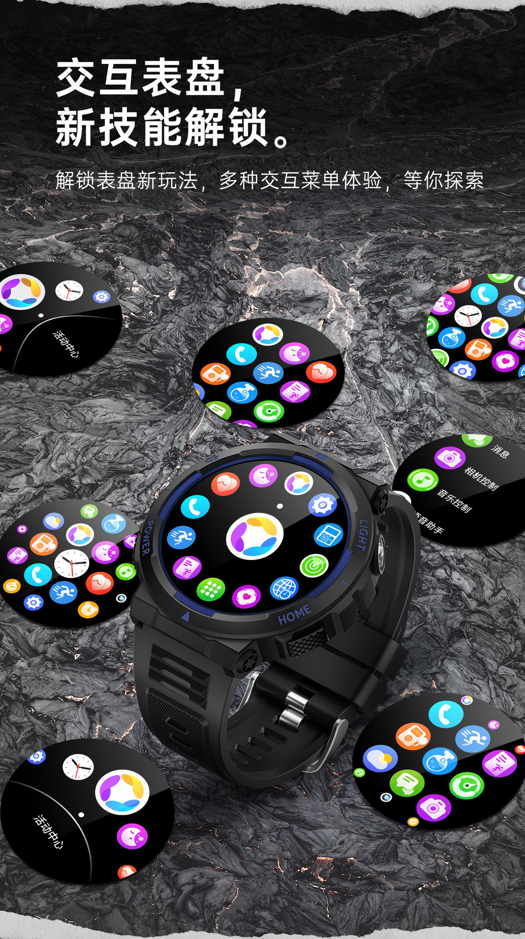 表盘选择、信息推送、每日闹钟、相机遥控、天气信息