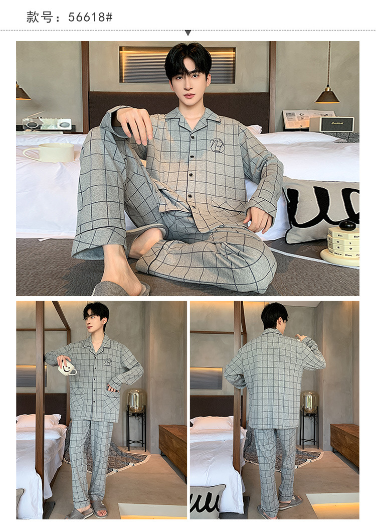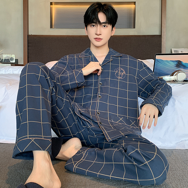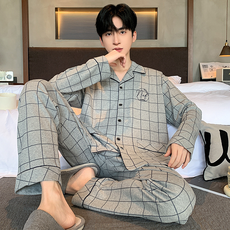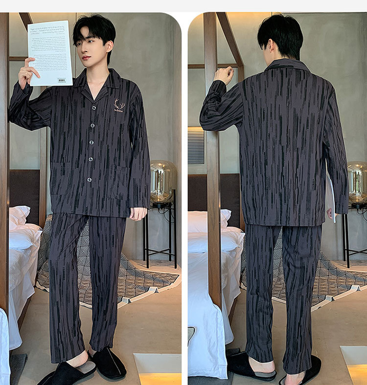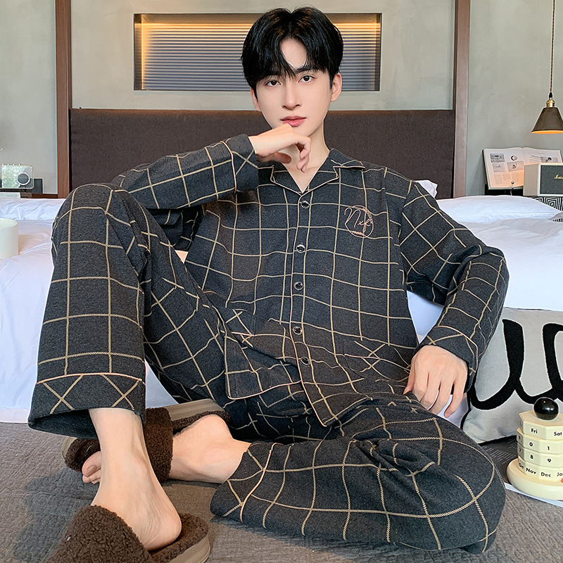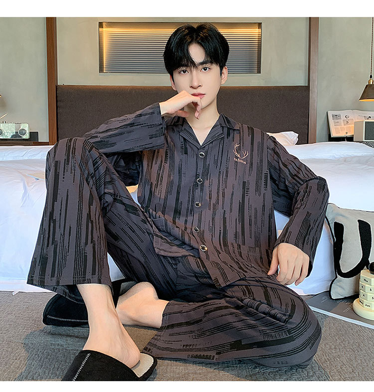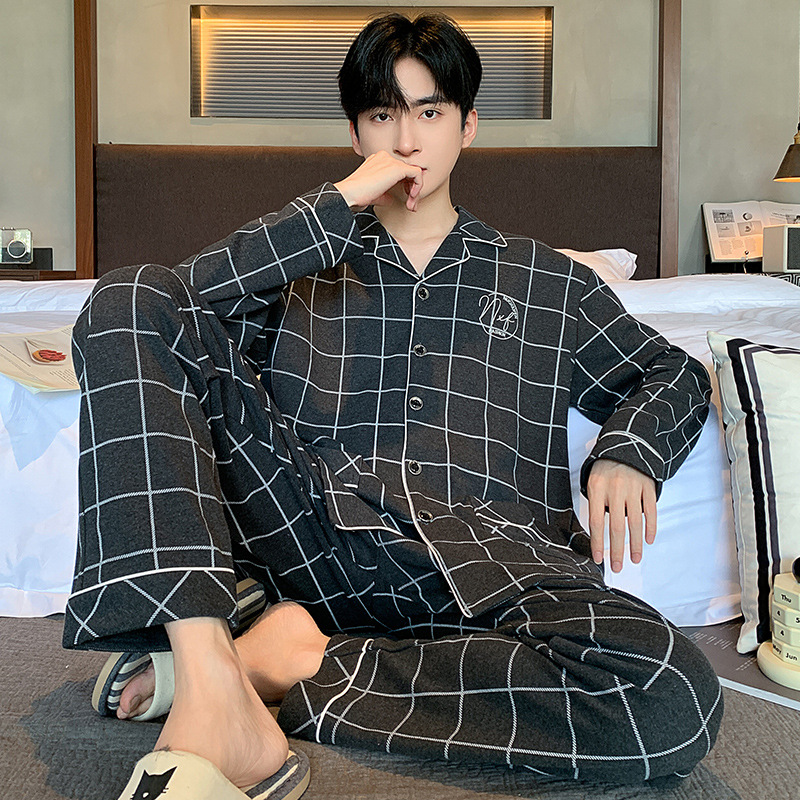 100% 면 잠옷 남자의 봄과 가을 새로운 카디건 긴 소매 플러스 사이즈 가을과 겨울 40 양면 면면 홈 옷스토어 가기