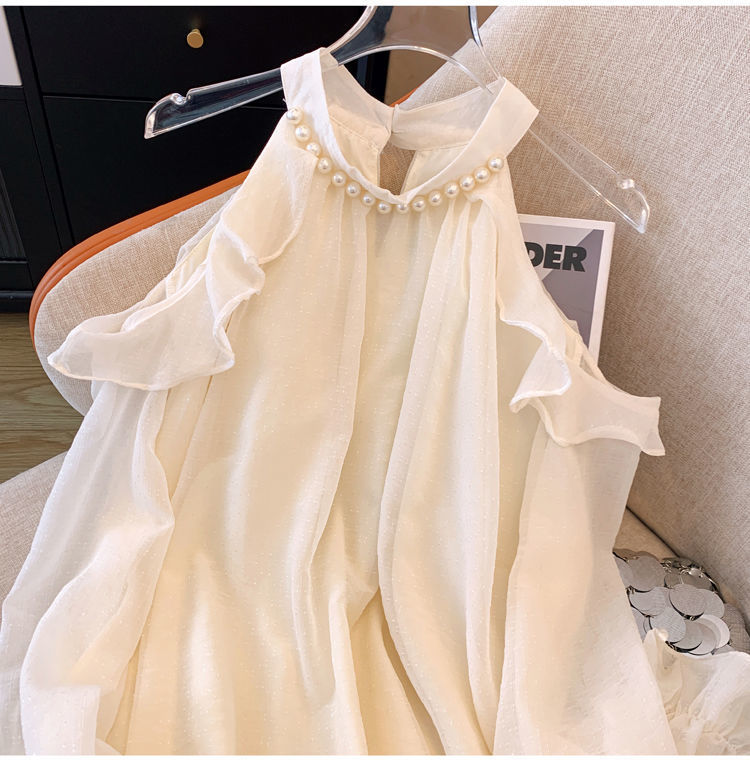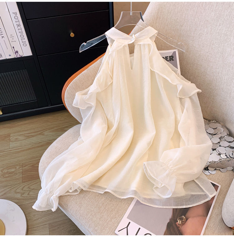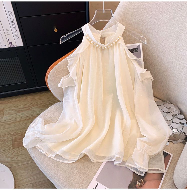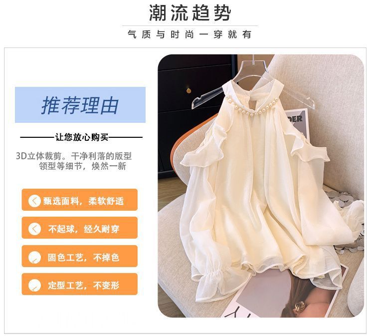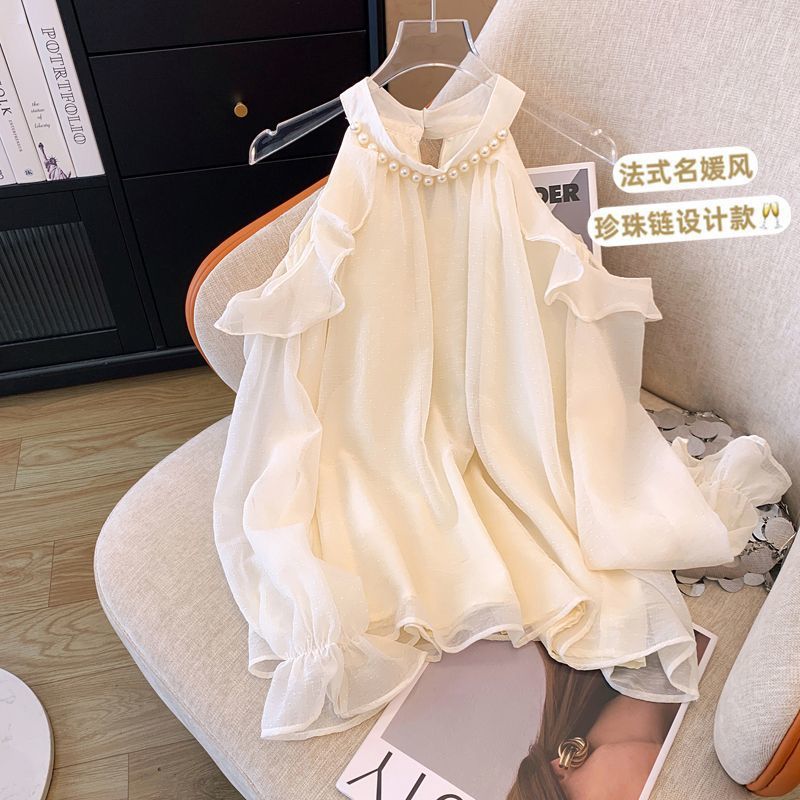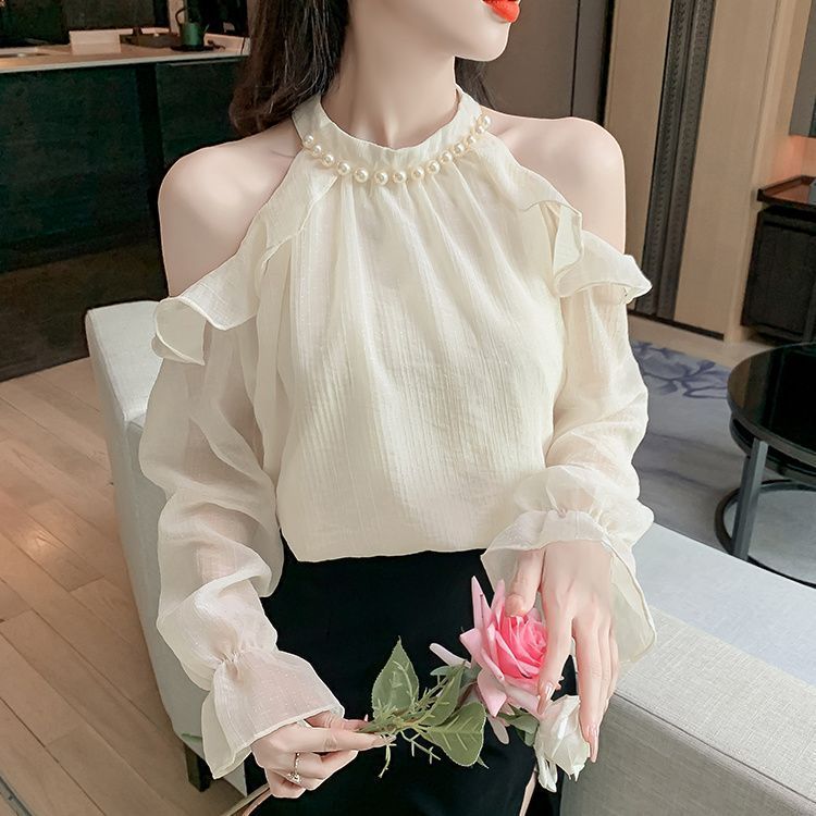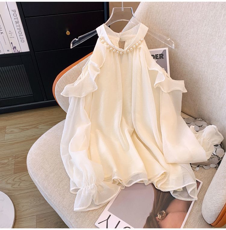 프랑스 스타일 진주 목 어깨 쉬폰 셔츠 여성용 가을 트럼펫 긴 소매 느슨한 서양식 시대 감소 최고 달콤한 작은 셔츠
