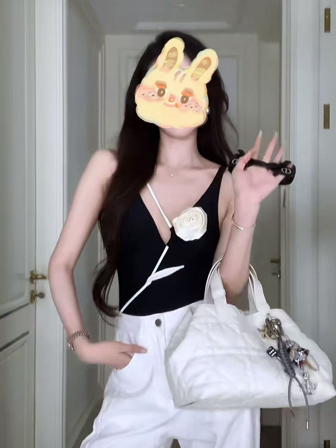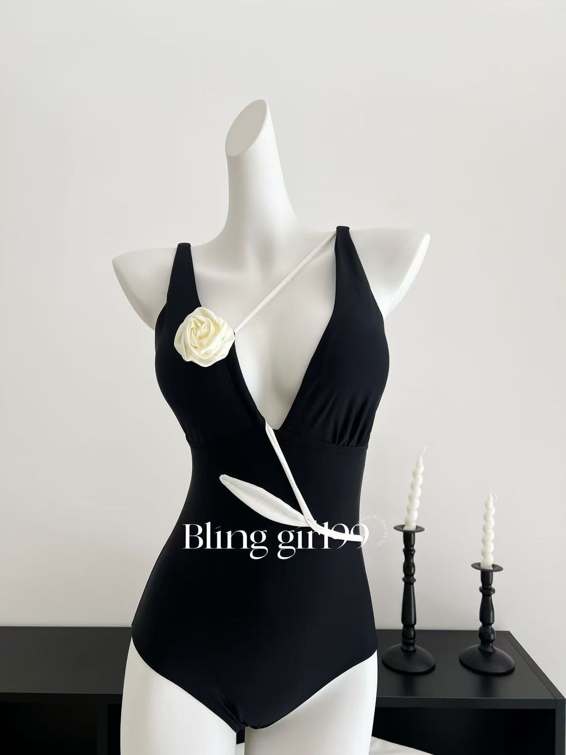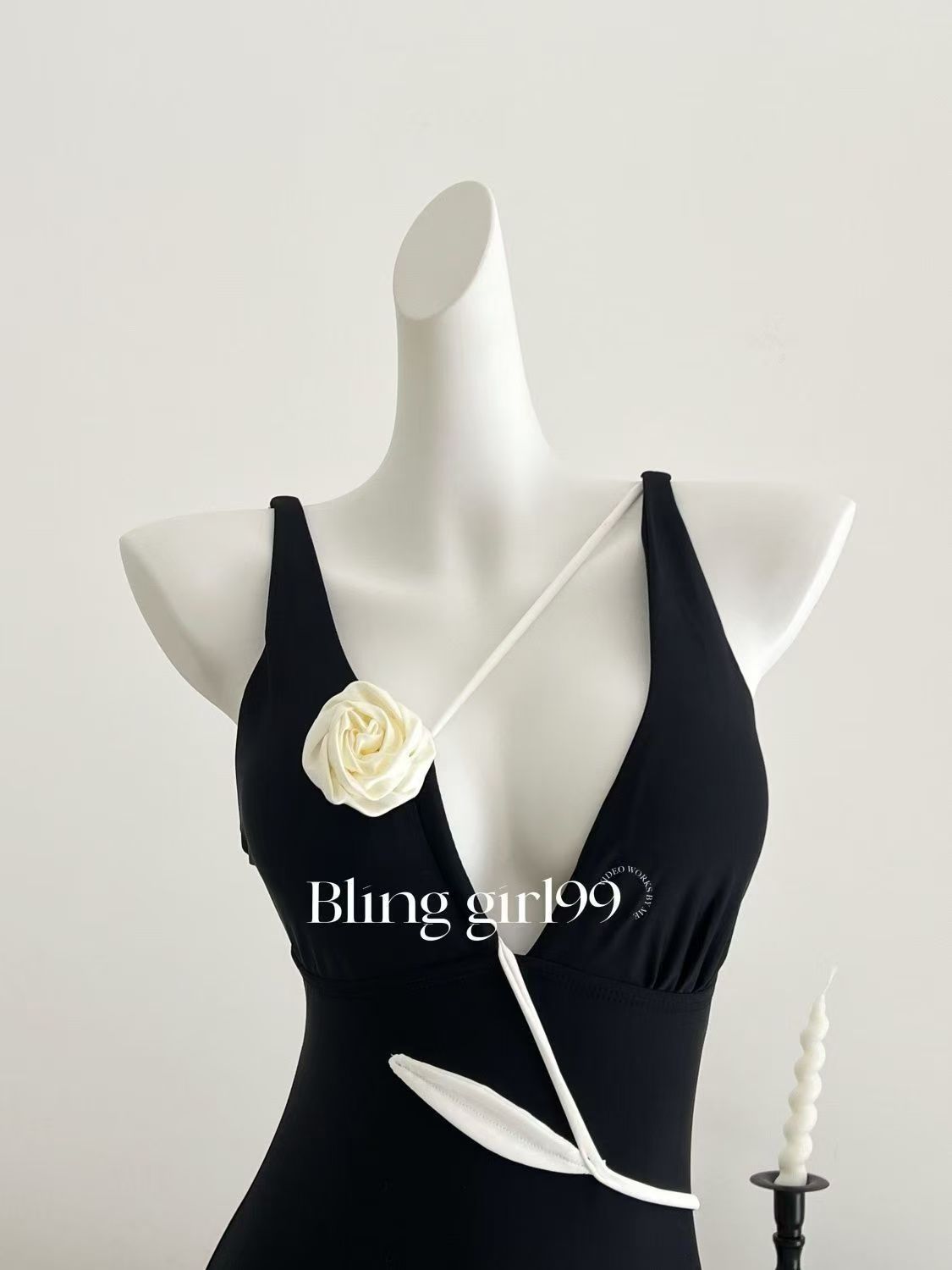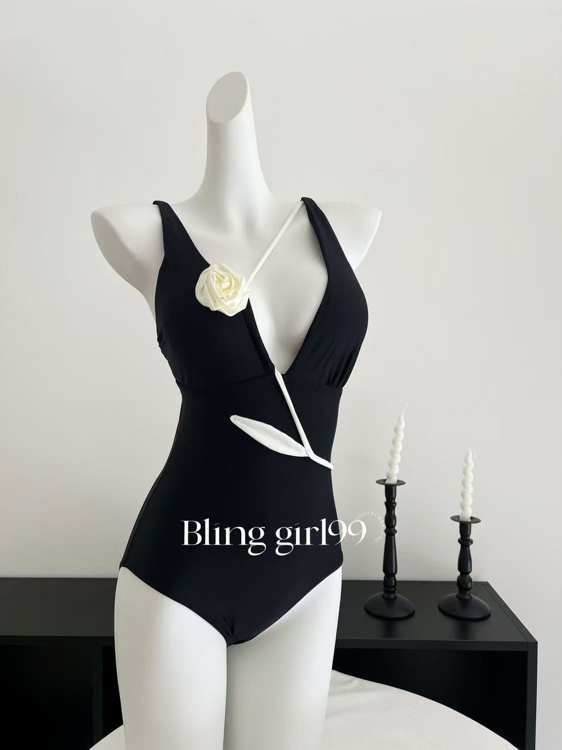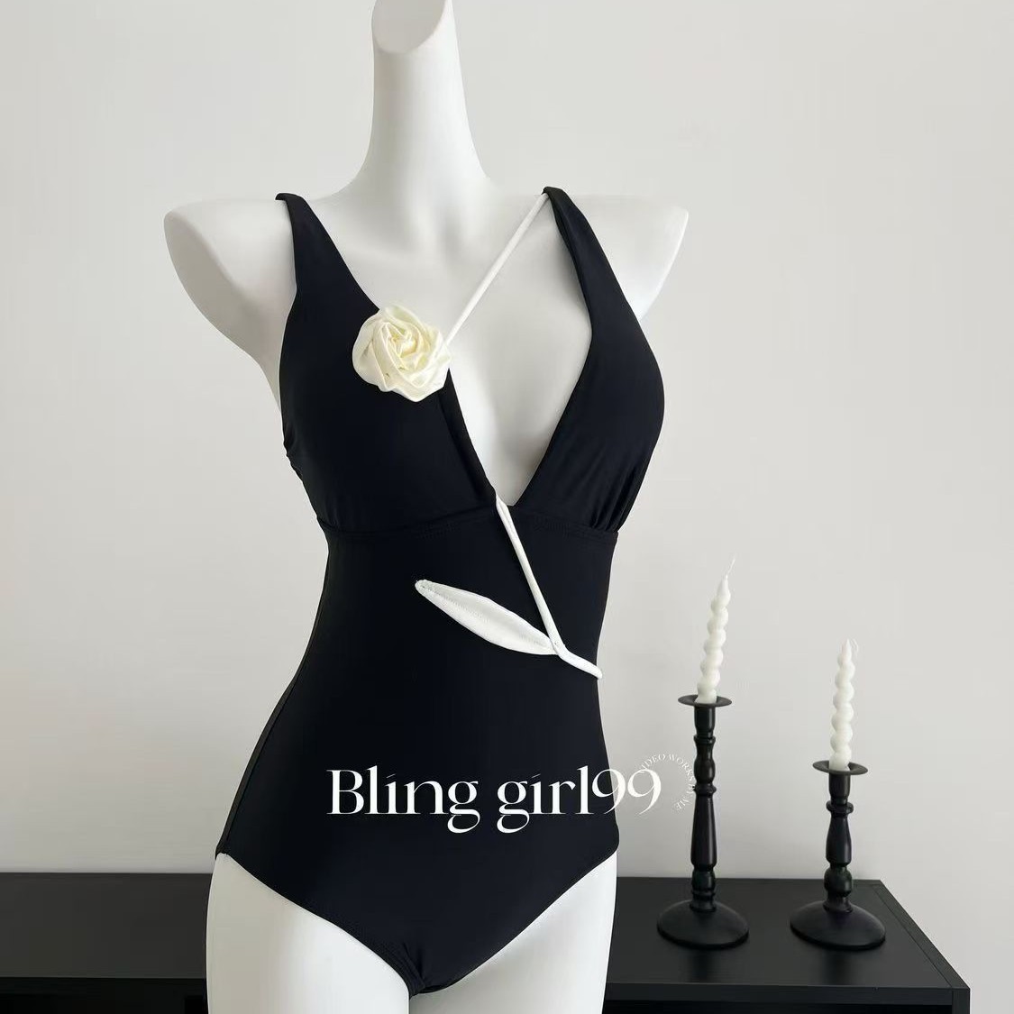 프랑스 틈새 디자인 화이트 로즈 V 넥 수영복 여성용 배꼽 슬리밍 온천 휴가 수영복스토어 가기