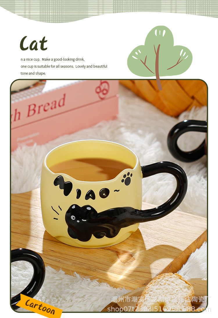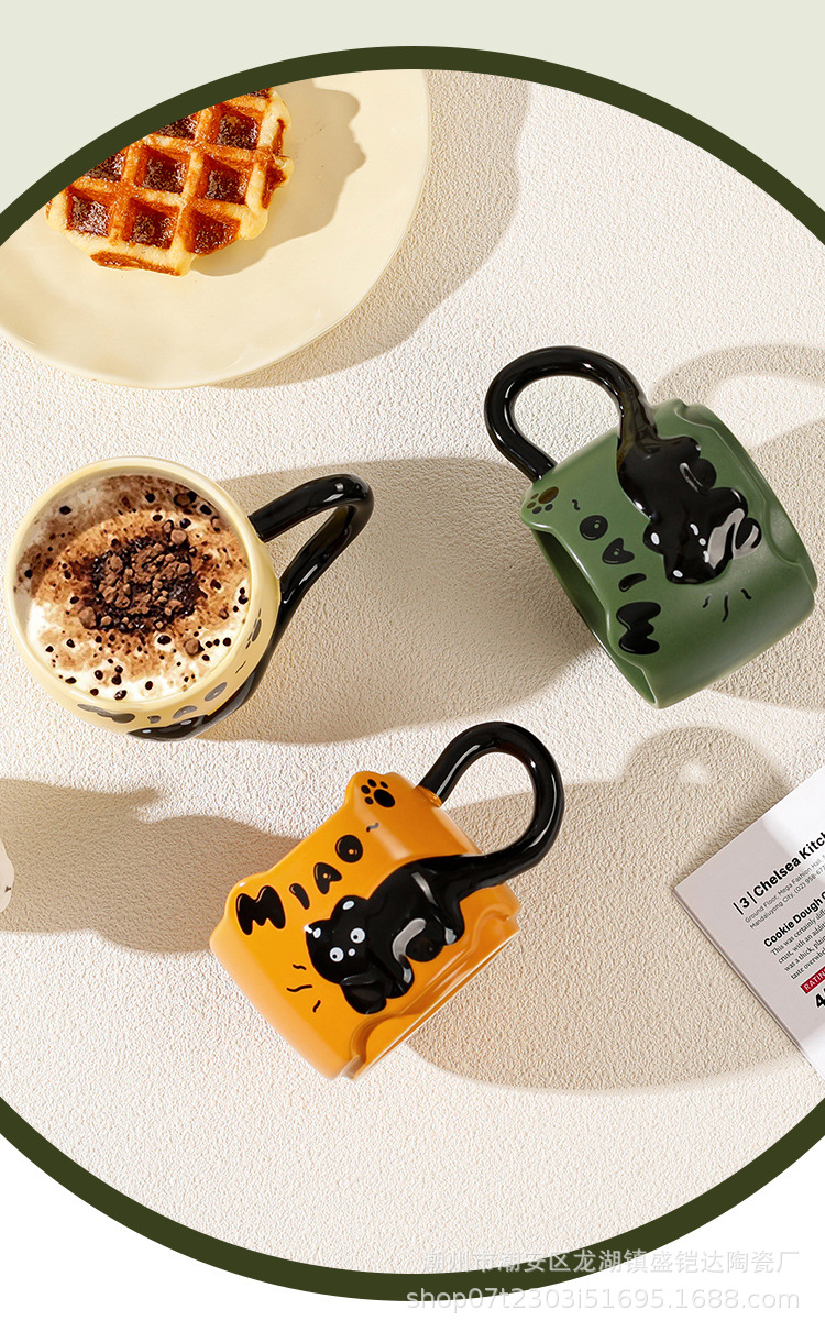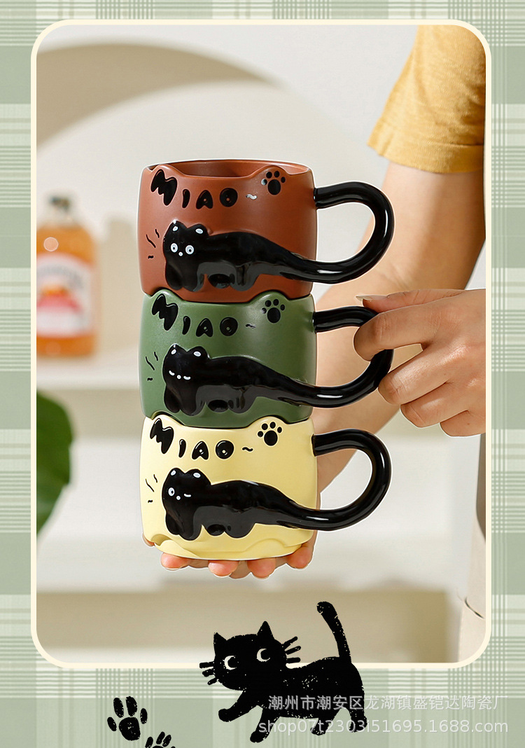 양각 작은 검은 고양이 머그잔 높은 색상 가치 창조적 인 스태킹 컵 귀여운 세라믹 컵 커피 우유 아침 식사 컵 유약 아래