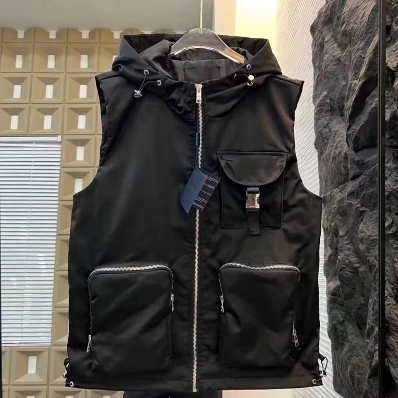 가을 2024 유행 브랜드 솔리드 컬러 캐주얼 빠른 건조 모든 경기 멀티 포켓 후드 조끼 남자 조끼 민소매 벽