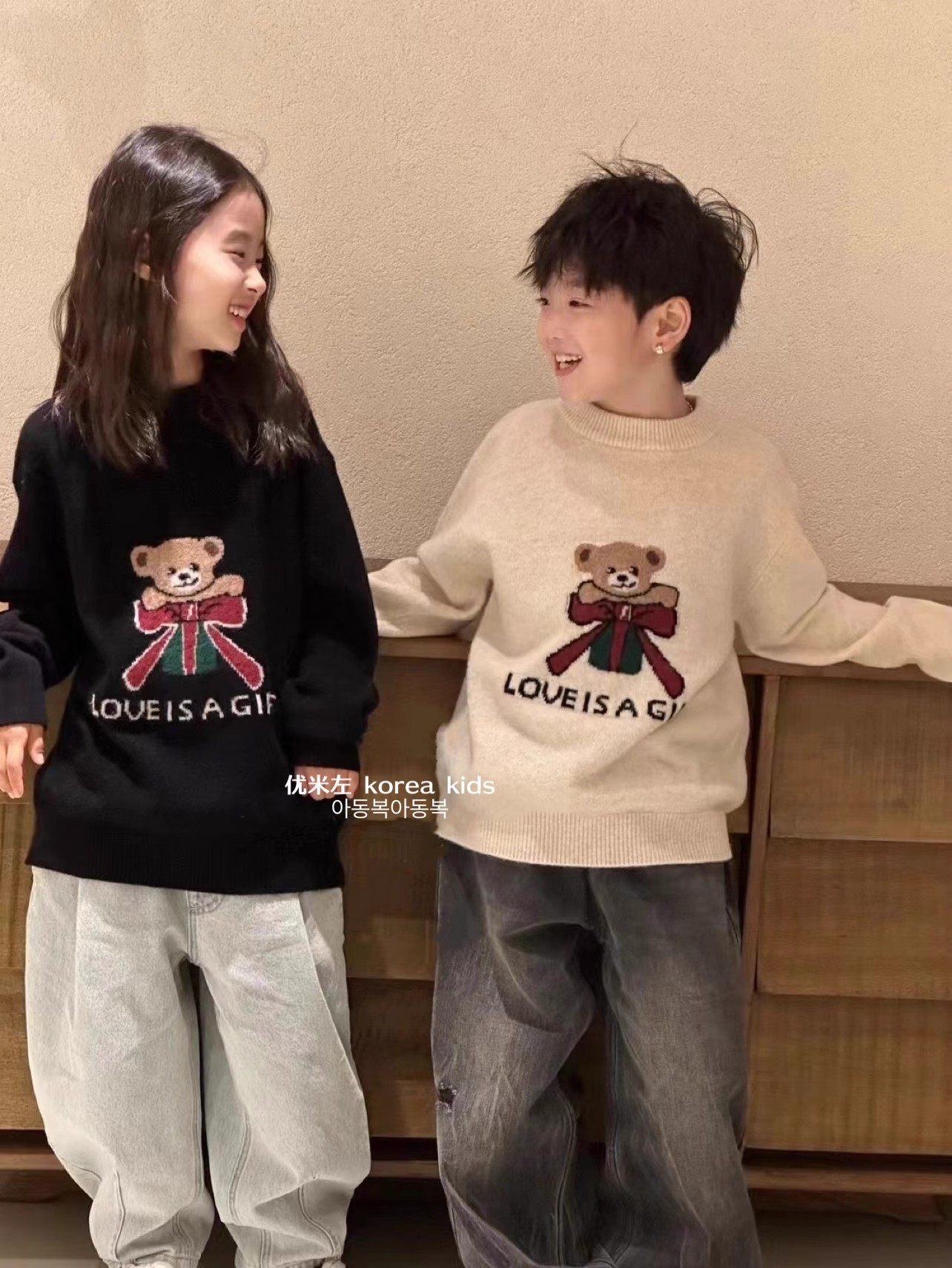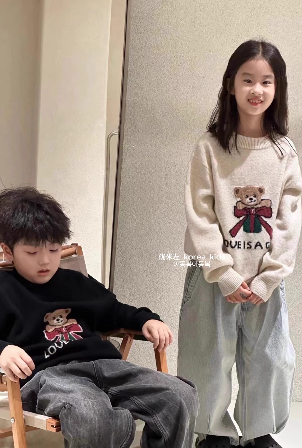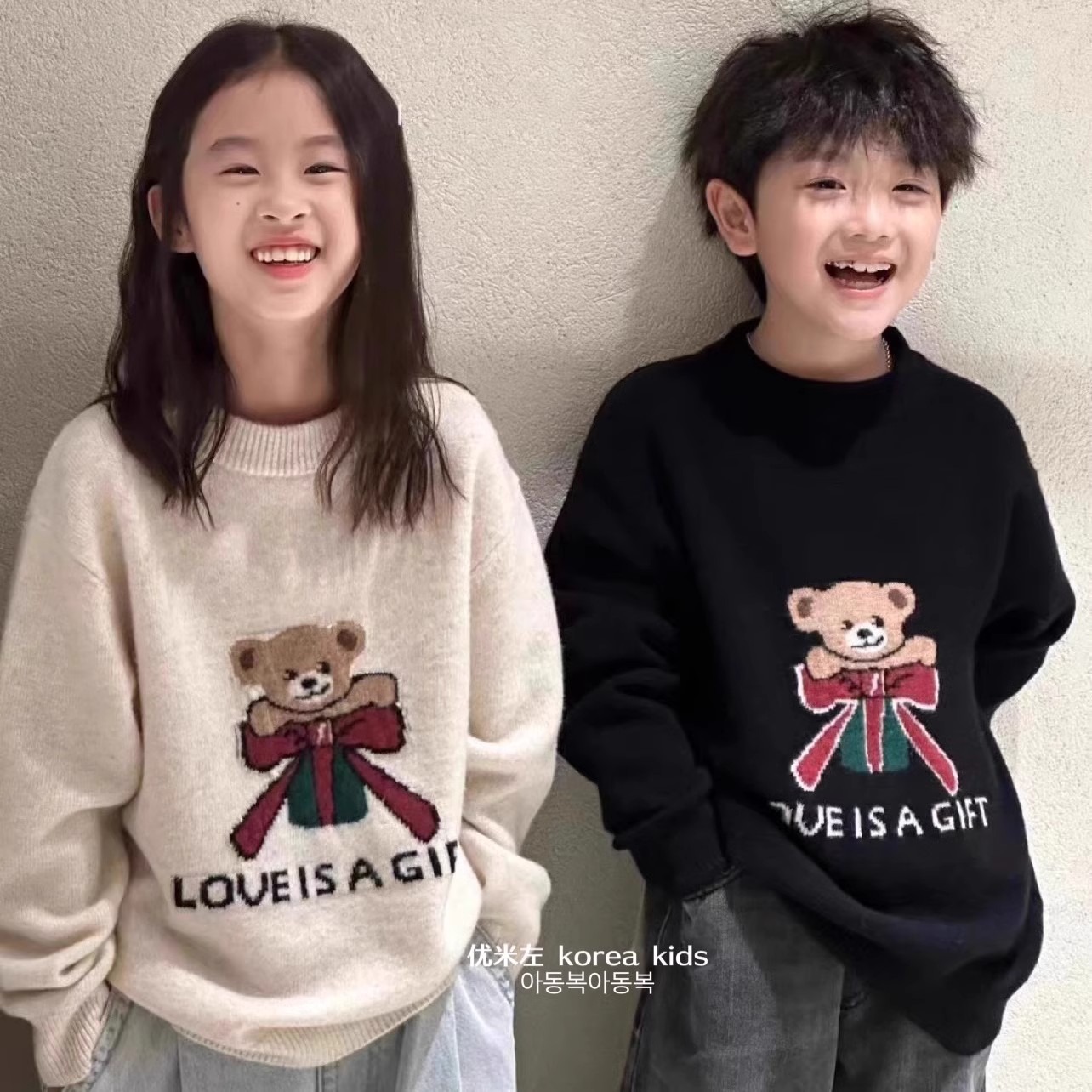 어린이 의류 귀여운 소녀 스웨터 2024 새로운 가을과 겨울 소년과 소녀 곰 니트 셔츠 큰 어린이 탑스토어 가기