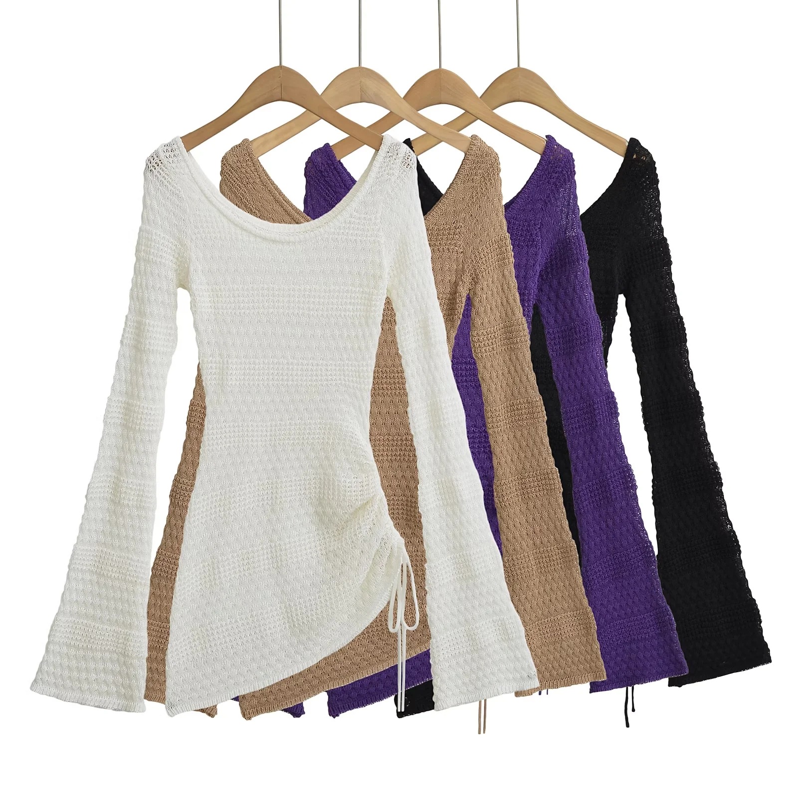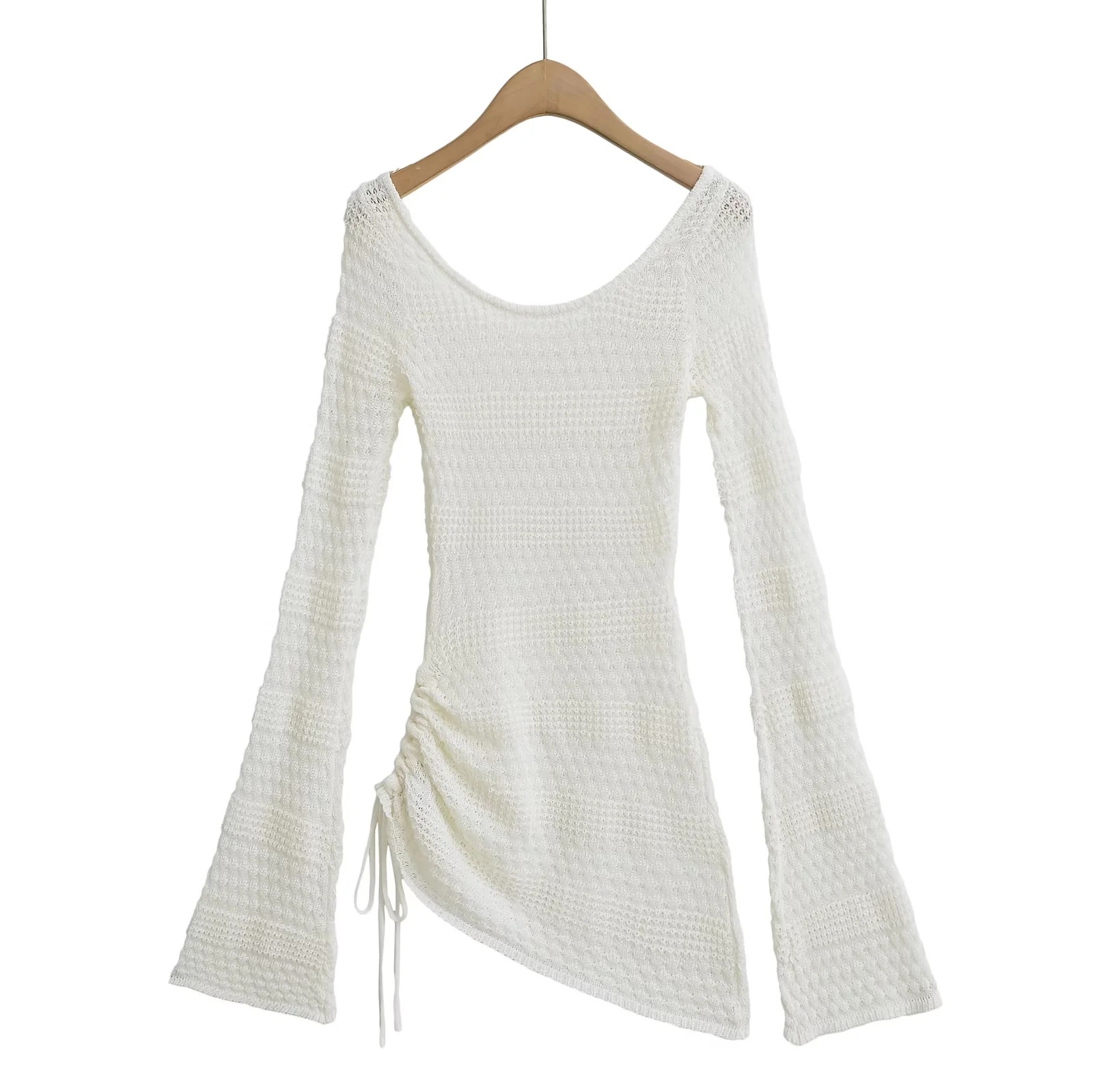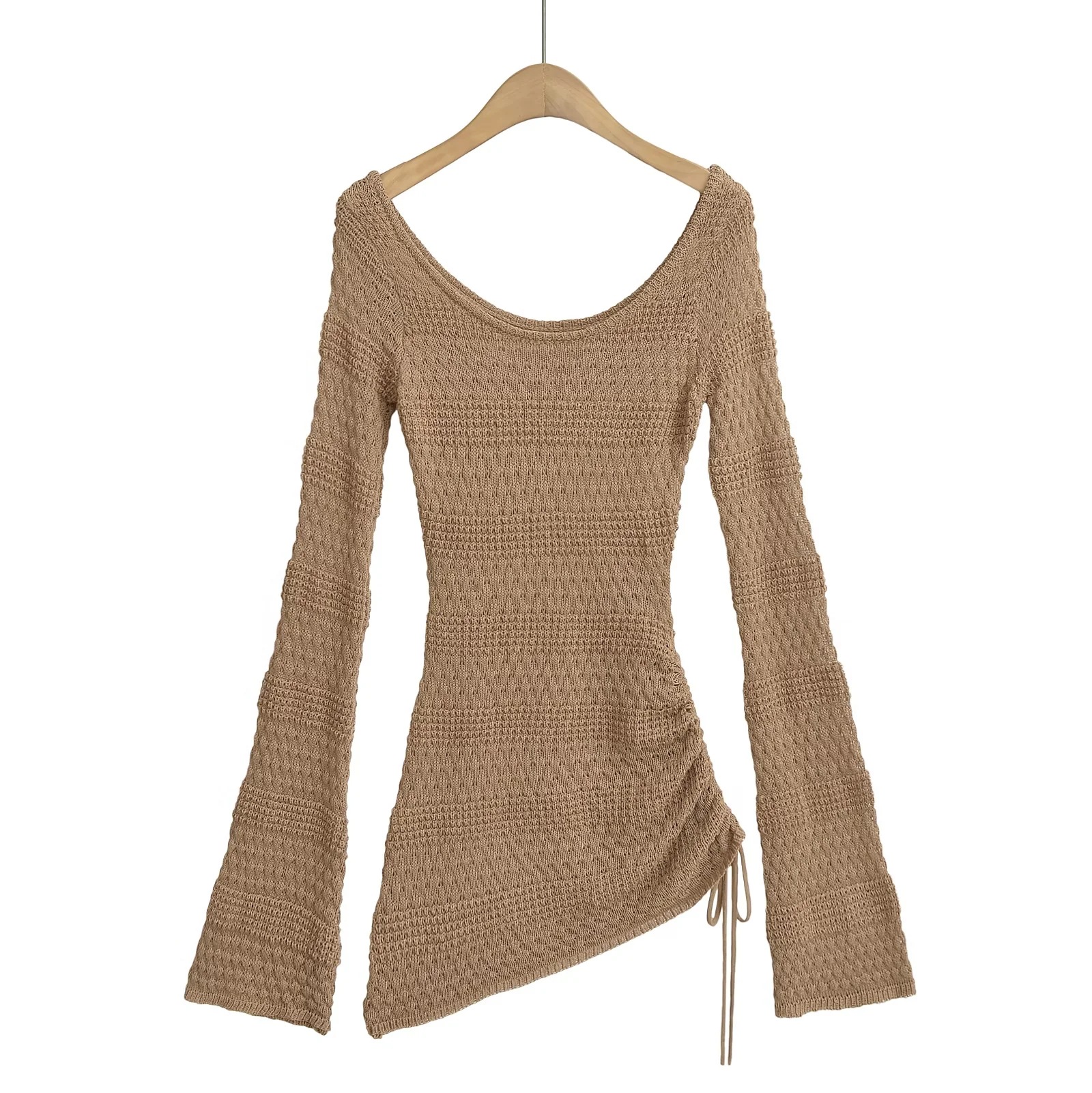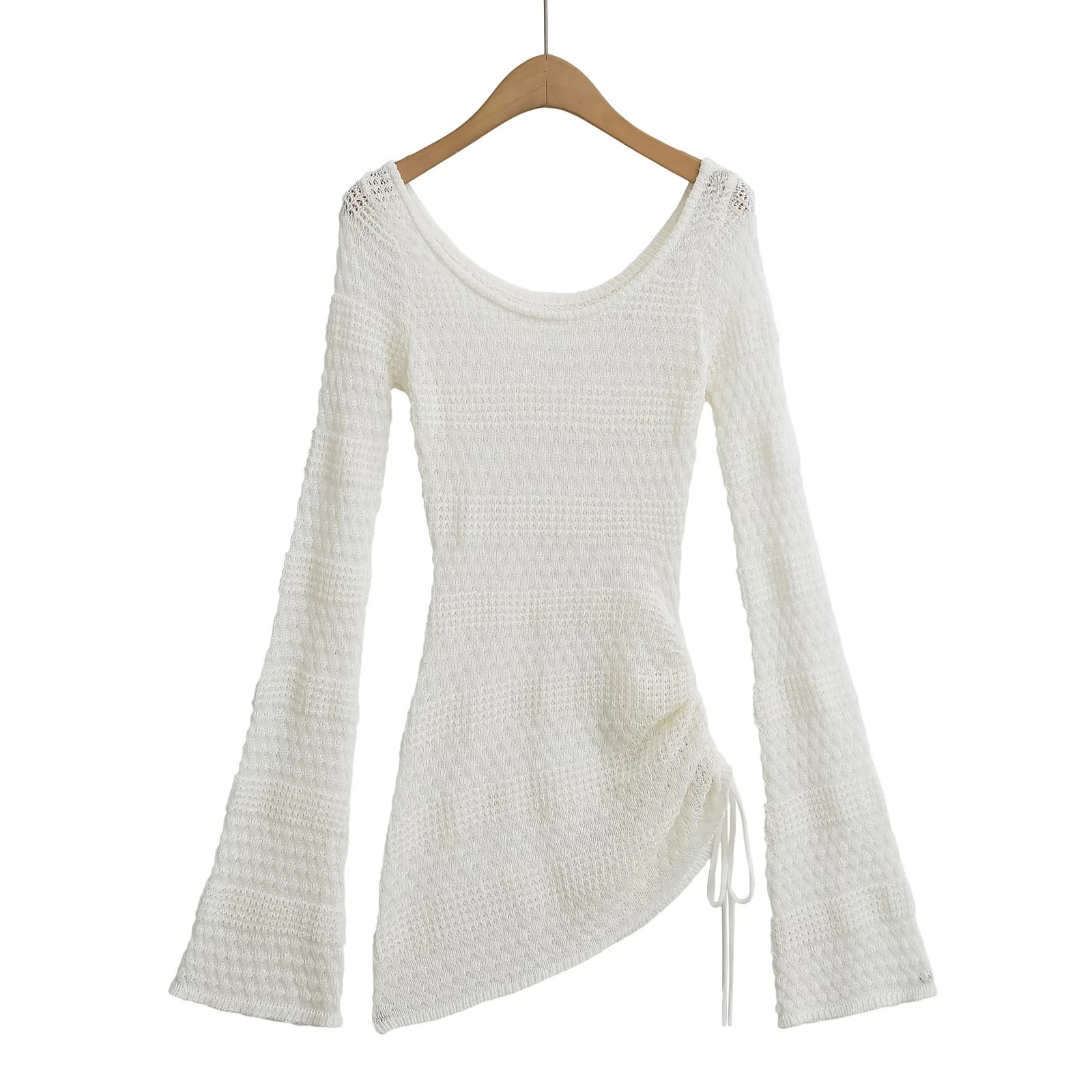 가을 2024 새로운 스파이스 걸스 게으른 스타일 둥근 목 할로우 뿔 슬리브 니트 스웨터 여성용 타이트 허리 니트 블라우스 탑