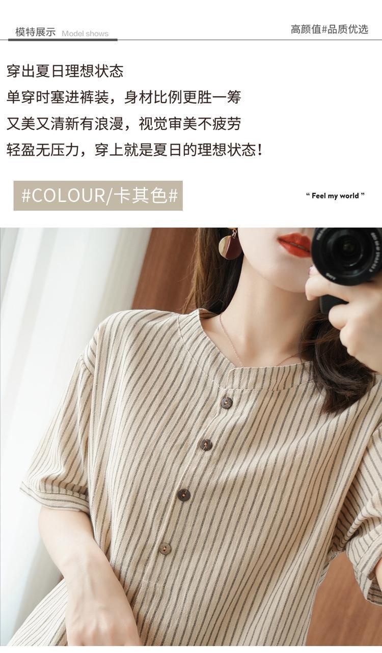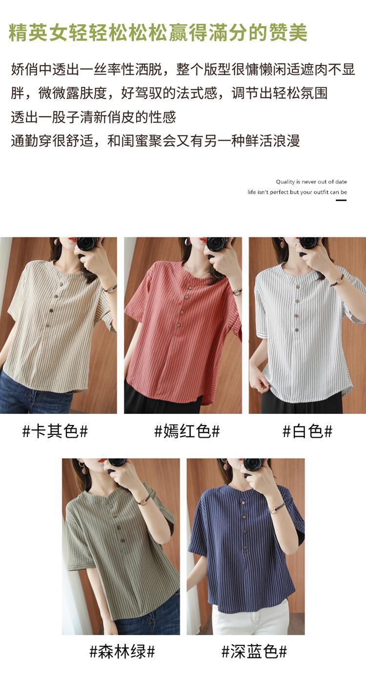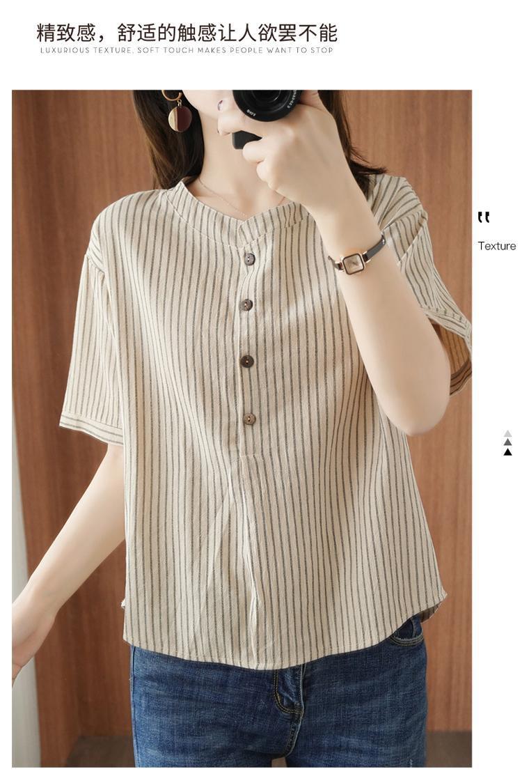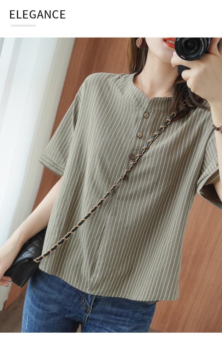 2025 새로운 면화 반팔 티셔츠 여성 세로 줄무늬 모조 면화와 린넨 탑 여름 느슨한 슬리밍 반팔 셔츠