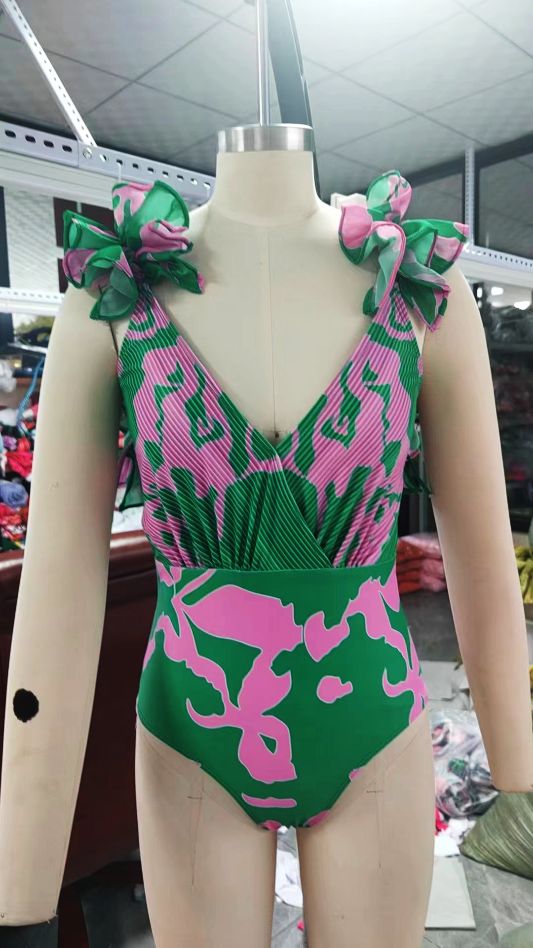 유럽과 미국의 깊은 V-넥 수영복 여성의 아마존 AliExpress Pleated 인쇄 된 육체 커버 슬리밍 섹시한 수영복