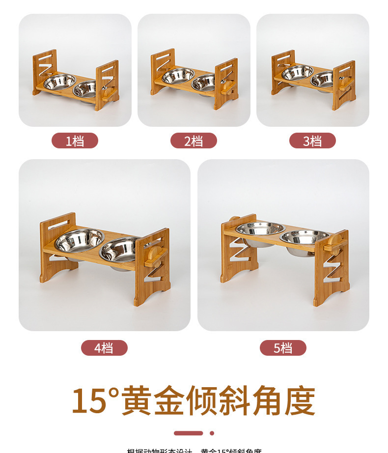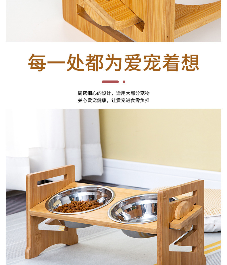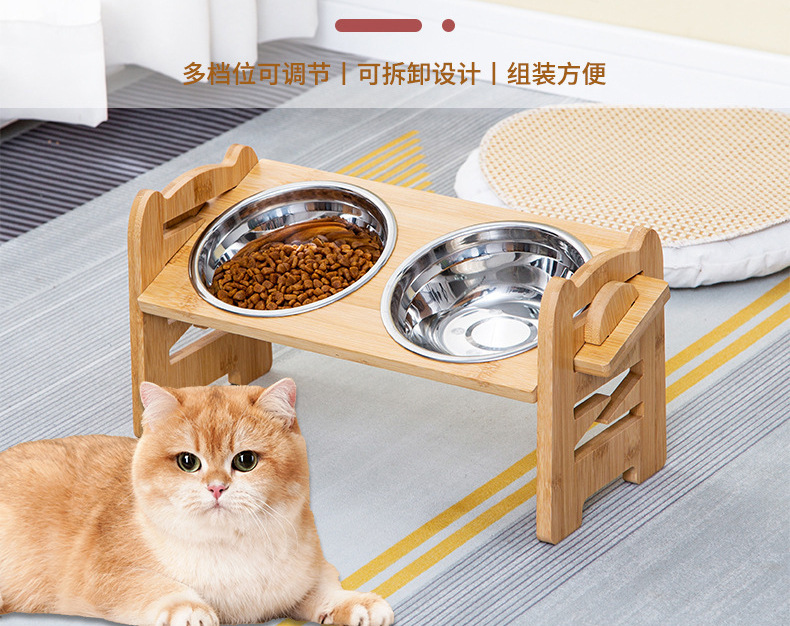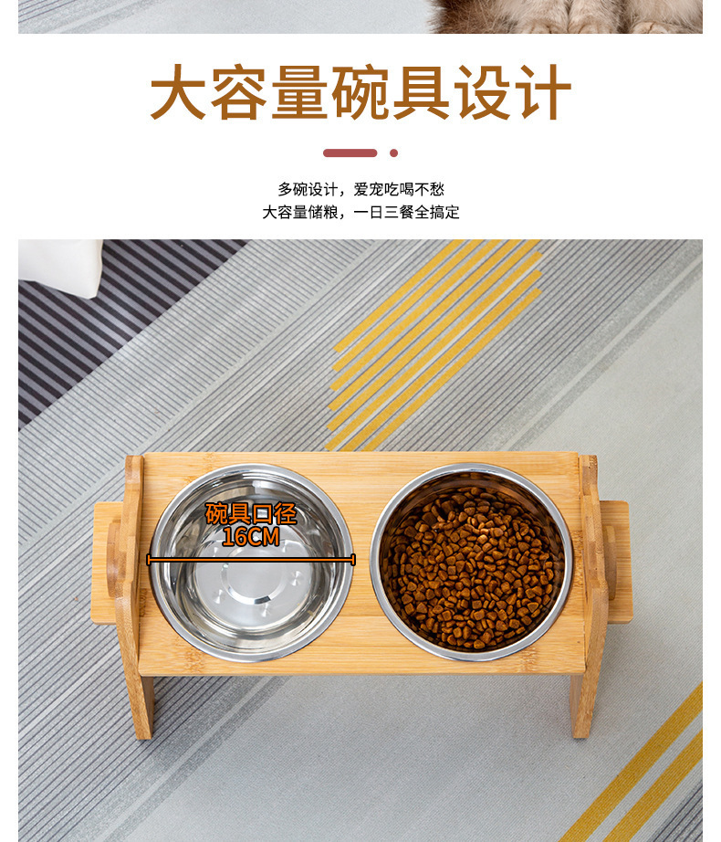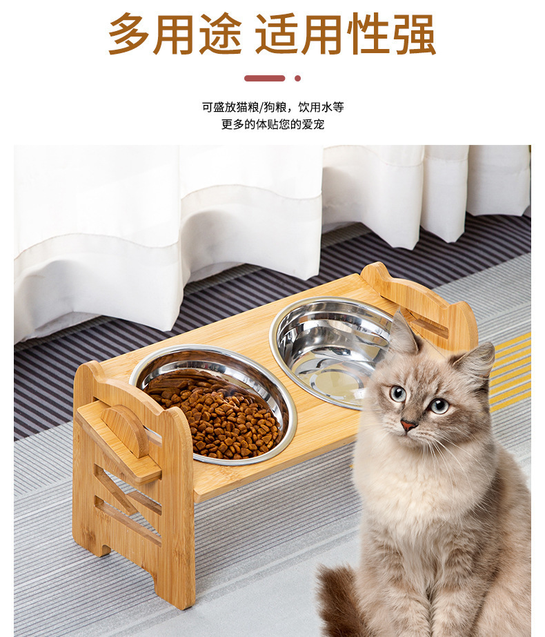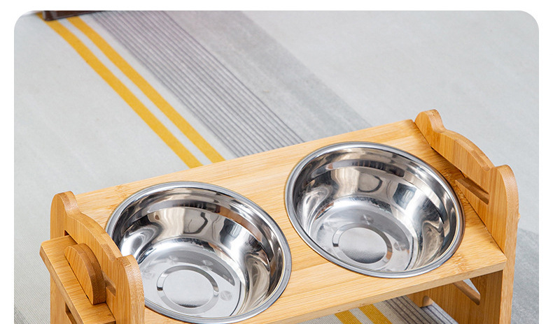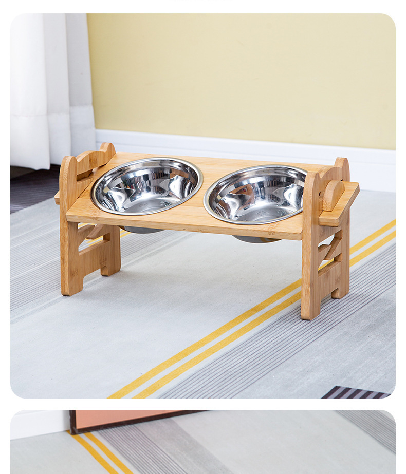 대나무 나무 애완 동물 개 음식 더블 그릇 홀더 먹이 랙 고양이 그릇 랙 피더 애완 동물 그릇 스테인리스 식탁스토어 가기
