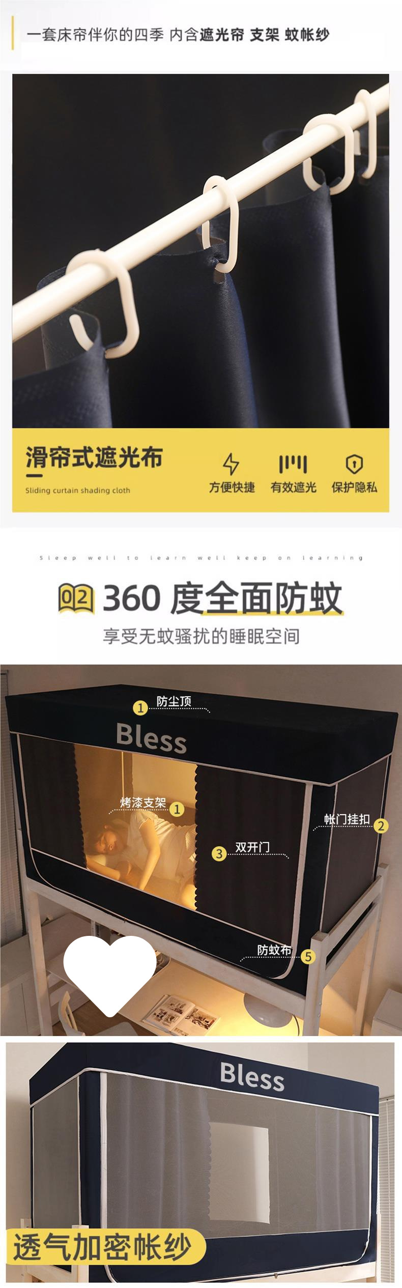 강한 음영 대학 학생 기숙사 모기장 커튼 통합 2024 기숙사 단일 상하 벤트 침대 커튼 상부 벤트스토어 가기