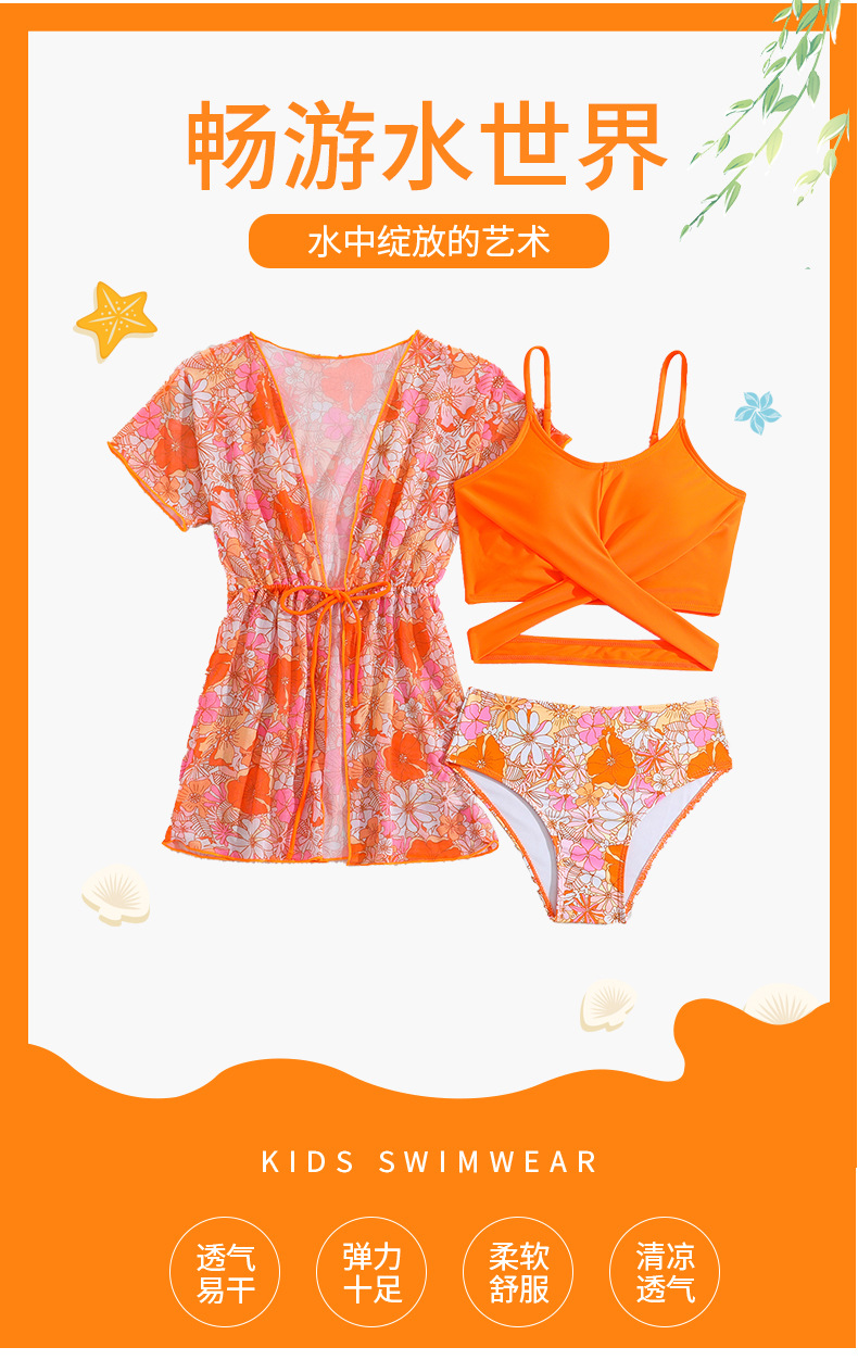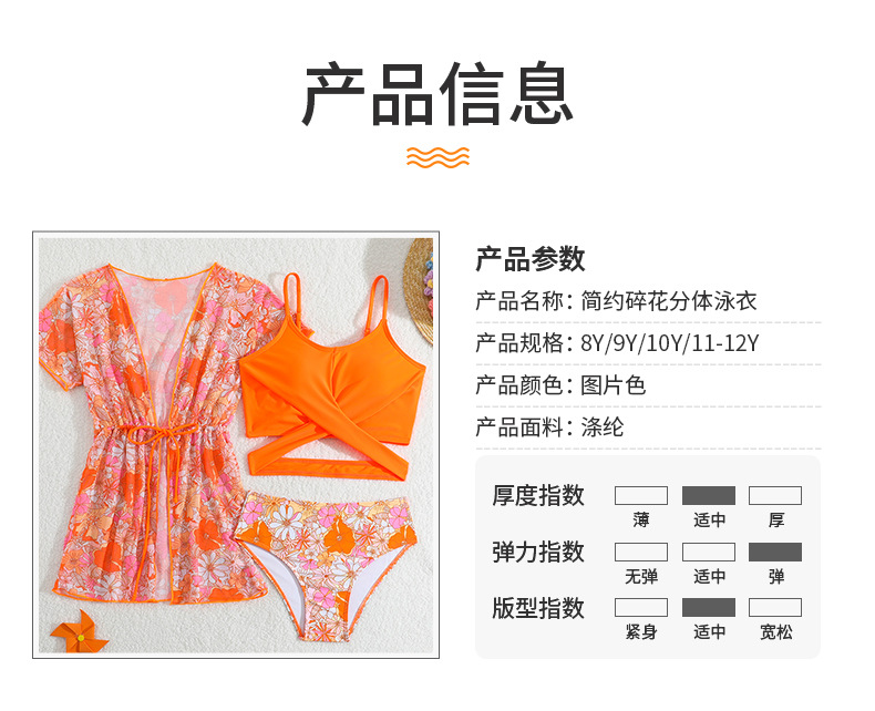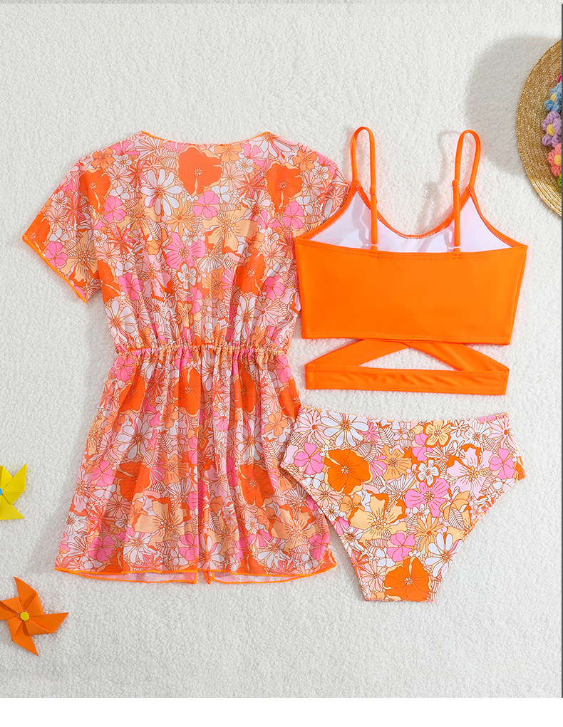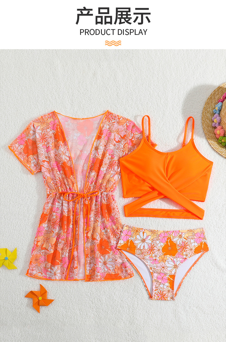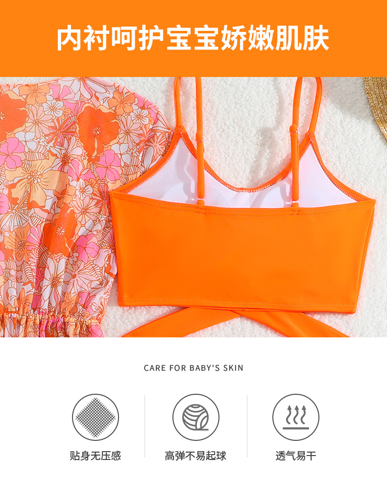 2025 새로운 어린이 수영복 3 피스 오렌지 프린트 소녀 스플릿 수영복 크로스 보드 슈트 수영복