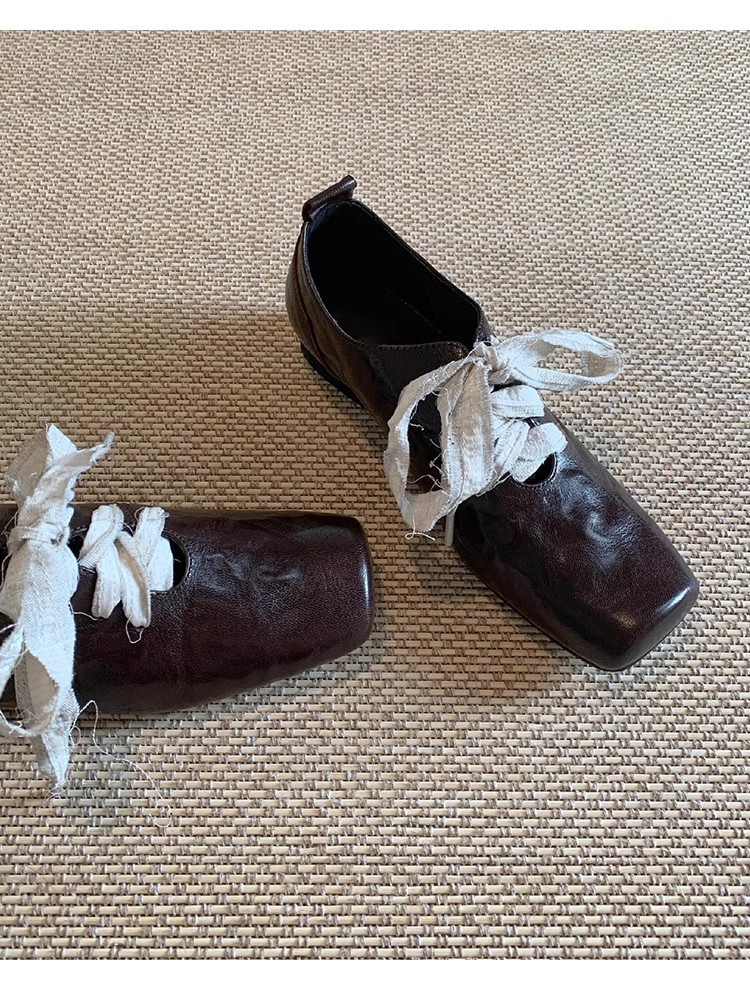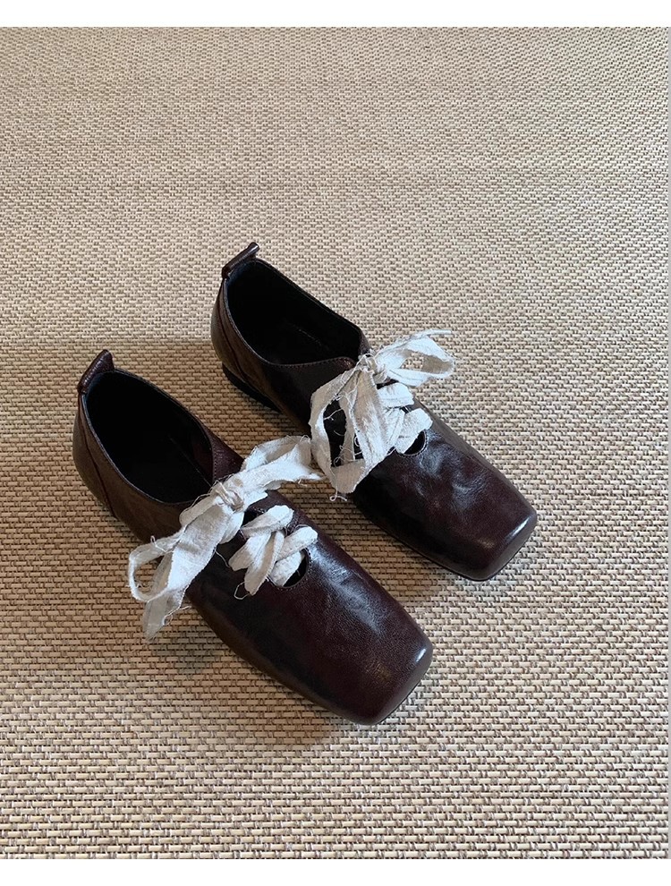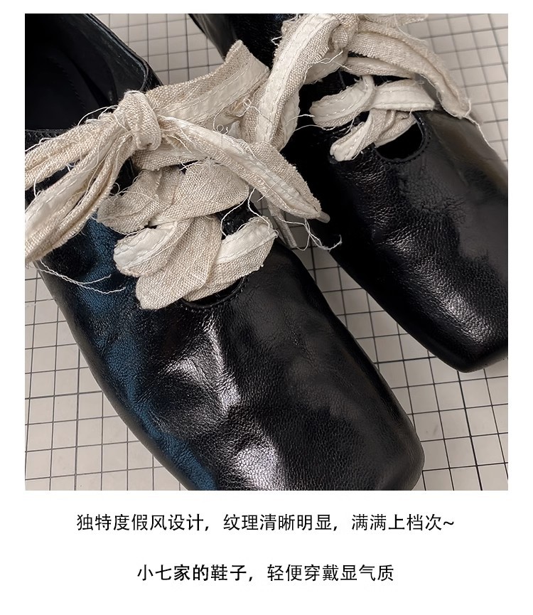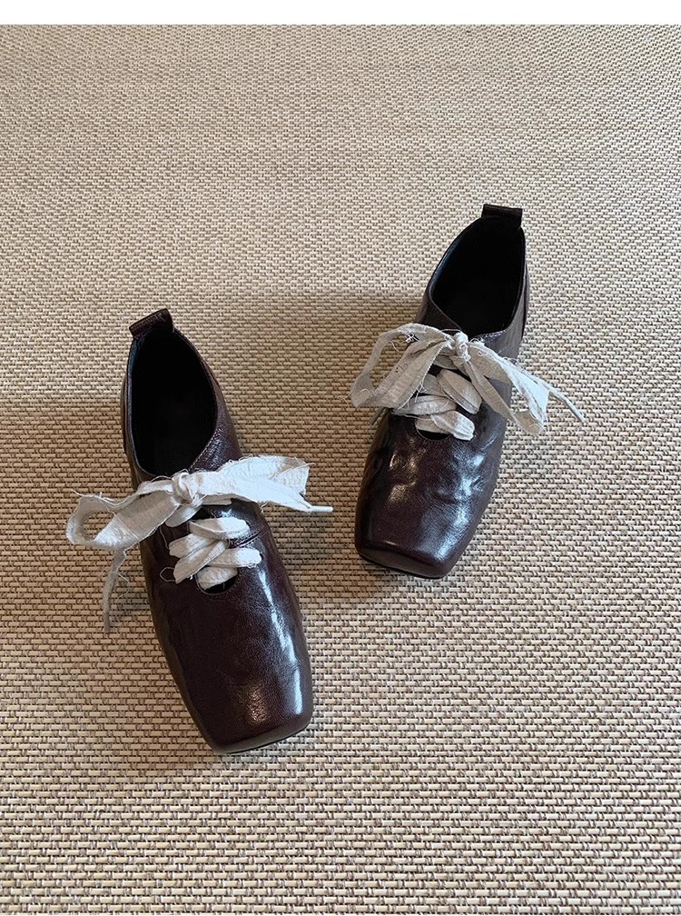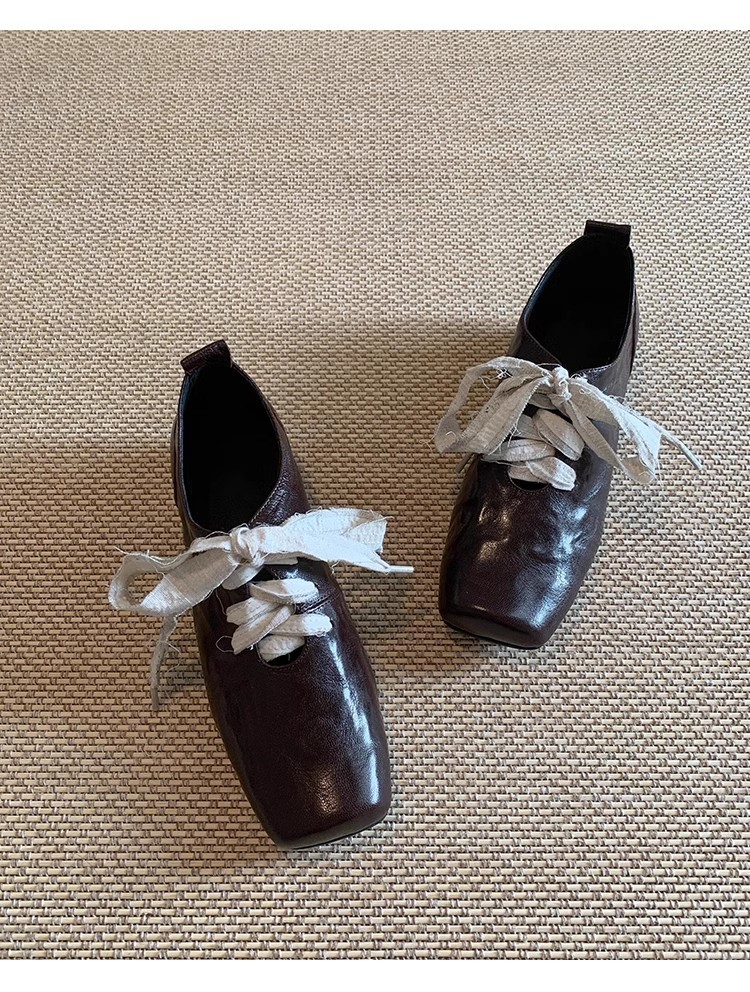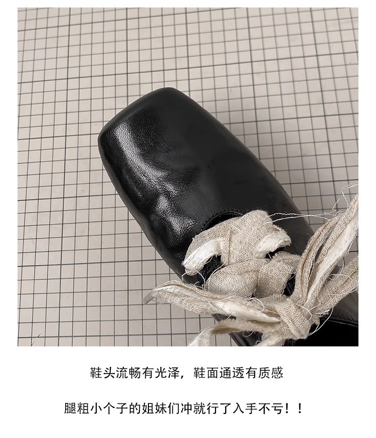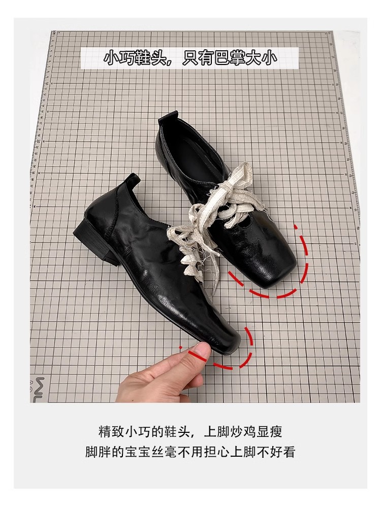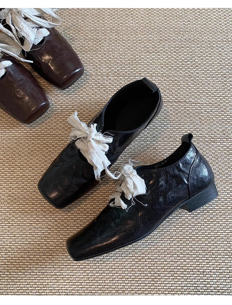 즉시 배송! 레트로 문예 스타일의 사각코 가죽 슈즈, 고급스러운 굽, 앞끈으로 묶는 발레 스타일의 다용도 여성용 신발