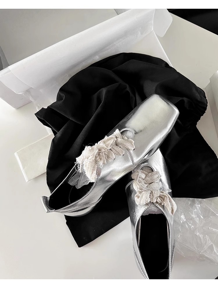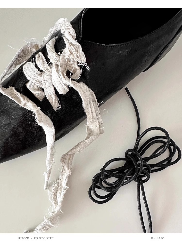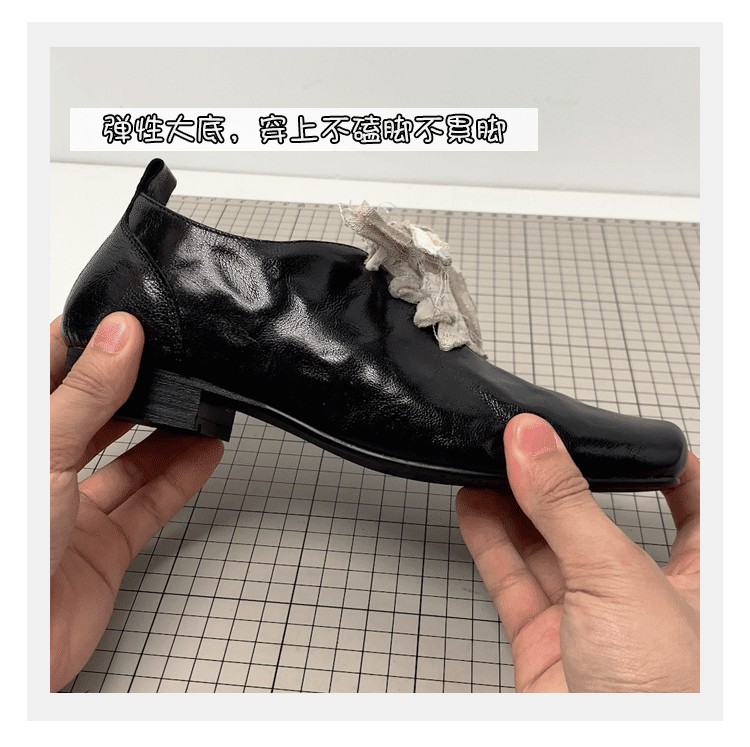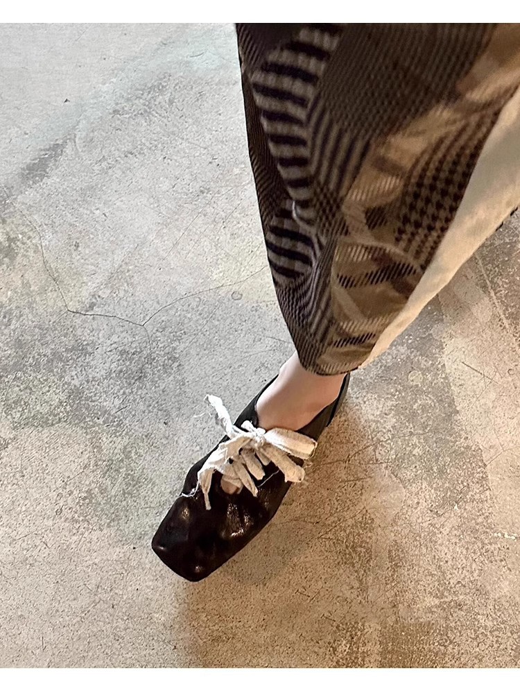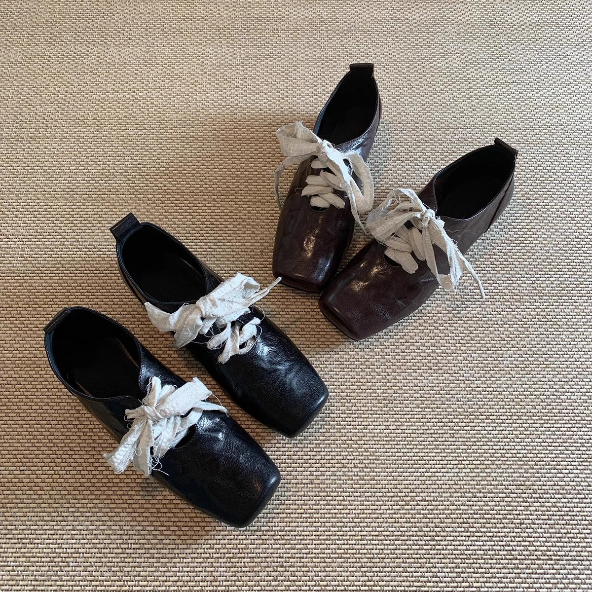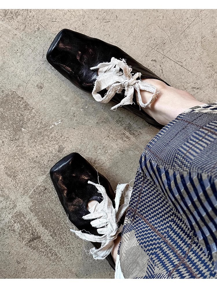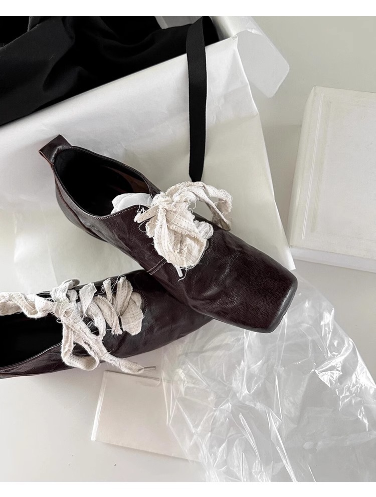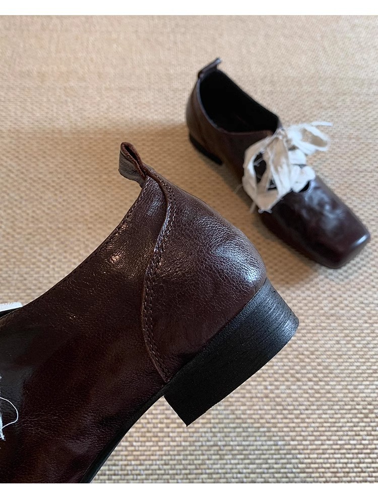 즉시 배송! 레트로 문예 스타일의 사각코 가죽 슈즈, 고급스러운 굽, 앞끈으로 묶는 발레 스타일의 다용도 여성용 신발