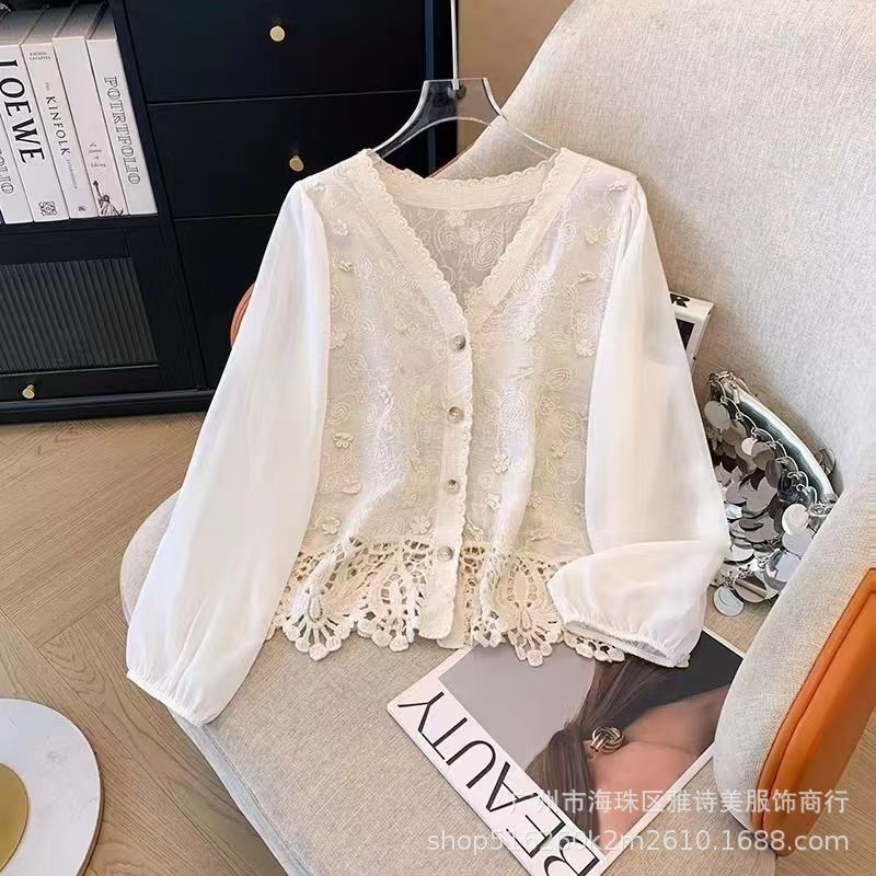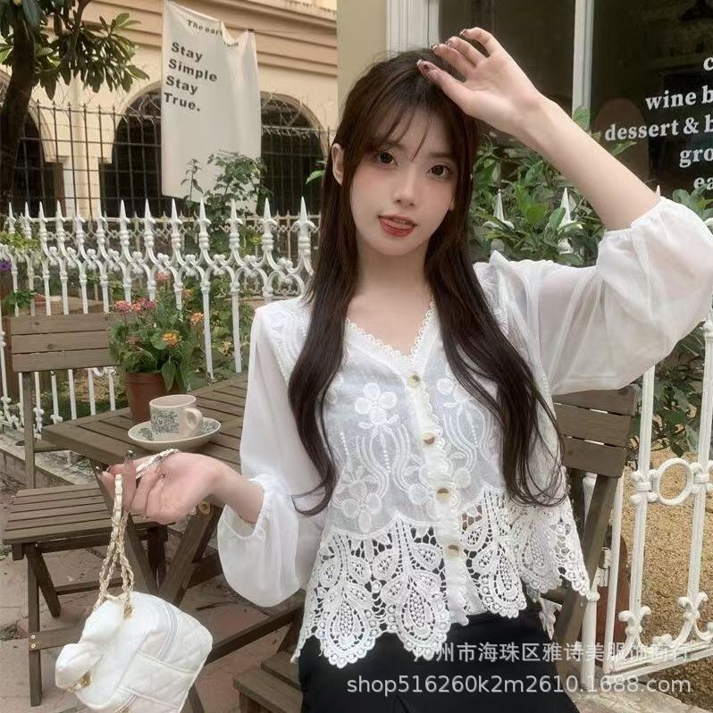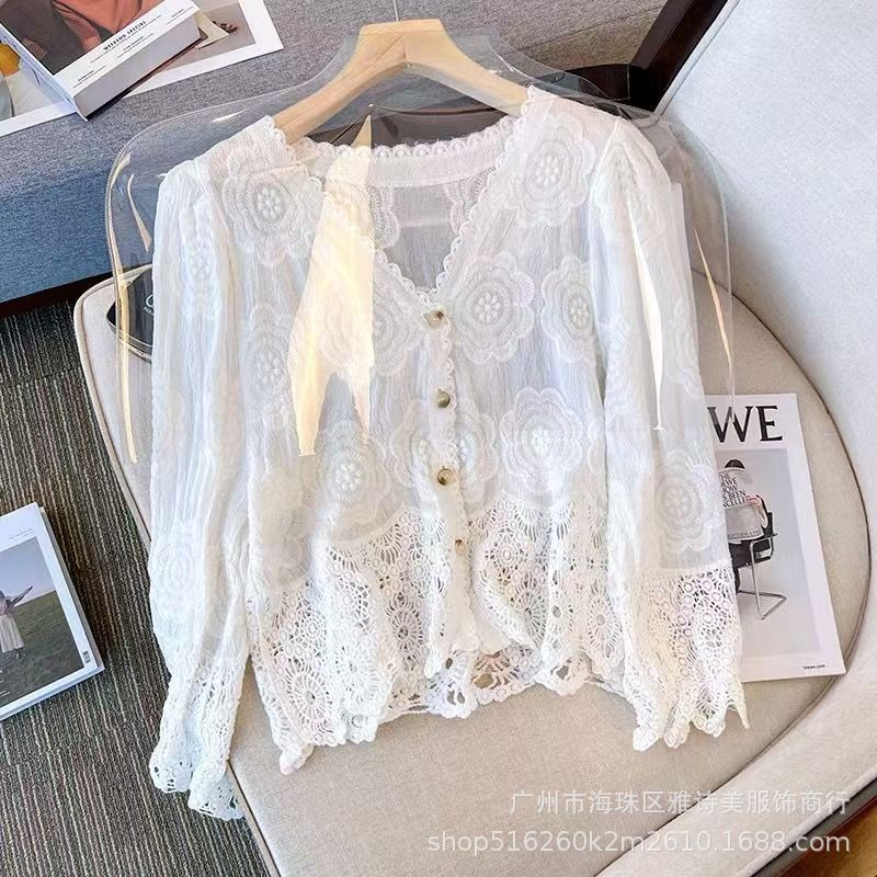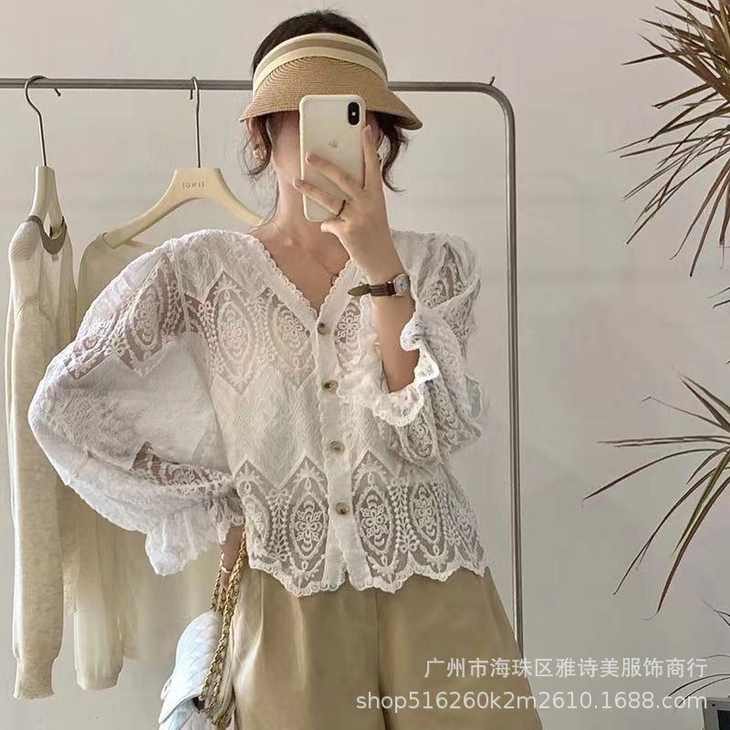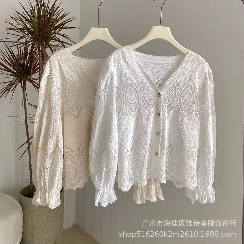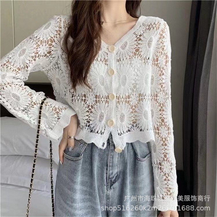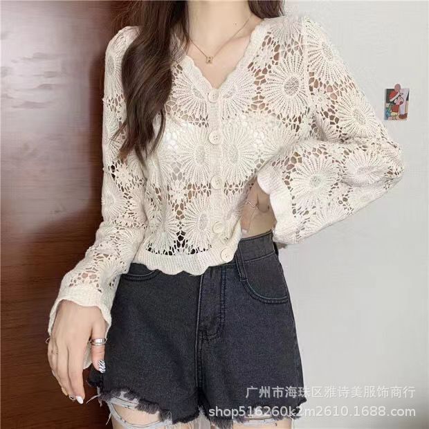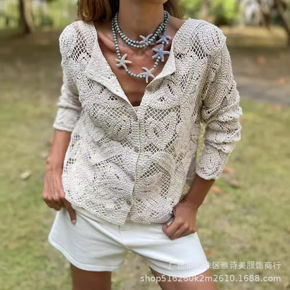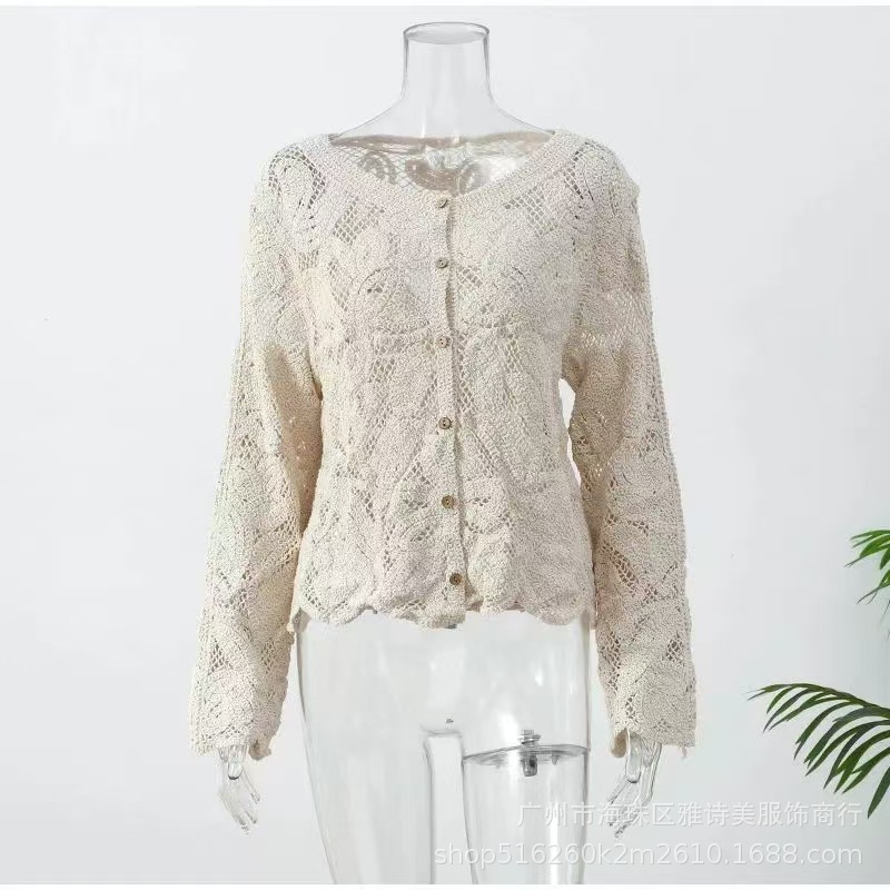 유럽과 미국 스타일의 세련된 우아한 할로우 V-넥 느슨한 스웨터 여성용 빈티지 싱글 브레스트 올 매치 긴팔 카디건 탑