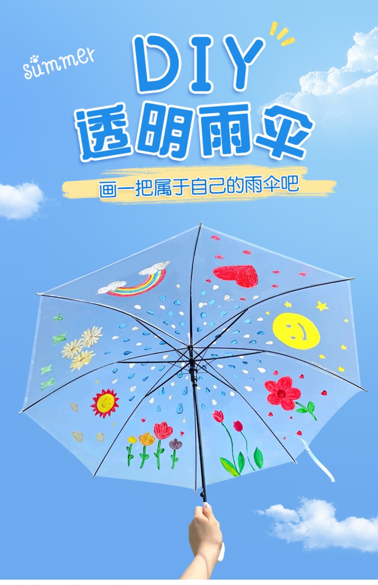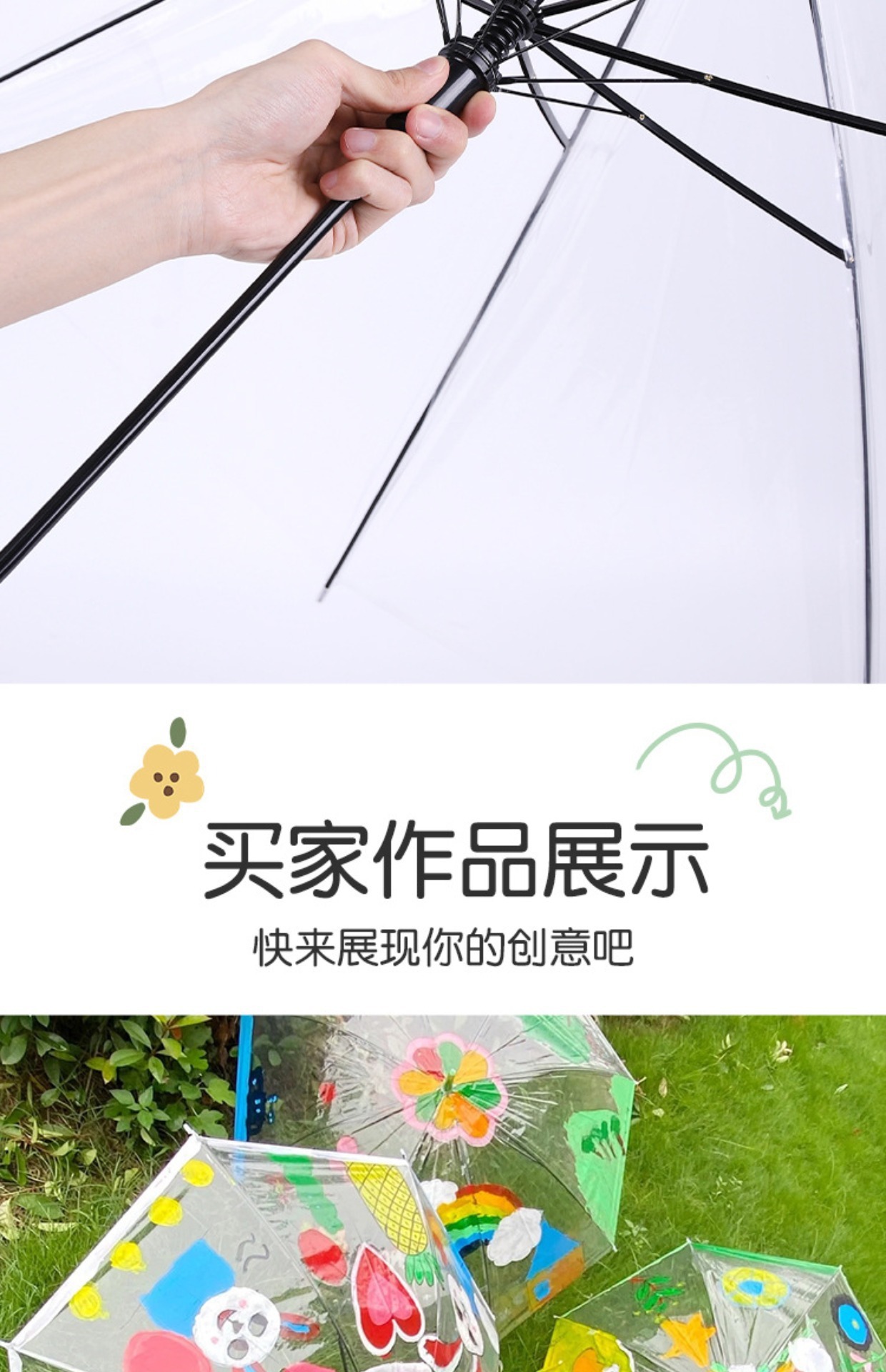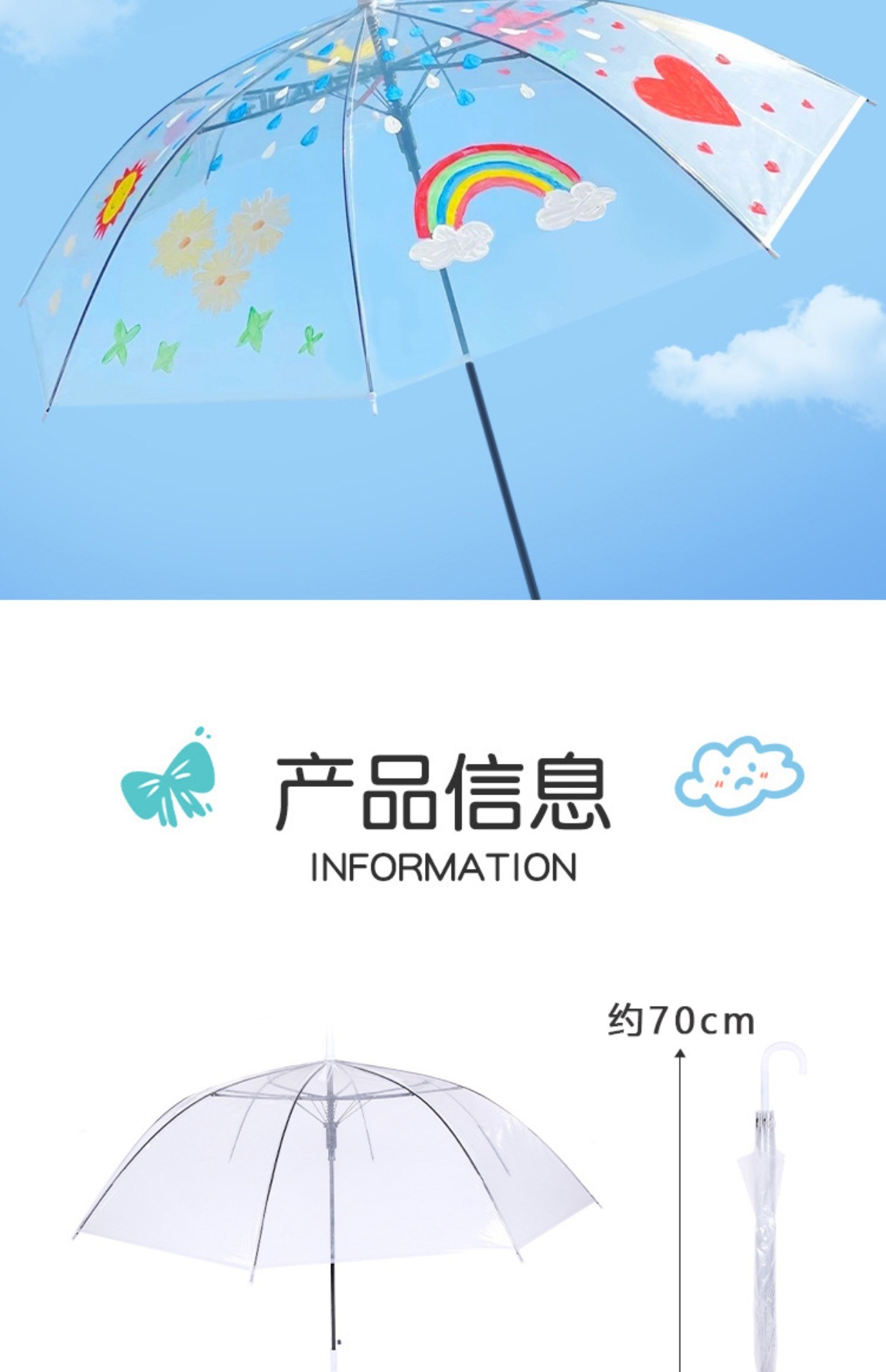 어린이 diy 그림 투명 우산 유치원 그림 창조적 인 수제 낙서 빈 손으로 그린 긴 손잡이 투명 우산