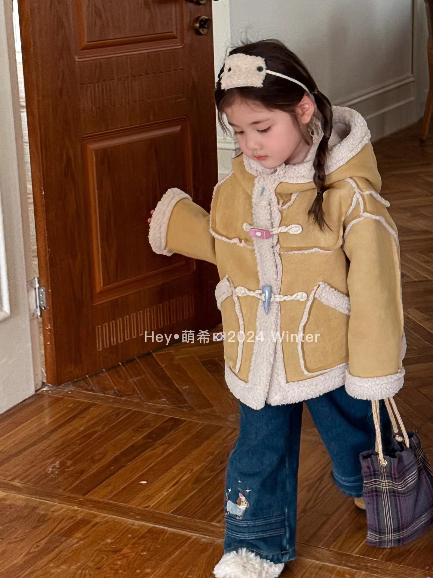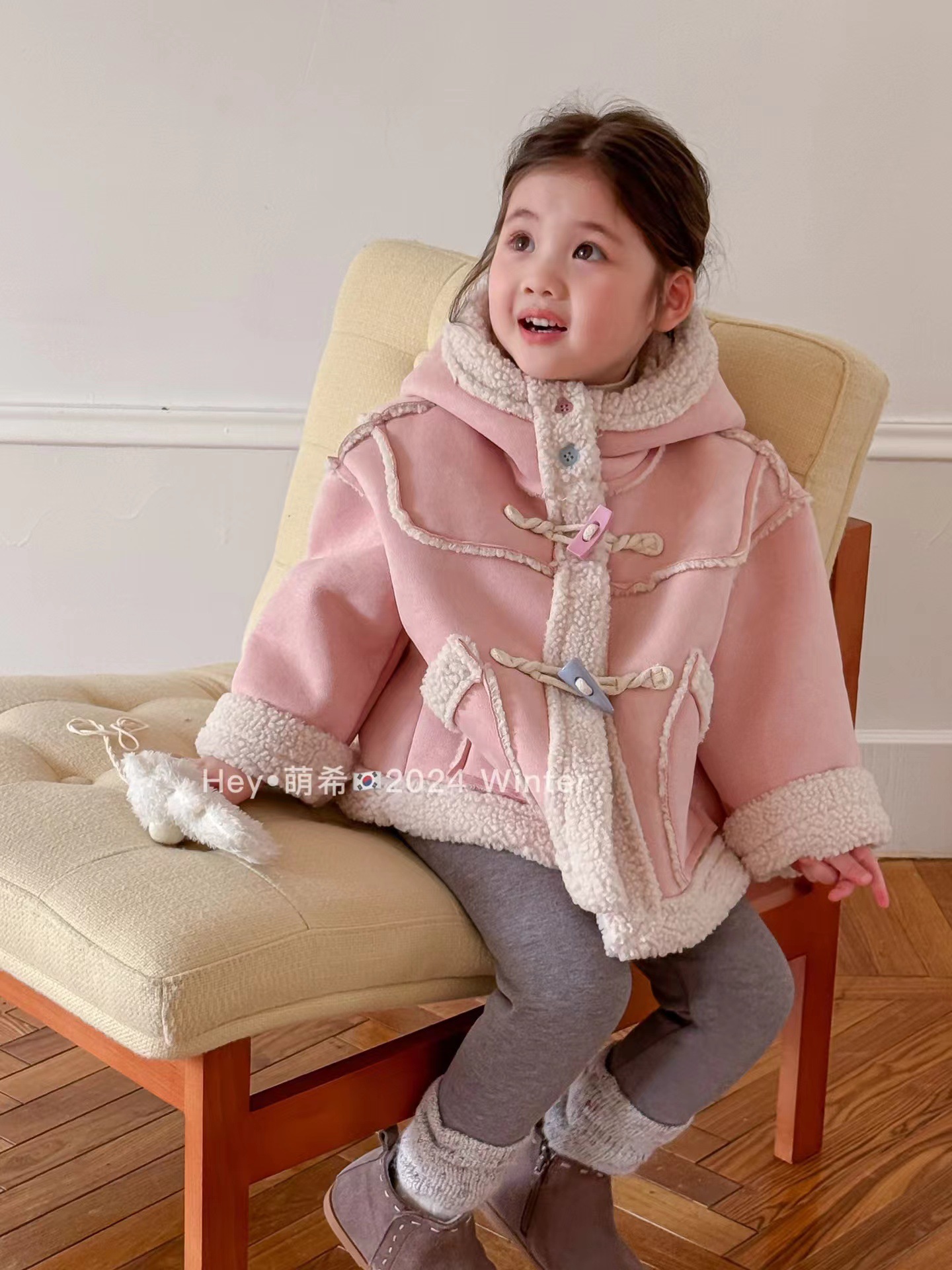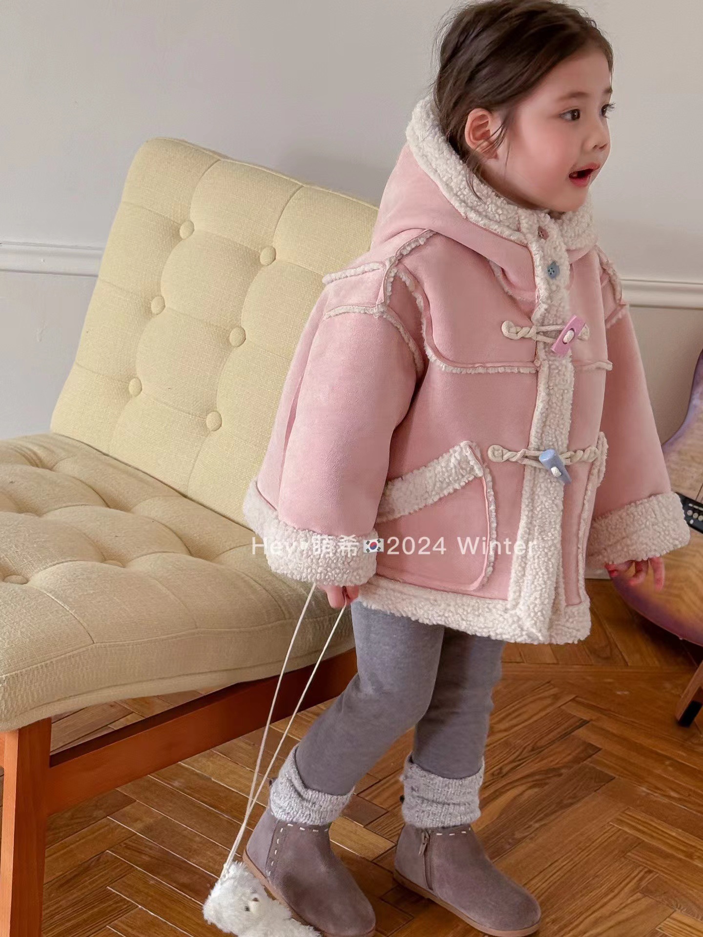 2025 새로운 가을, 겨울 의류 어린이 한국 스타일 모피 원피스 소녀 후드 코튼 자켓 플러스 벨벳 두꺼운 코트스토어 가기