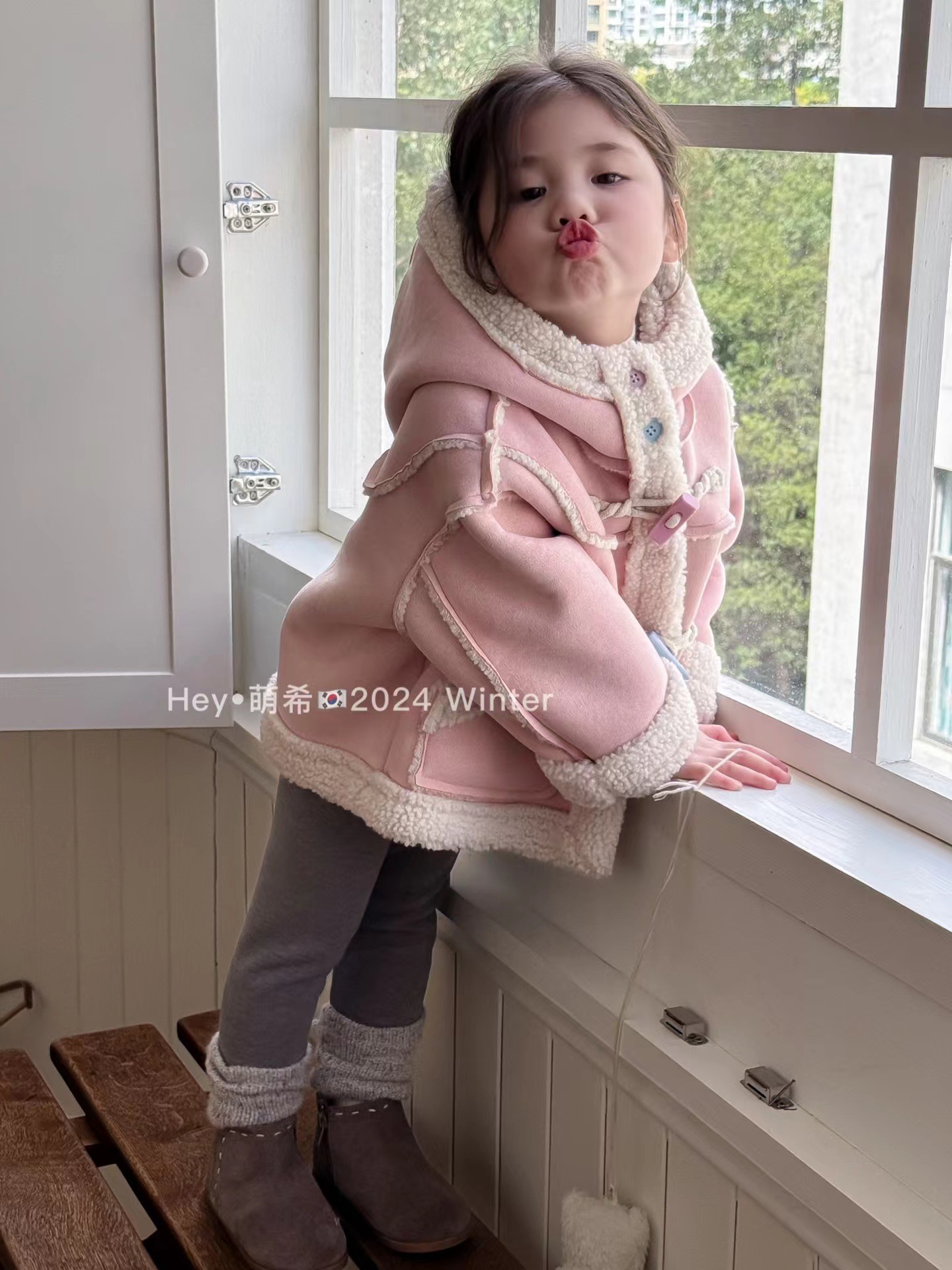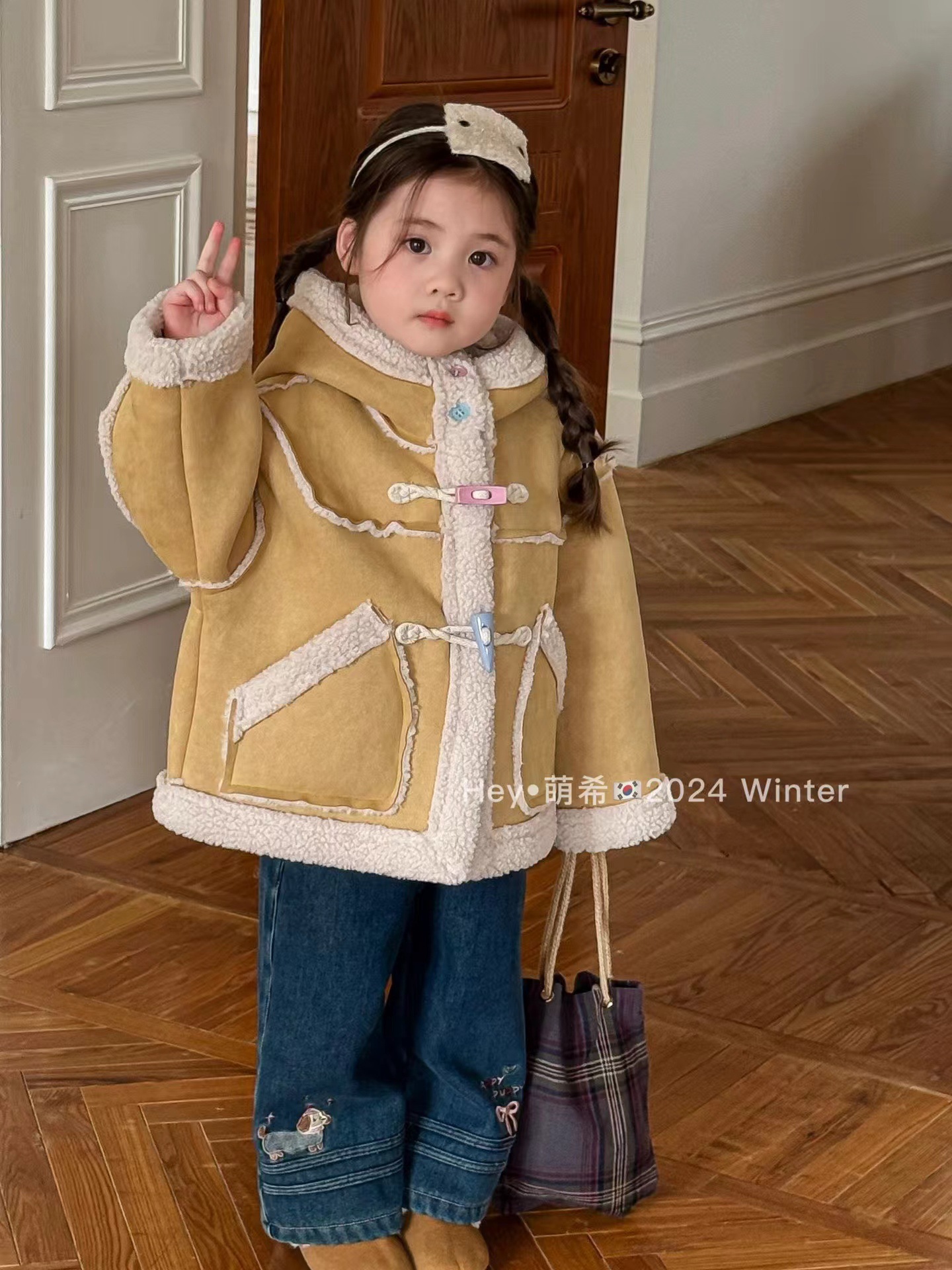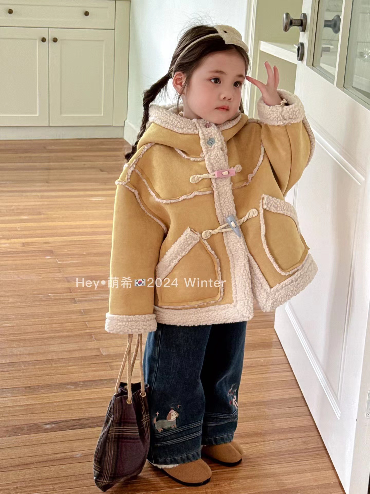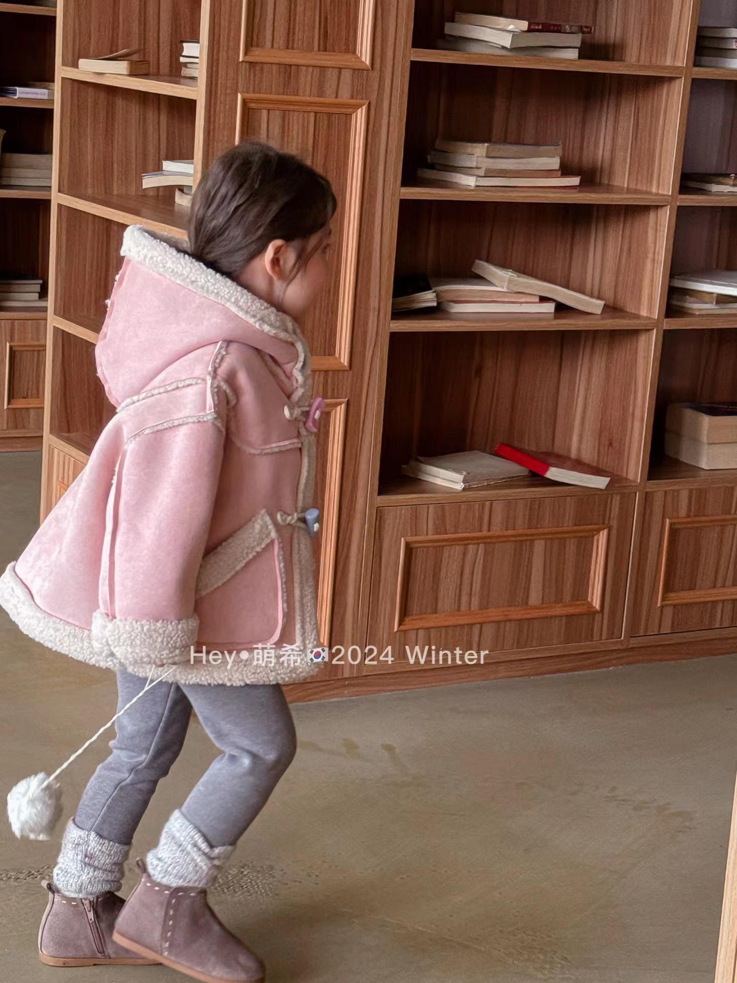 2025 새로운 가을, 겨울 의류 어린이 한국 스타일 모피 원피스 소녀 후드 코튼 자켓 플러스 벨벳 두꺼운 코트스토어 가기