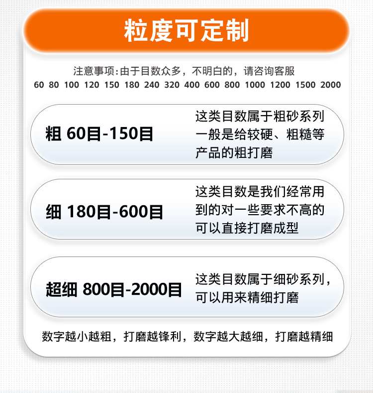 我们可以按照客户图纸或样品定制各类材质尺寸的打磨抛光产品,打样周期2-3天。还为有需要的客户提供OEM服务,包括设计独特品牌logo和包装。并持续关注客户的售后体验,让客户享受安心的产品和服务。