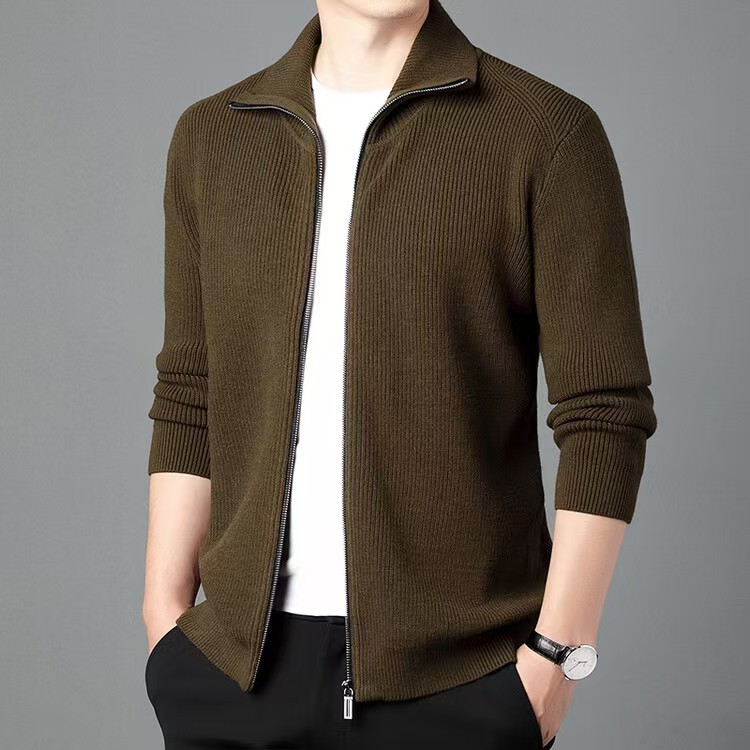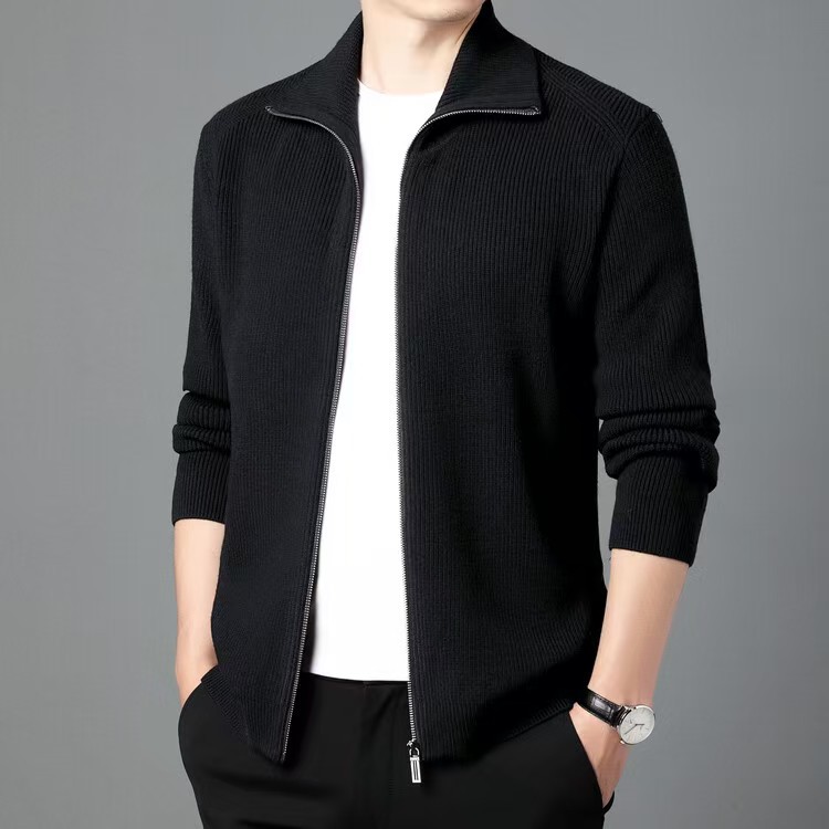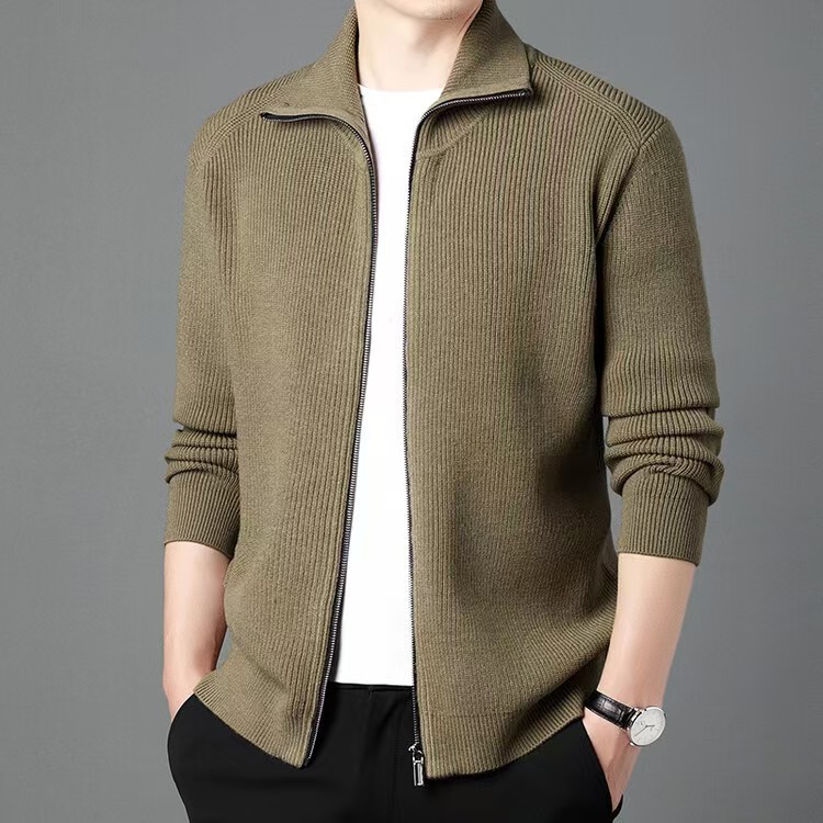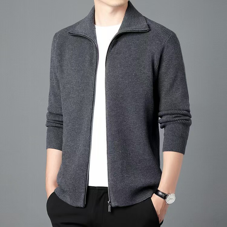 100 순수 양모 지퍼 카디건 남자 가을과 겨울 젊고 중년의 두꺼운 옷깃 세련된 니트웨어 스웨터 솔리드 컬러 재킷