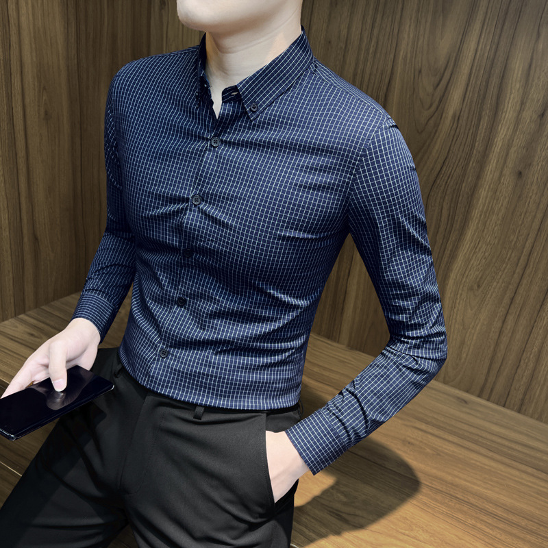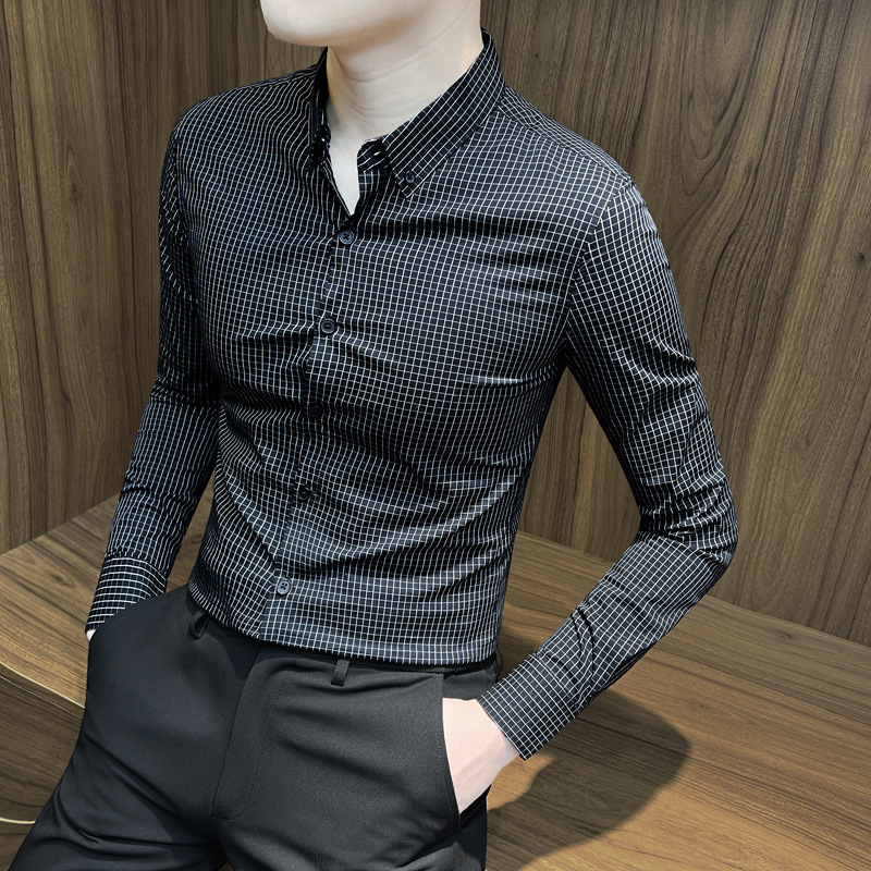 격자 무늬 남성용 셔츠 긴팔 봄과 가을 하이 엔드 느낌의 터틀넥 핸섬 셔츠 비즈니스 슬림 핏 캐주얼 2024 새 셔츠
