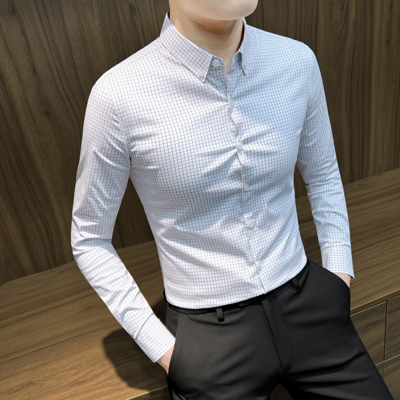 격자 무늬 남성용 셔츠 긴팔 봄과 가을 하이 엔드 느낌의 터틀넥 핸섬 셔츠 비즈니스 슬림 핏 캐주얼 2024 새 셔츠스토어 가기