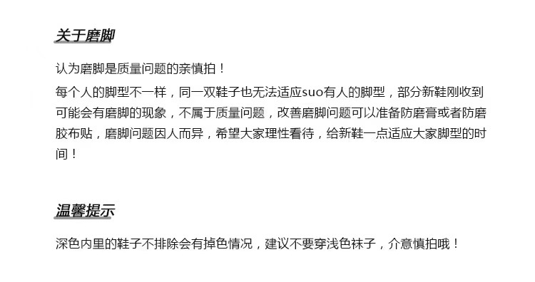 [关于售后]1鞋子出现任何问题均需第一时间联系客服,说明情况,签收超过48小时不反馈质量问题视为验收无问题。