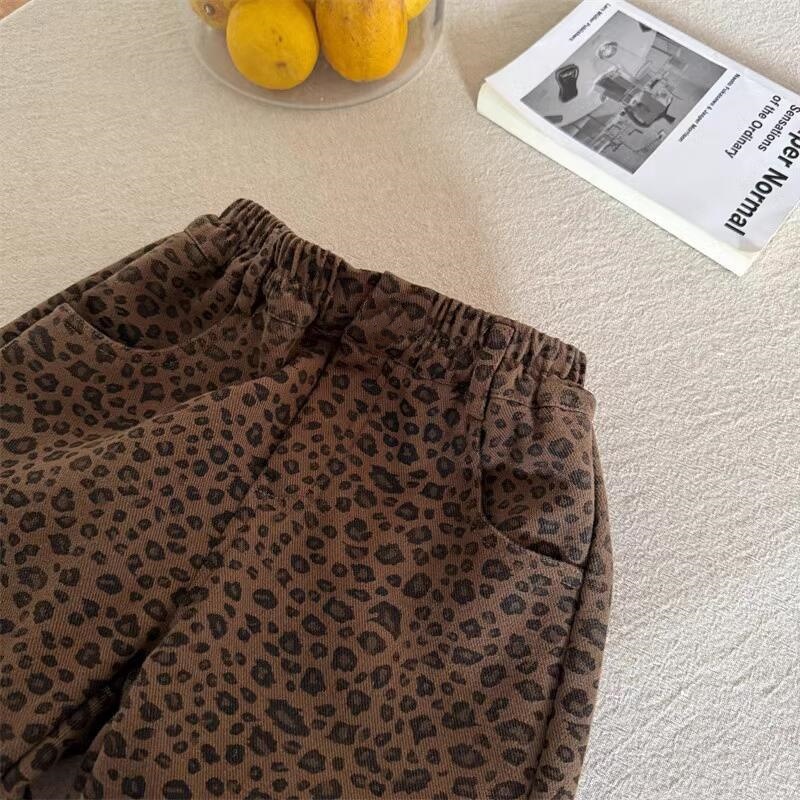 스위트 샤오시 아동용 긴바지 2025 겨울 신상 남녀 아동용 레오파드 프린트 플리스 캐주얼 팬츠 유아용 일체형 플리스 스트레이트 팬츠