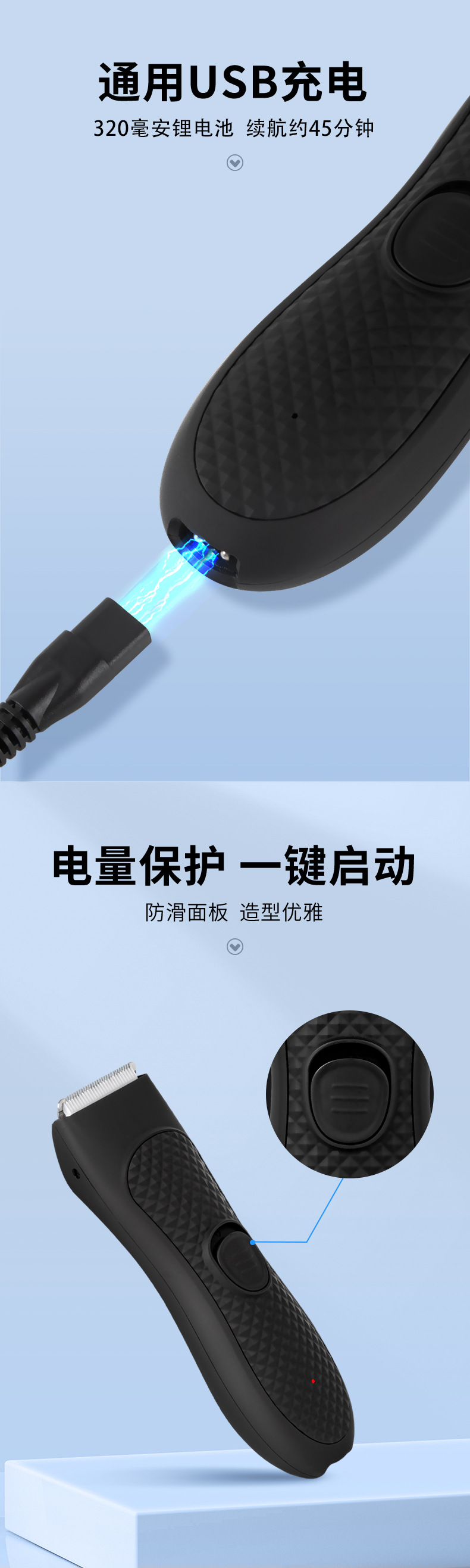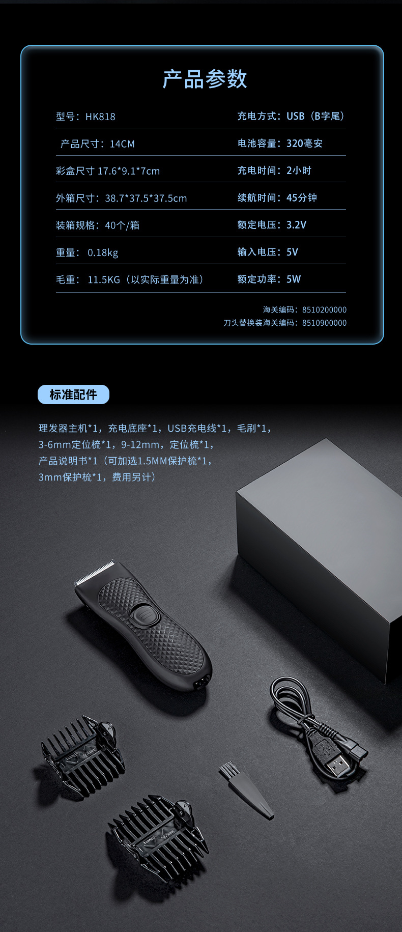 产品配件:主机*1,3-6mm限位梳*1、9-12限位梳*1,USB充电线*1,毛刷*1、产品说明书*1