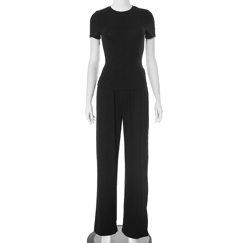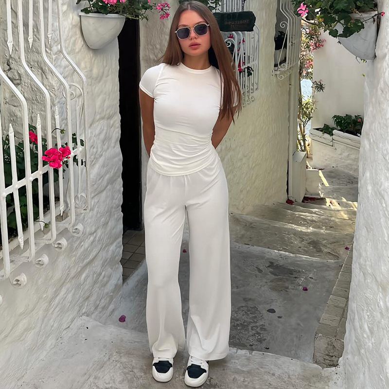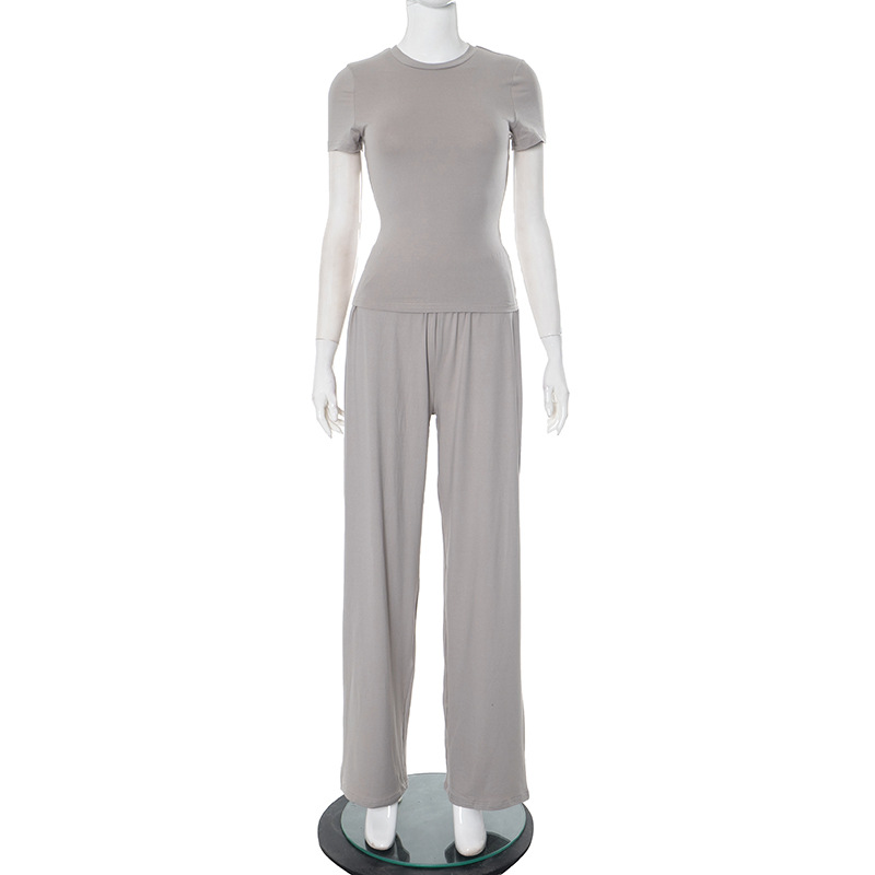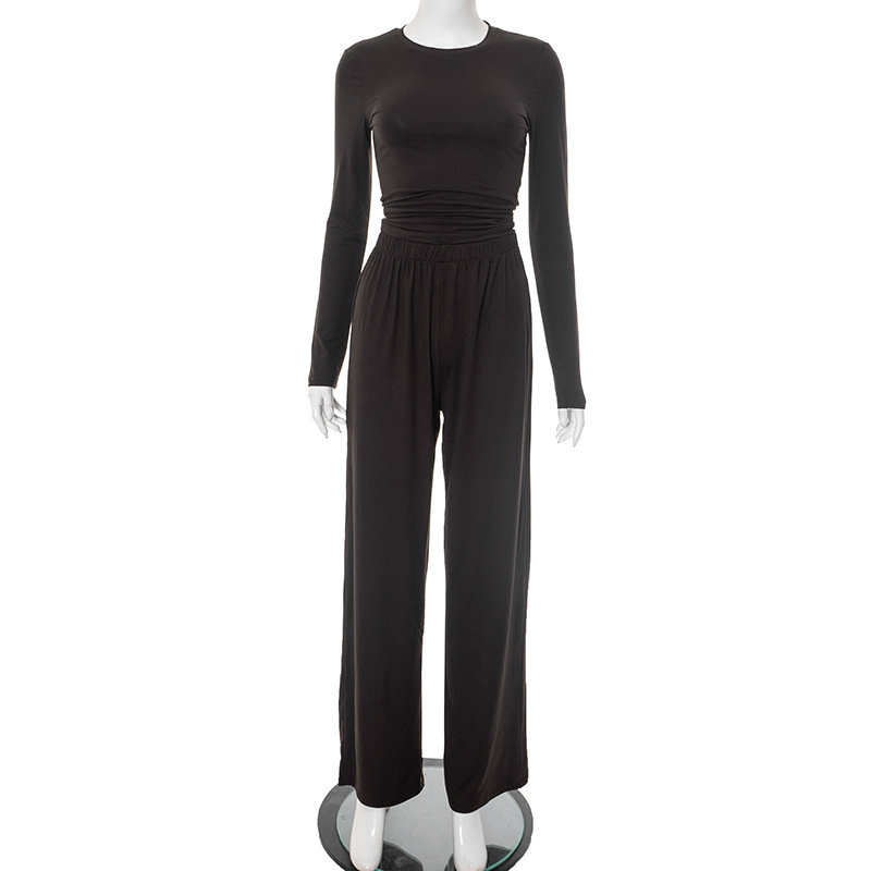 Y24ST593 유럽과 미국 국경 간 여성 봄과 가을 새로운 캐주얼 단색 둥근 목 긴 소매 기본 넓은 다리 바지 세트
